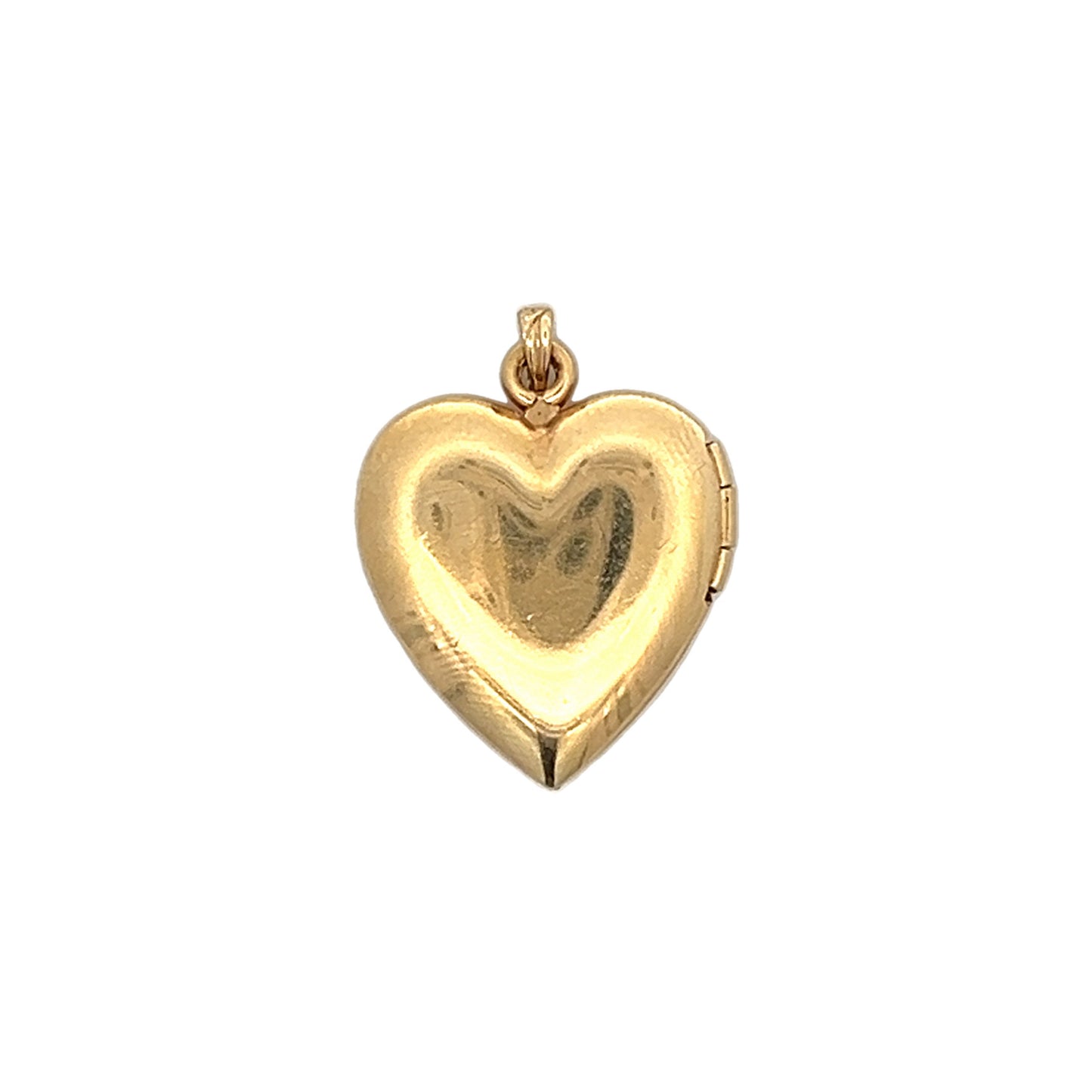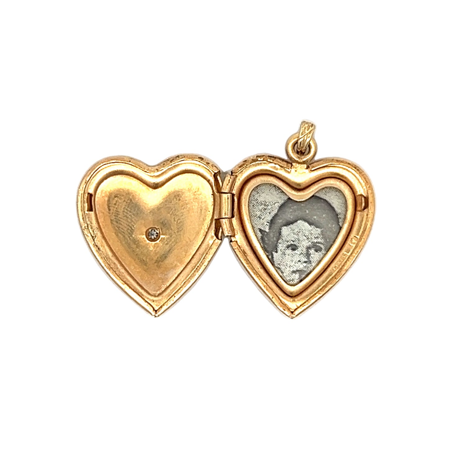 Relive the charm of the Victorian era with this heart-shaped locket pendant. Crafted from 14 karat yellow gold, this antique locket opens to hold a cherished memento, making it a perfect keepsake for treasured memories. At the center of the locket is a single cut diamond, flush set to highlight its natural beauty and a hint of sparkle.