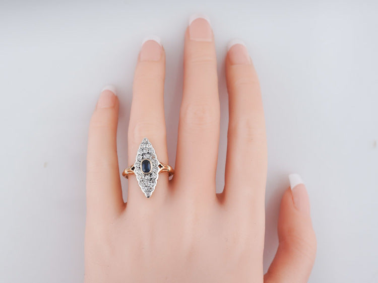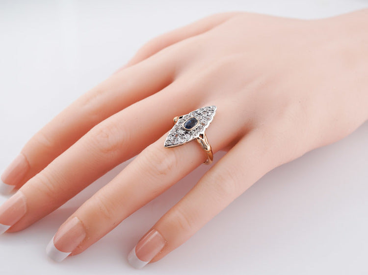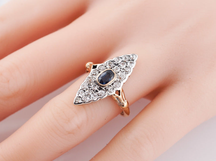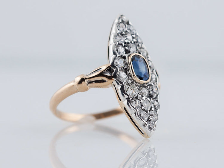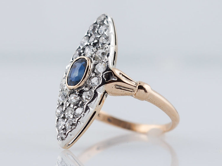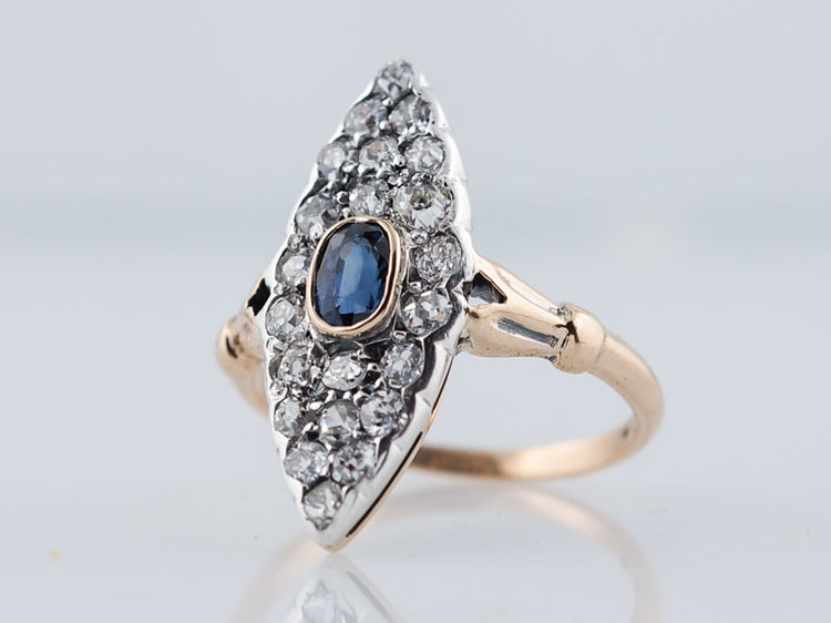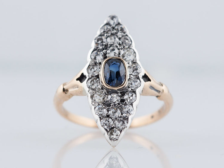 This original antique Victorian navette ring features a .37 carat natural blue sapphire and twenty-two (22) old mine cut diamonds. The sapphire is surrounded by a bed of gorgeous diamonds with a total carat weight of 1.54. Set in 18 karat yellow gold and silver, this gorgeous ring is a wonderful example of Victorian style.