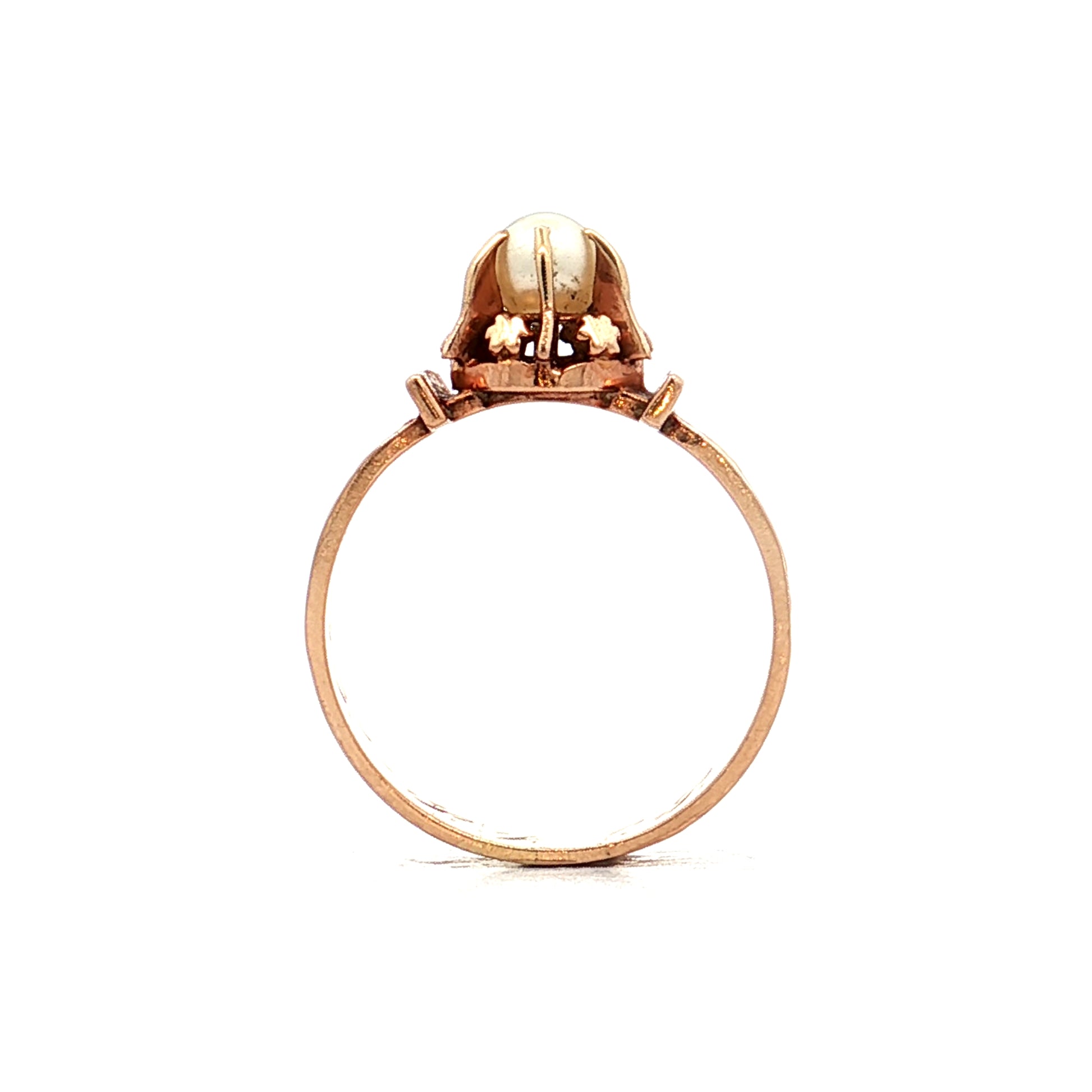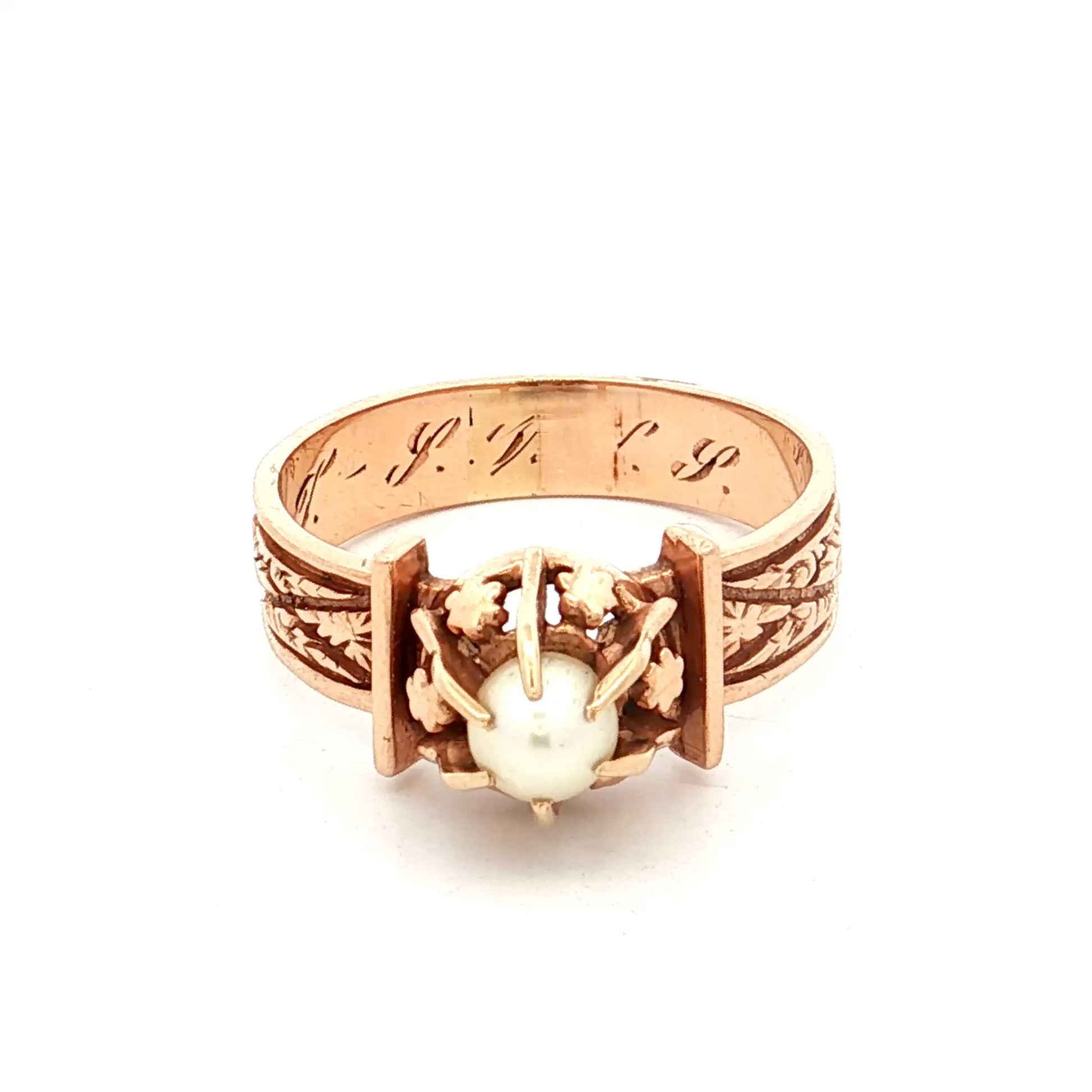 This Victorian era cocktail ring features a 4.5 mm pearl prong-set in 14 karat rose gold. The band displays intricate engraving throughout, with detailed scrollwork and patterns that reflect the ornate metalwork typical of Victorian jewelry from the mid-to-late 1800s. The rose gold setting frames the pearl at the center. The engraved details wrap around the entire band, creating depth and dimension.