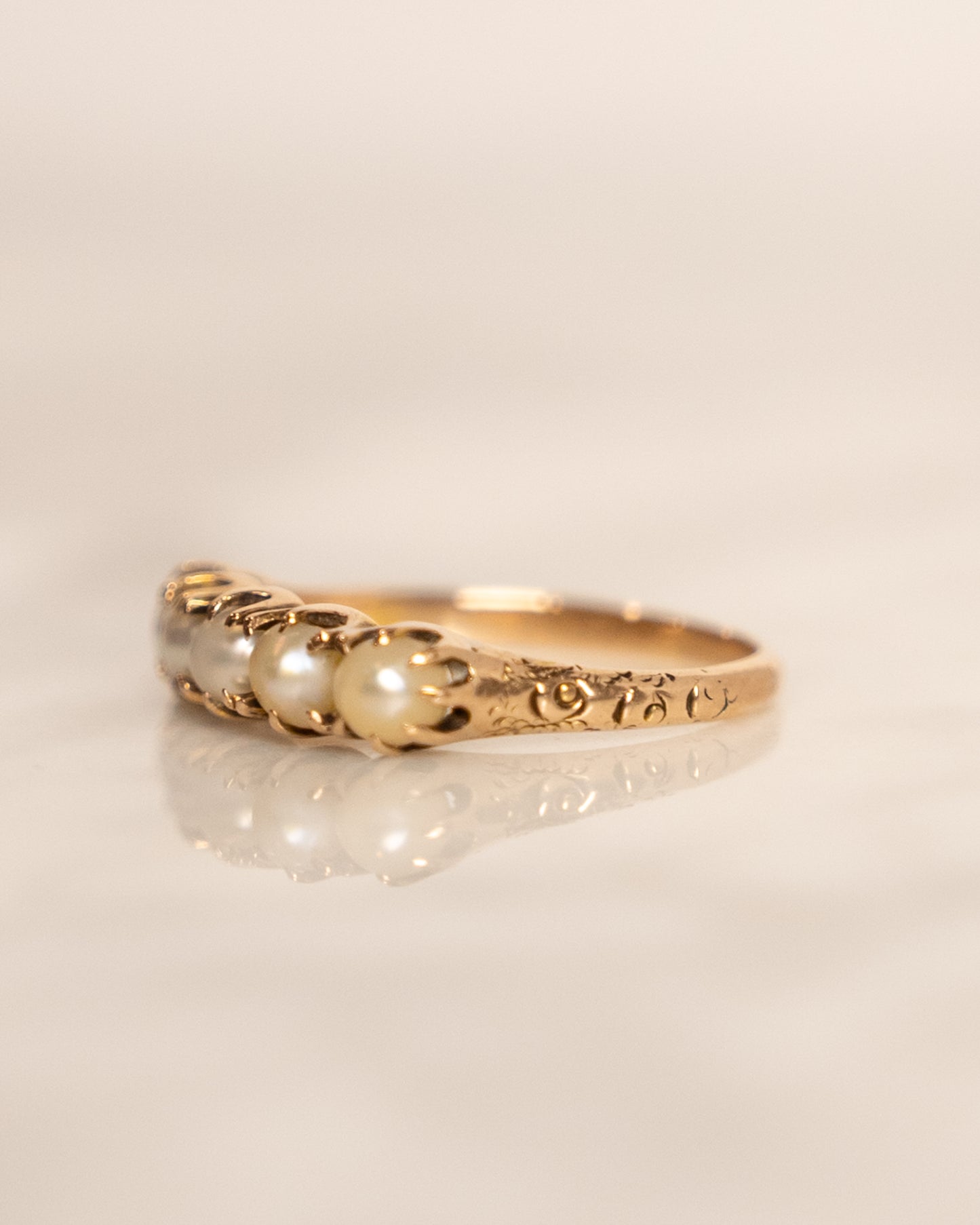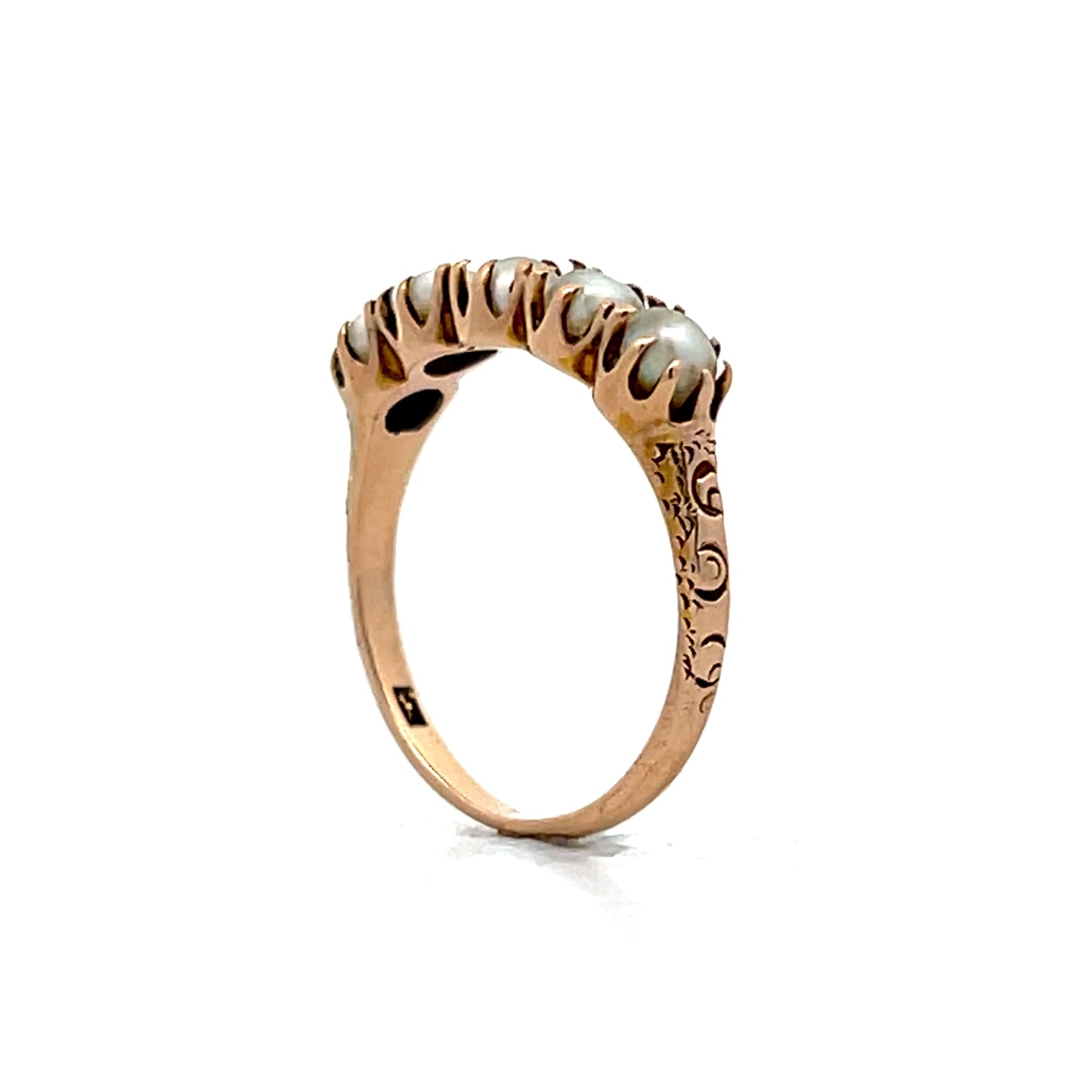 This Victorian-era ring has five pearls set in prongs along a 14 karat yellow gold band. Pearls are known for their calming properties and are often associated with wisdom, giving this ring both beauty and meaning. The yellow gold provides a warm background that highlights the soft glow of the pearls. The ring will work well worn alone or stacked with other rings for a more layered look.