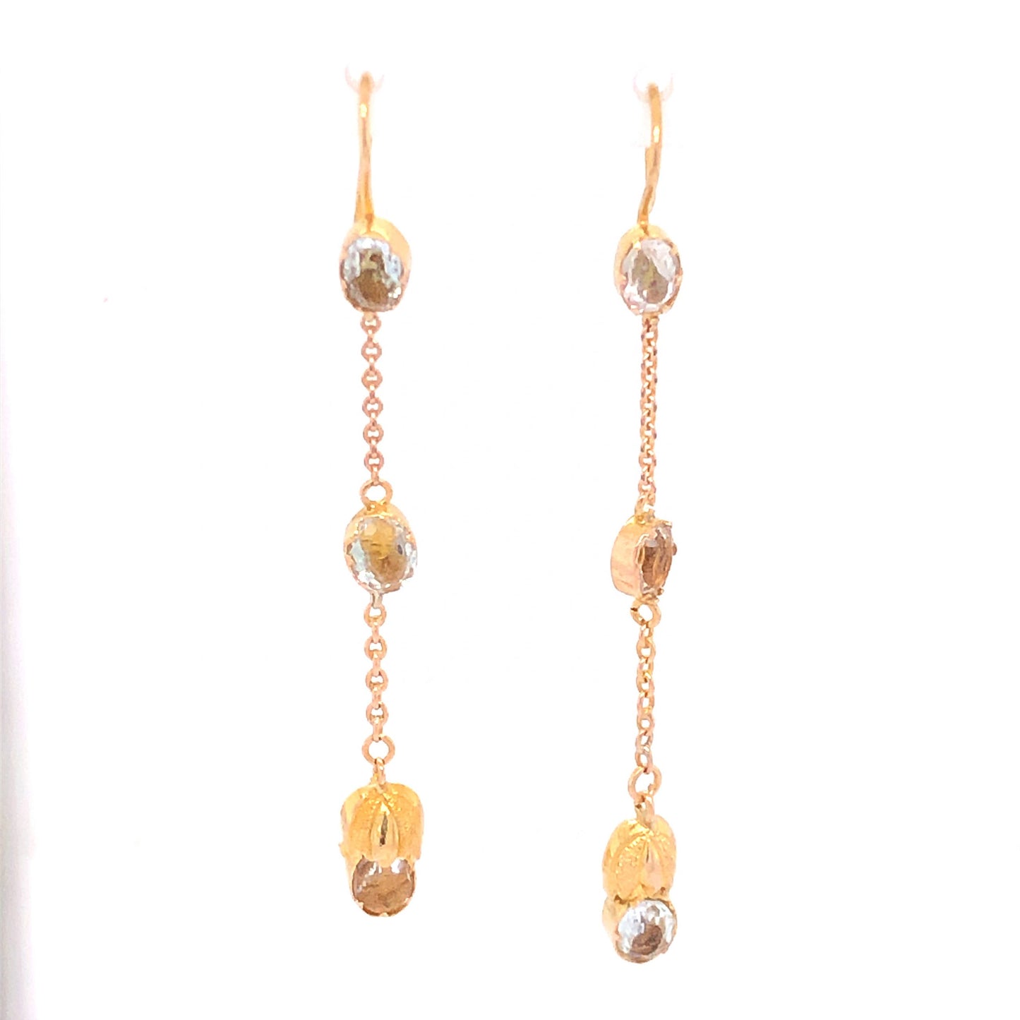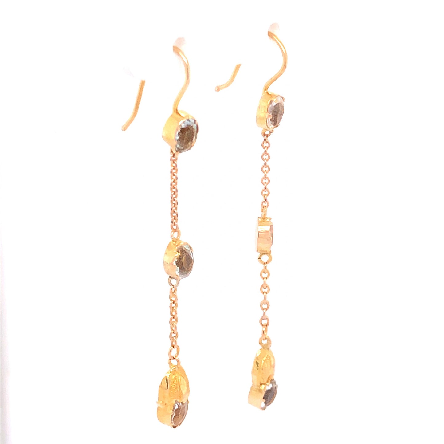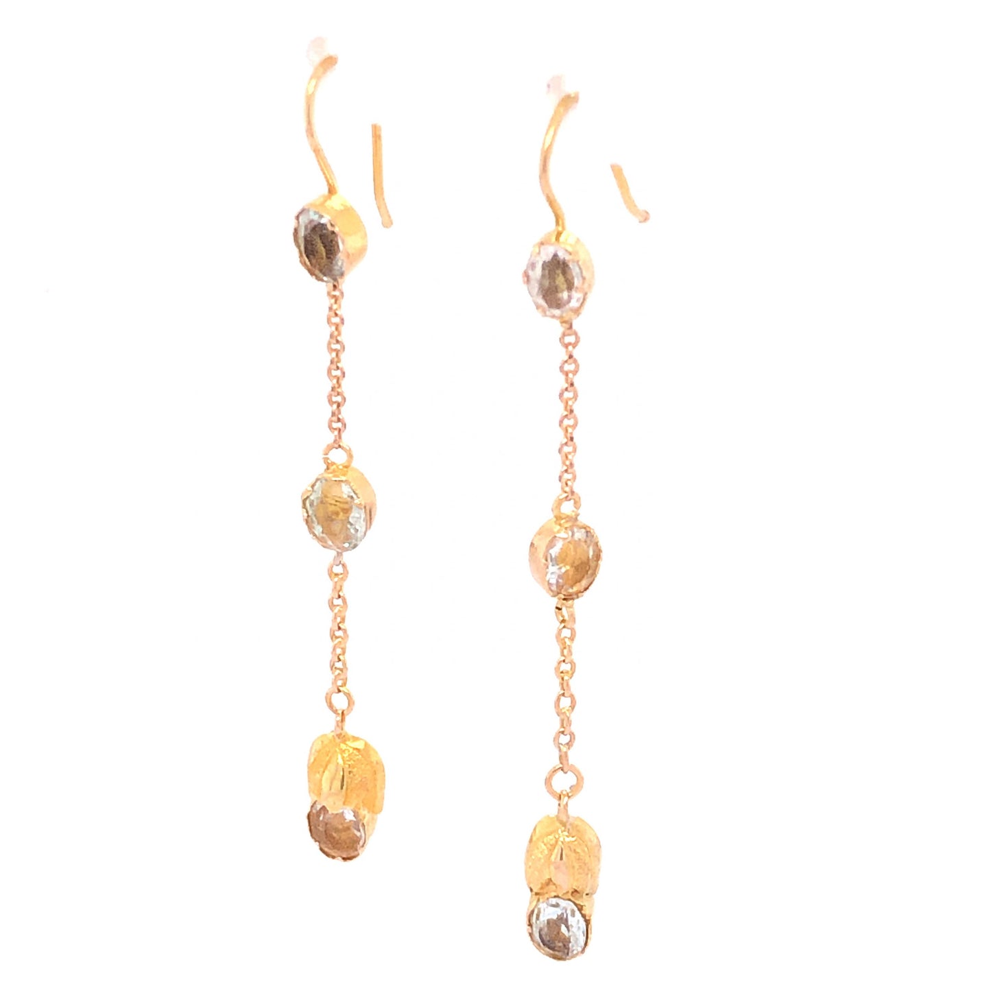Antique Victorian Quartz Earrings in 14k Yellow Gold. These Victorian drop earrings feature 1.86 carats of quartz finished in 14 karat yellow gold. Six (6) .31 carat quartz, each near colorless and dazzling, are mounted on a 14k yellow gold chain. Small golden caps and golden bezels nestle the quartz gems for a touch of added texture and form. Measuring 1.75” long and finished with comfortable fish hook backings, these stylish statement earrings are perfect to mix and match with any 14k yellow gold jewelry.
