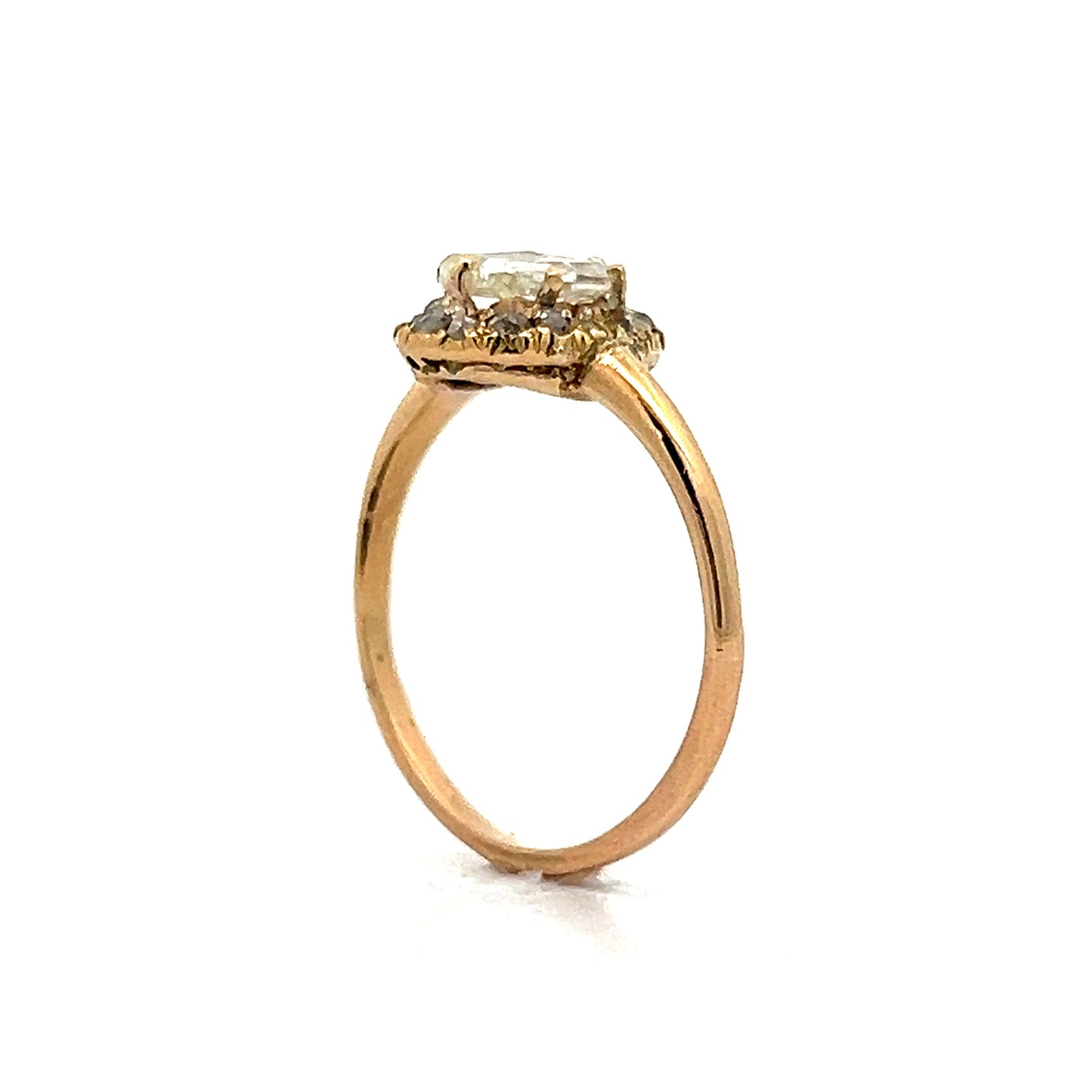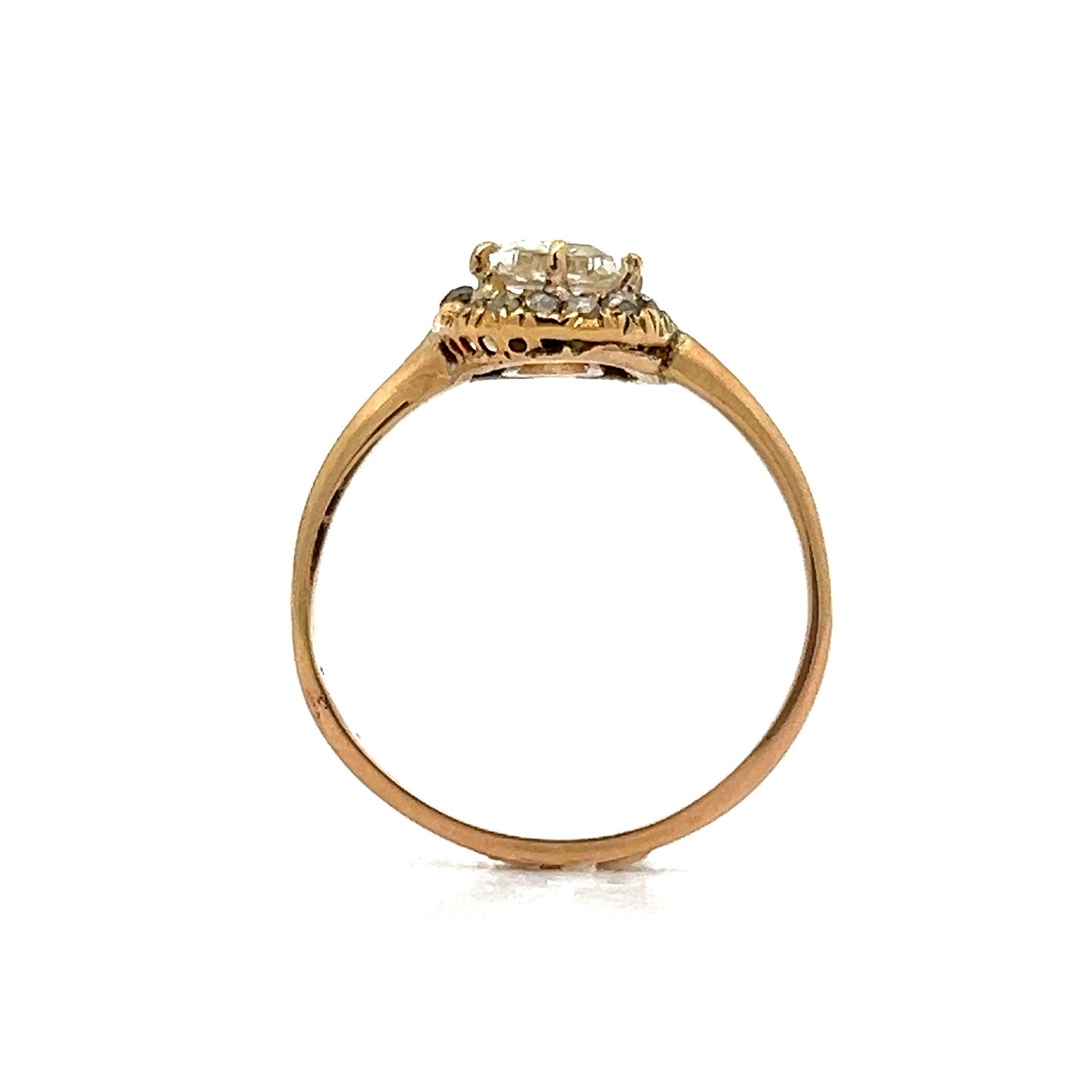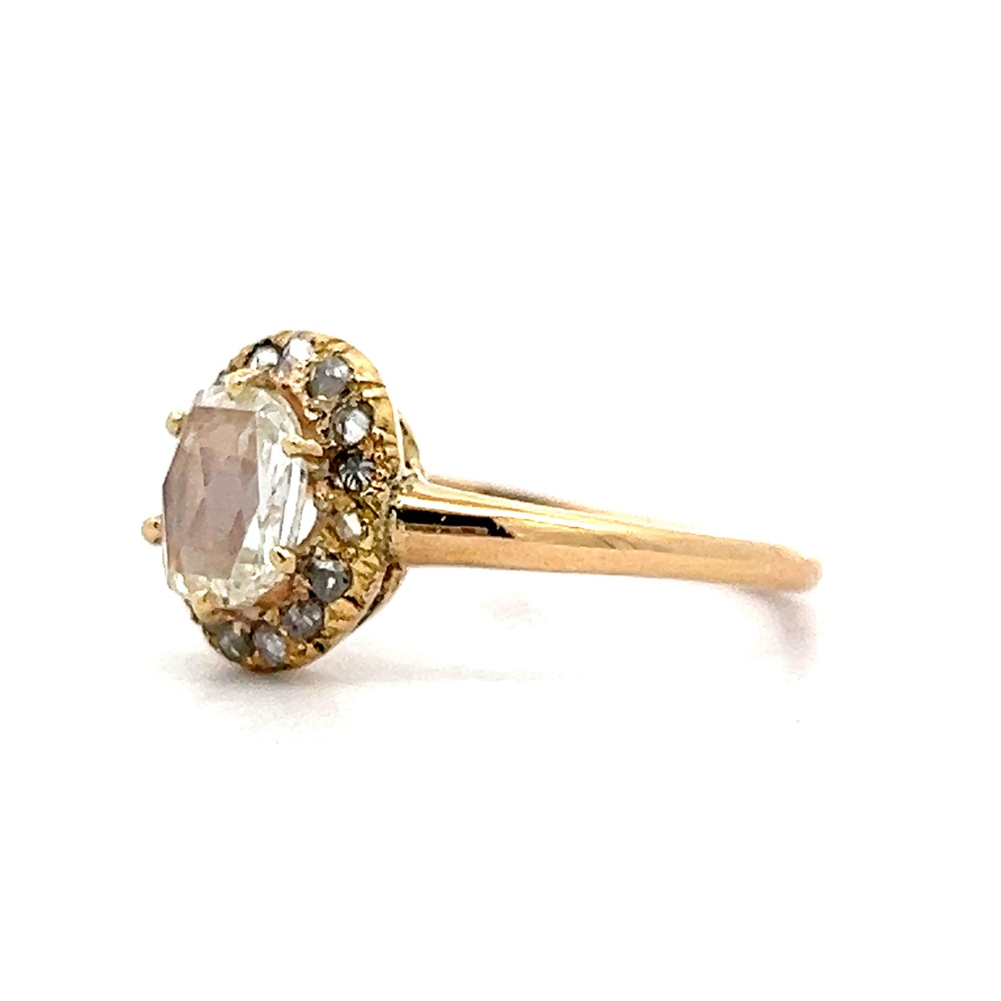 This exquisite Victorian era halo engagement ring is crafted in 14 karat yellow gold. The center features a .70 carat rose cut diamond, with a K color grade and an SI1 clarity rating. The rose cut diamond is framed by sixteen (16) sparkling rose cut diamonds, each with a 1.3mm size and .01 carat weight. The diamonds are arranged in a halo setting, surrounded by a polished yellow gold band. With its classic Victorian style and intricate rose cut diamond, this halo engagement ring is sure to be a treasured heirloom.