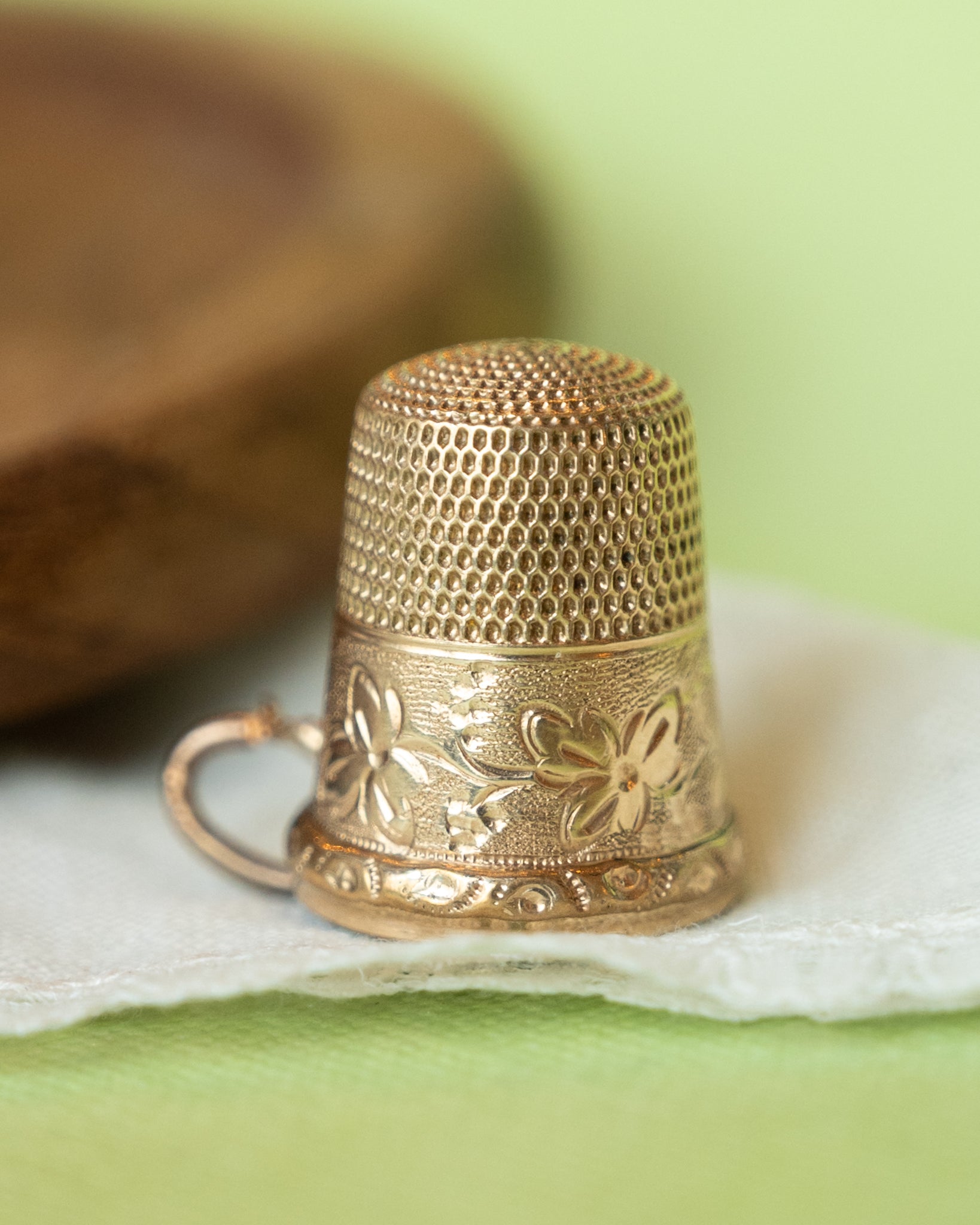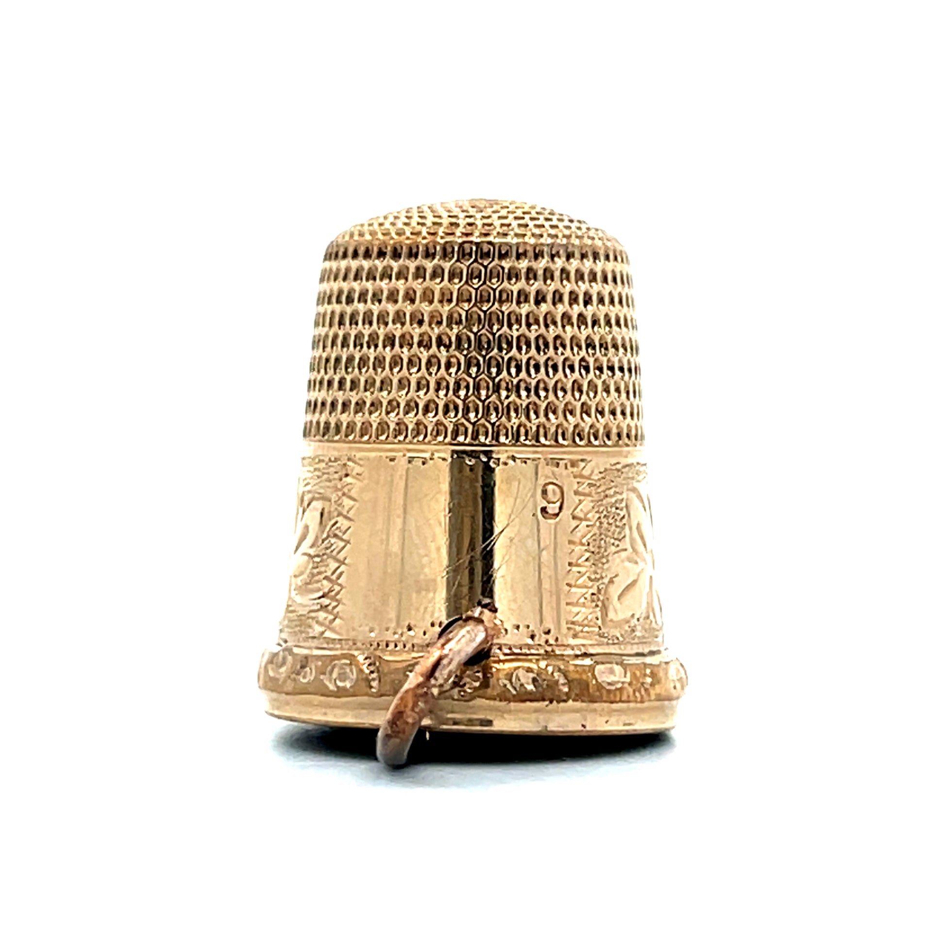 This antique Victorian 9-karat yellow gold thimble charm features leaf engraved patterns across its surface and maintains the traditional thimble shape and proportions. The engraving work creates texture and detail that was characteristic of Victorian-era decorative arts. The thimble measures to authentic sewing tool dimensions while functioning as a wearable charm.