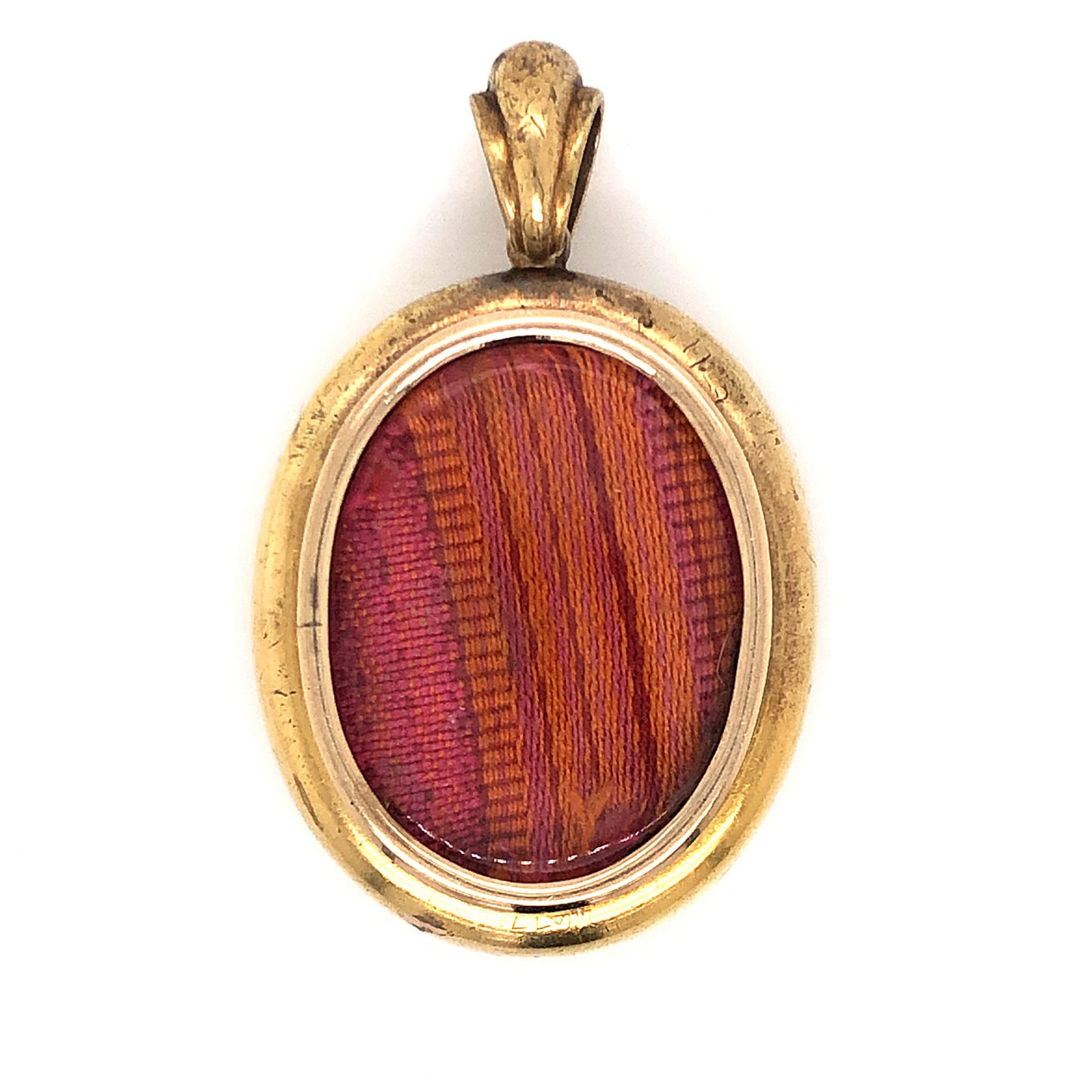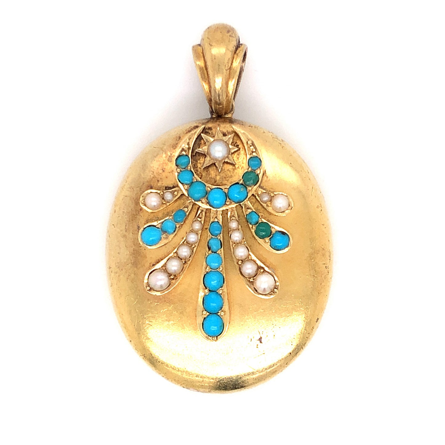 This unique Victorian pendant features turquoise and seed pearls finished in 14 karat yellow gold. Star and moon engravings create the framework on the face of the pendant. Nineteen (19) opaque and bright blue turquoise gems decorate the moonbeams. Additionally, fifteen (15) pearls decorate the sun and moon and are mounted in 14k yellow gold. The backside of the pendant has a warm red and orange texture on this lovely, one of a kind Victorian pendant.