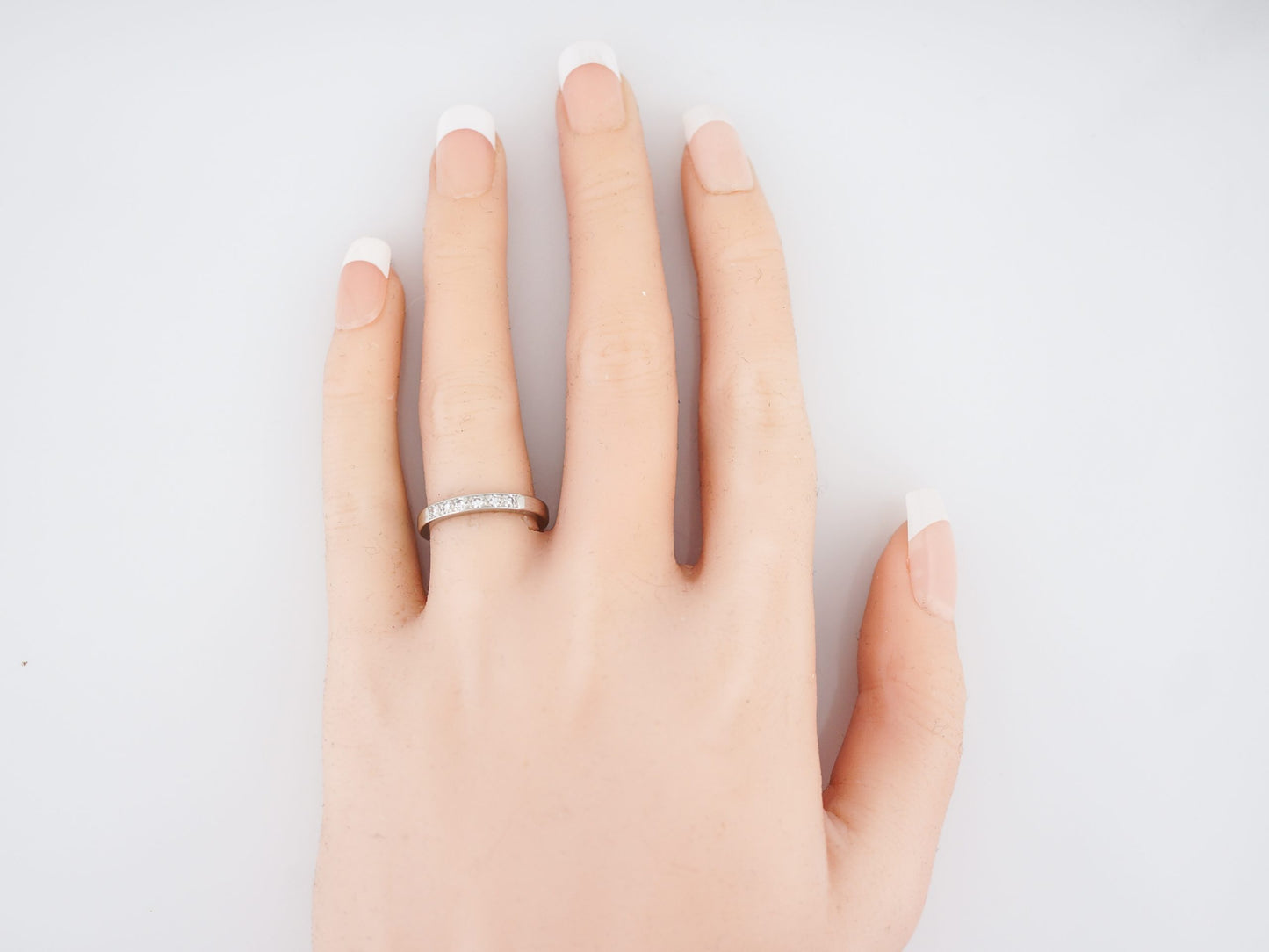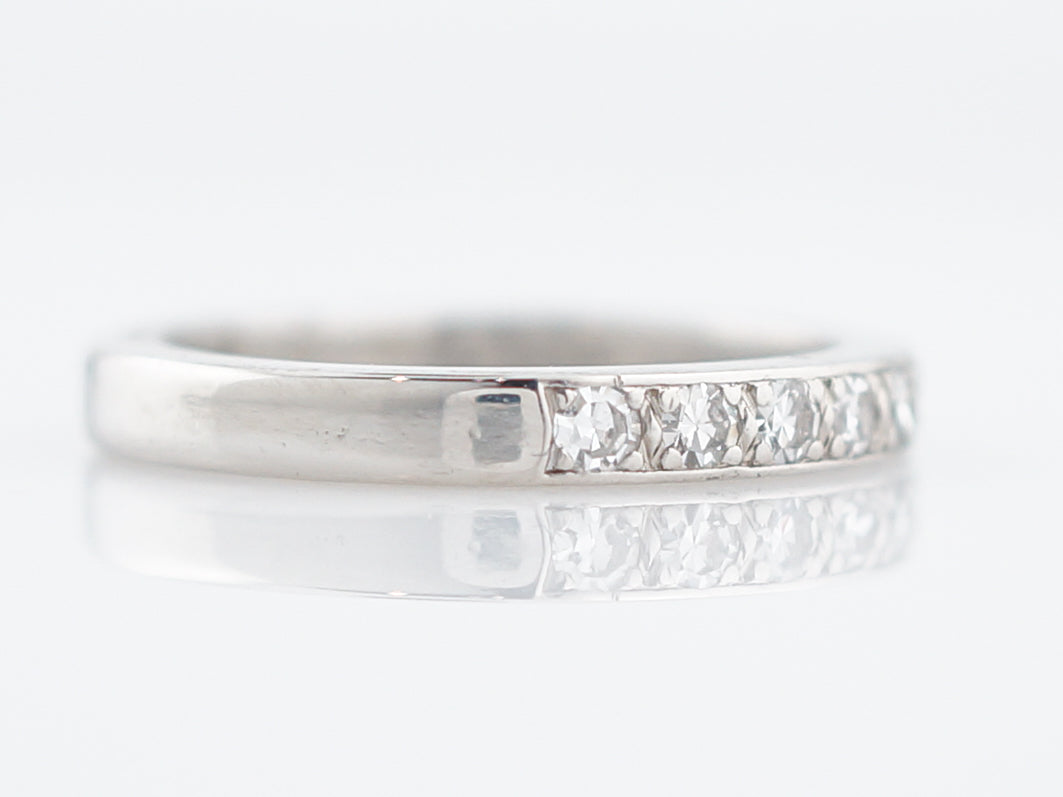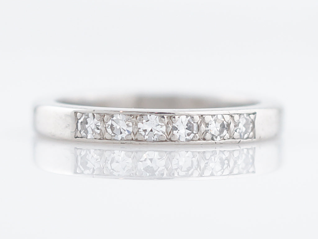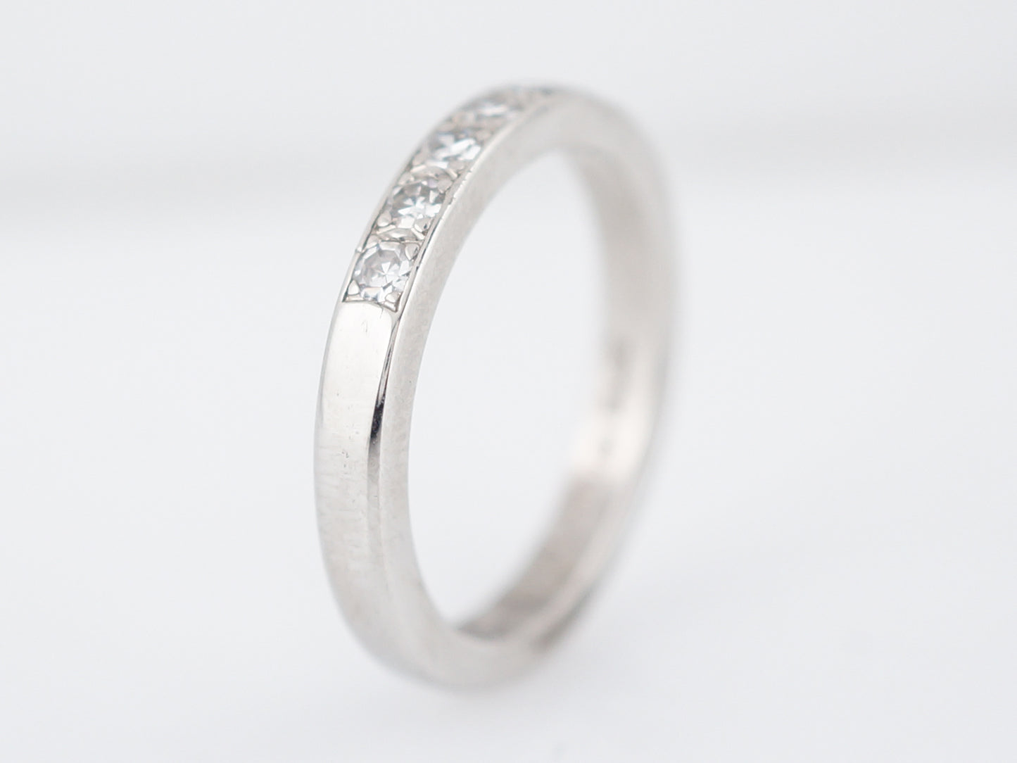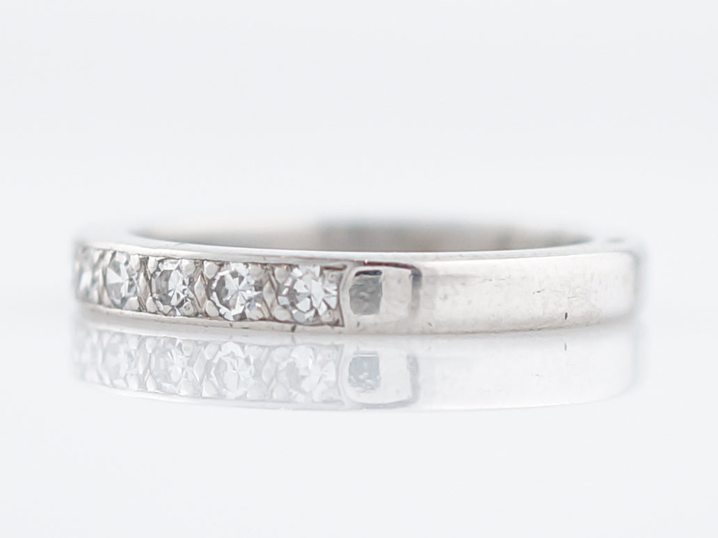 This original antique late Art Deco platinum wedding band is set with five (5) round single cut diamonds bead set across the top of the band. The result is a beautiful ring that will compliment any engagement ring or worn stacked with other bands.