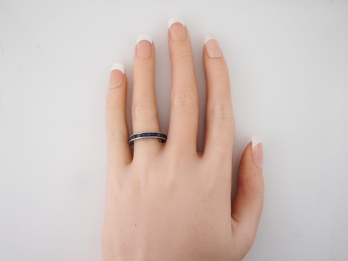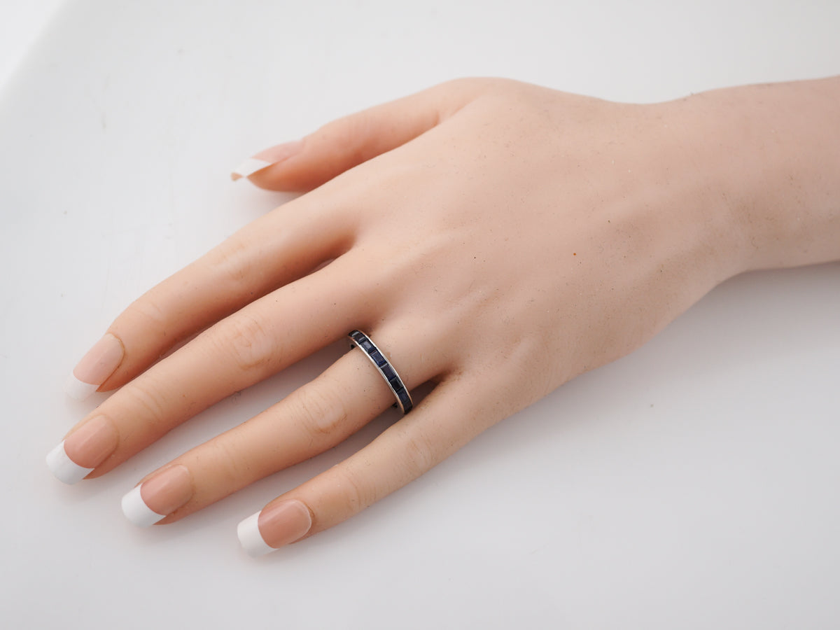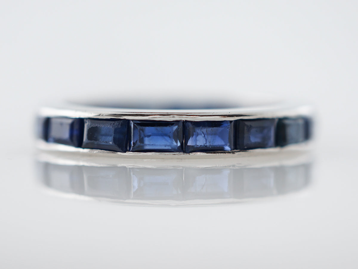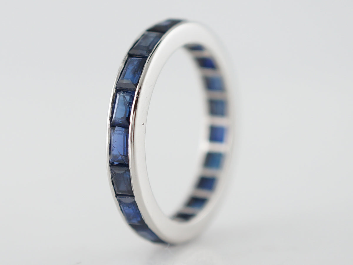 An antique wedding band from the Art Deco era holding 3.00 carat, channel set, baguette cut sapphires. This ring is composed of platinum and designed in the eternity style meaning the stones are set all the way around the band. This wedding band is sized at 7.75 and due to age and wear, the stones have a slight abrasion adding a bit of patina.