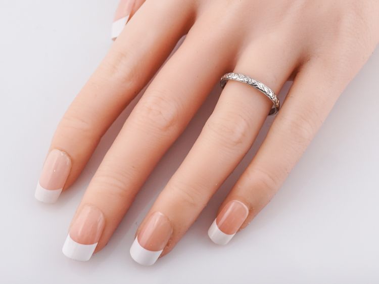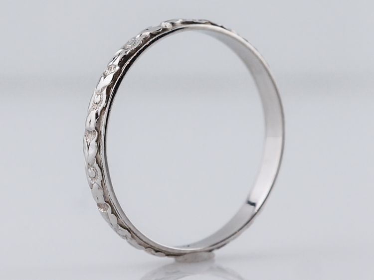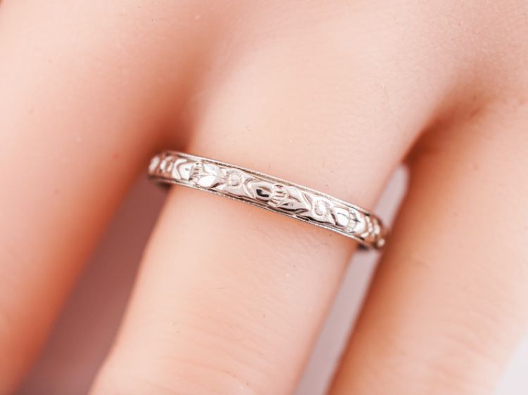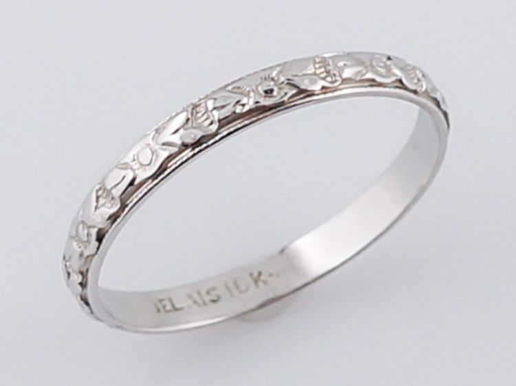 Antique Wedding Band Art Deco Belais Brothers Orange Blossom in 18k White Gold. Known for their exceptional craftsmanship during the 1920s, this 18k white gold ring, which was made by the Belais Brothers is no exception. It features a deep and crisp orange blossom pattern running all the way around the band. It looks as crisp today as it did one hundred years ago when it was first made.