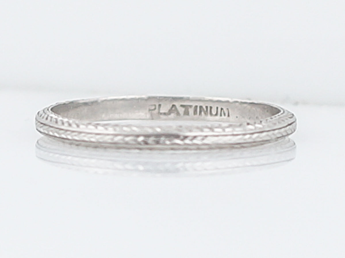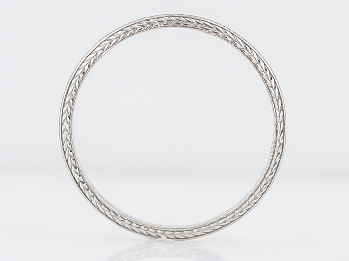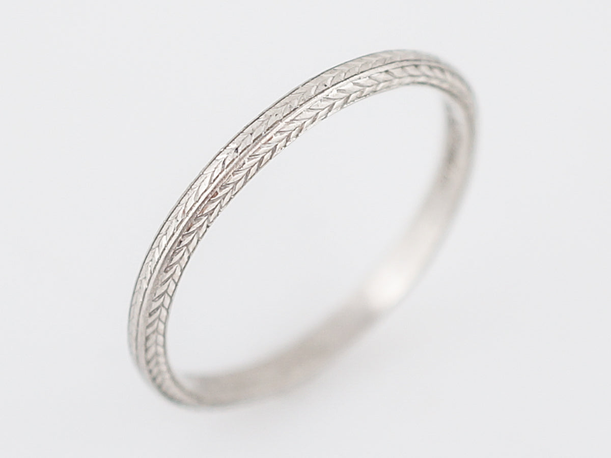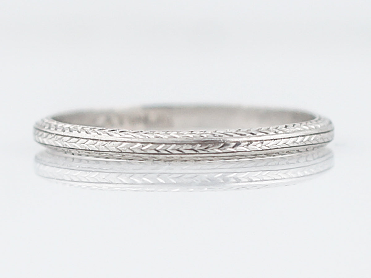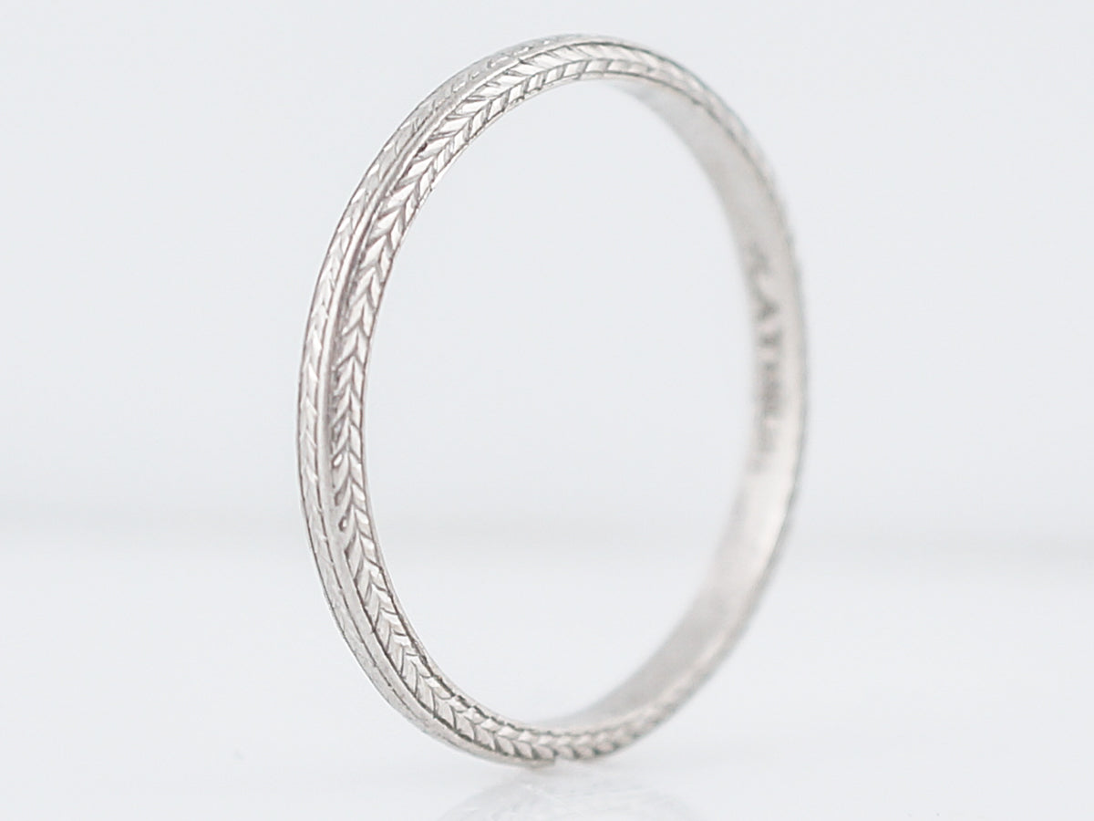 This antique wedding band has a timeless chevron pattern that runs the entire length of the ring. The pattern covers the front, top and bottom of the band. This platinum band was made in the Art Deco period so its an original antique from the 1920s-1930s. The width of the band is on the thinner side at 2.24 millimeters wide.