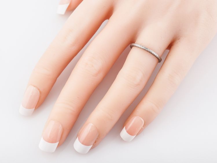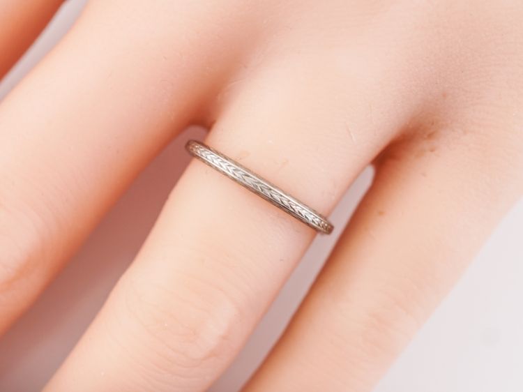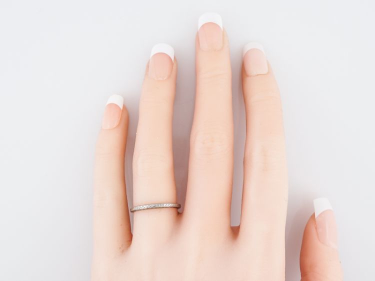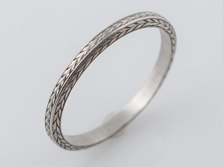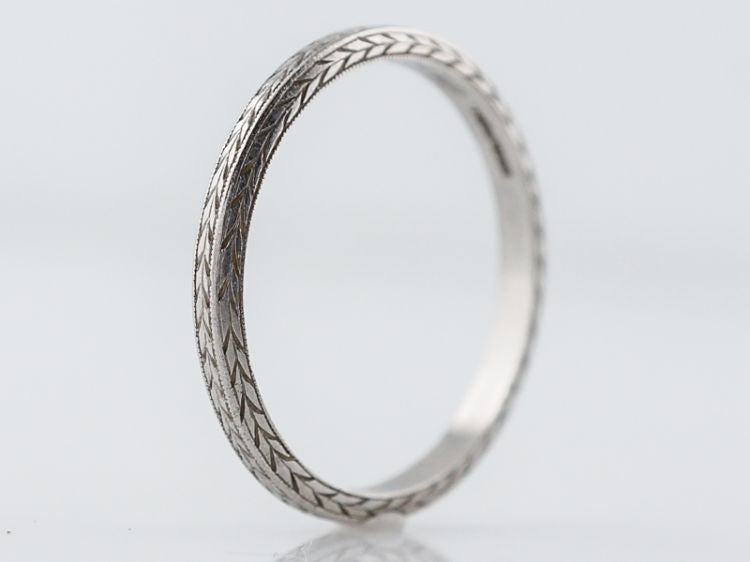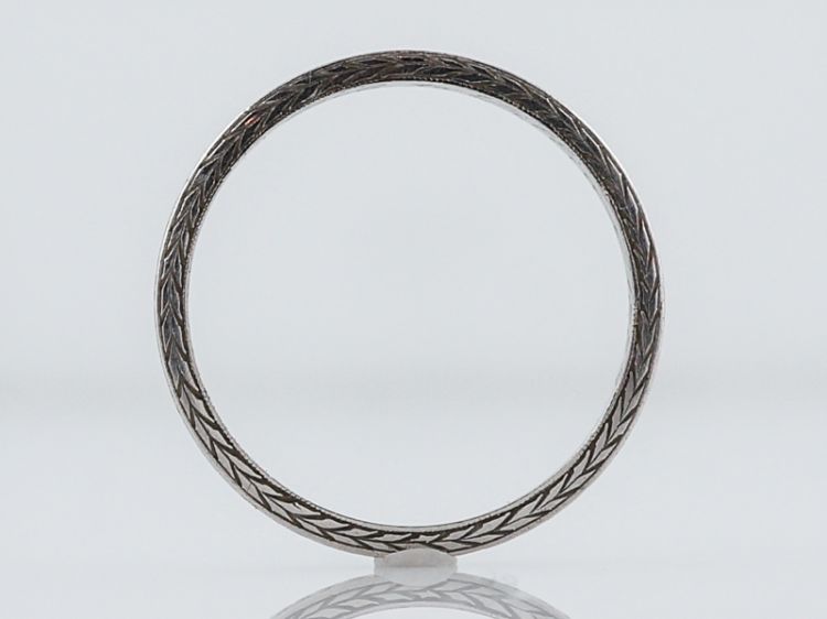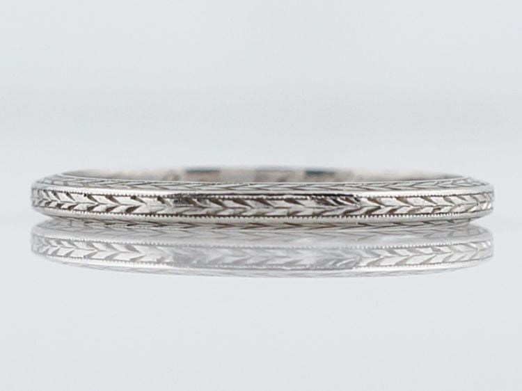 This well crafted Art Deco wedding band is made with platinum. It has three (3) rows of crisp chevron running all the way around the band. The chevron pattern on the front of the ring is bordered by milgrain detail and the same chevron pattern is repeated on the top and bottom of the band. This ring is beautiful from every angle. It would go well with an Art Deco engagement ring or a stack of bands.