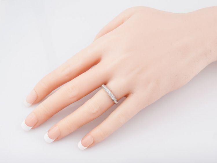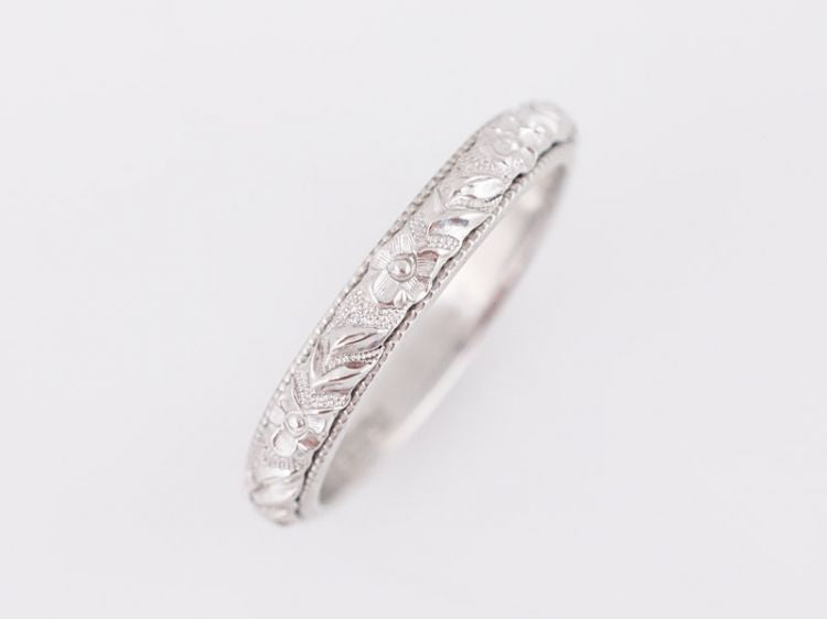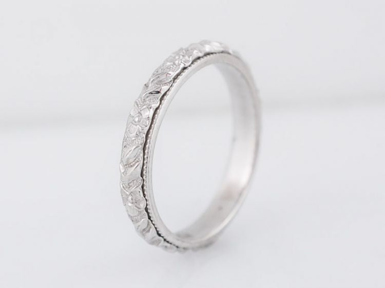 This original antique wedding band was made in the Art Deco era. This 18k white gold ring has an orange blossom pattern running the full length of the band. The orange blossom pattern is bordered by milgrain detail at the top and bottom of the band. Orange blossoms are a common theme in wedding bands of this era because they symbolize purity and eternal love. This band would be a lovely companion to an Art Deco engagement ring.