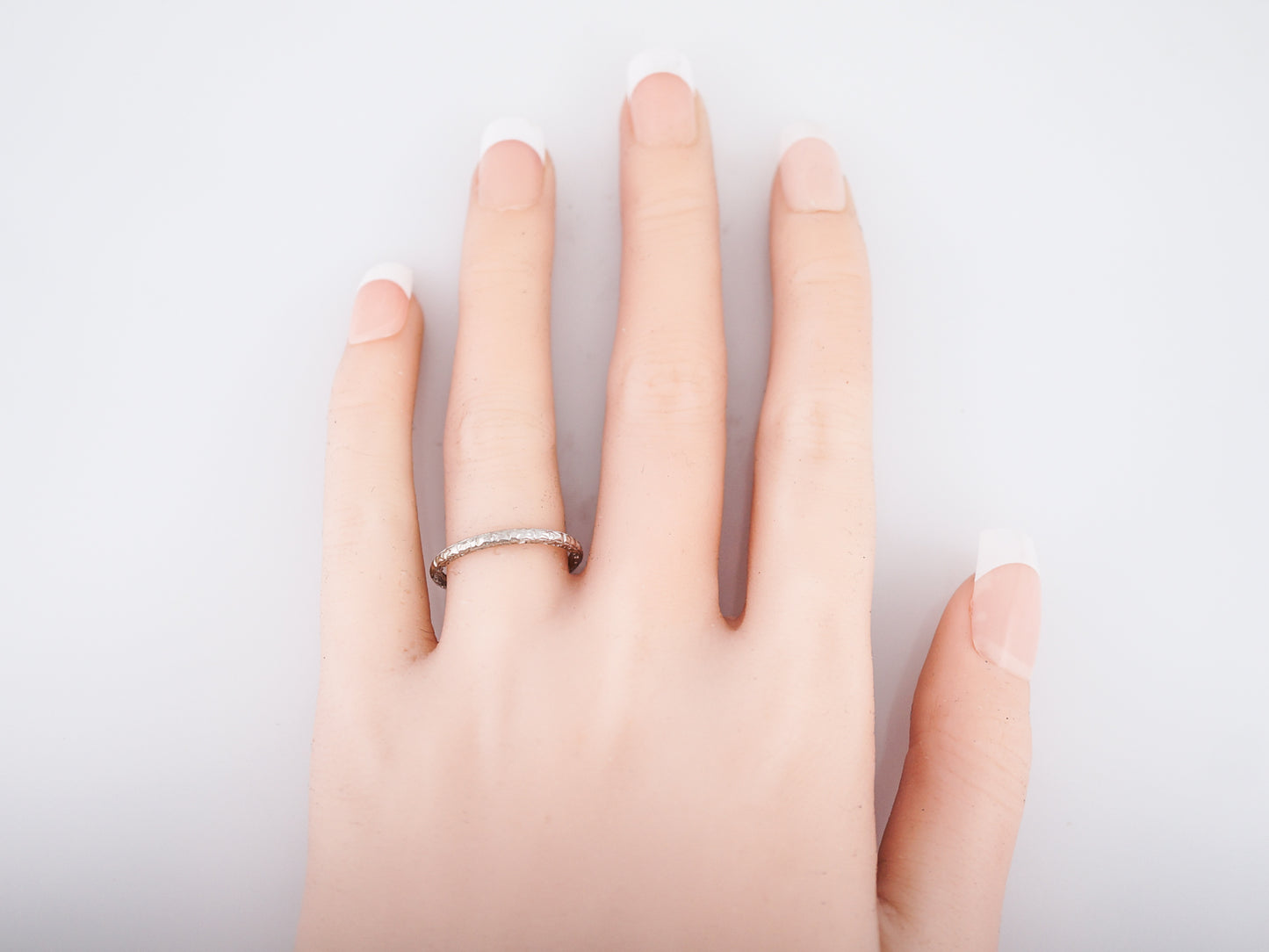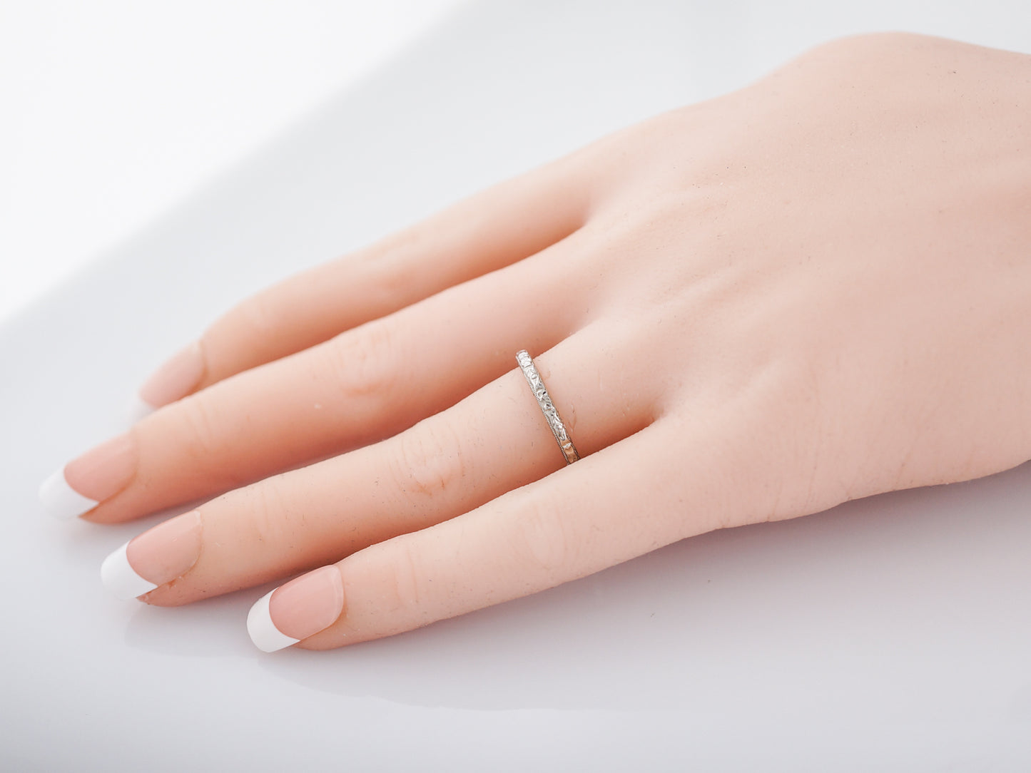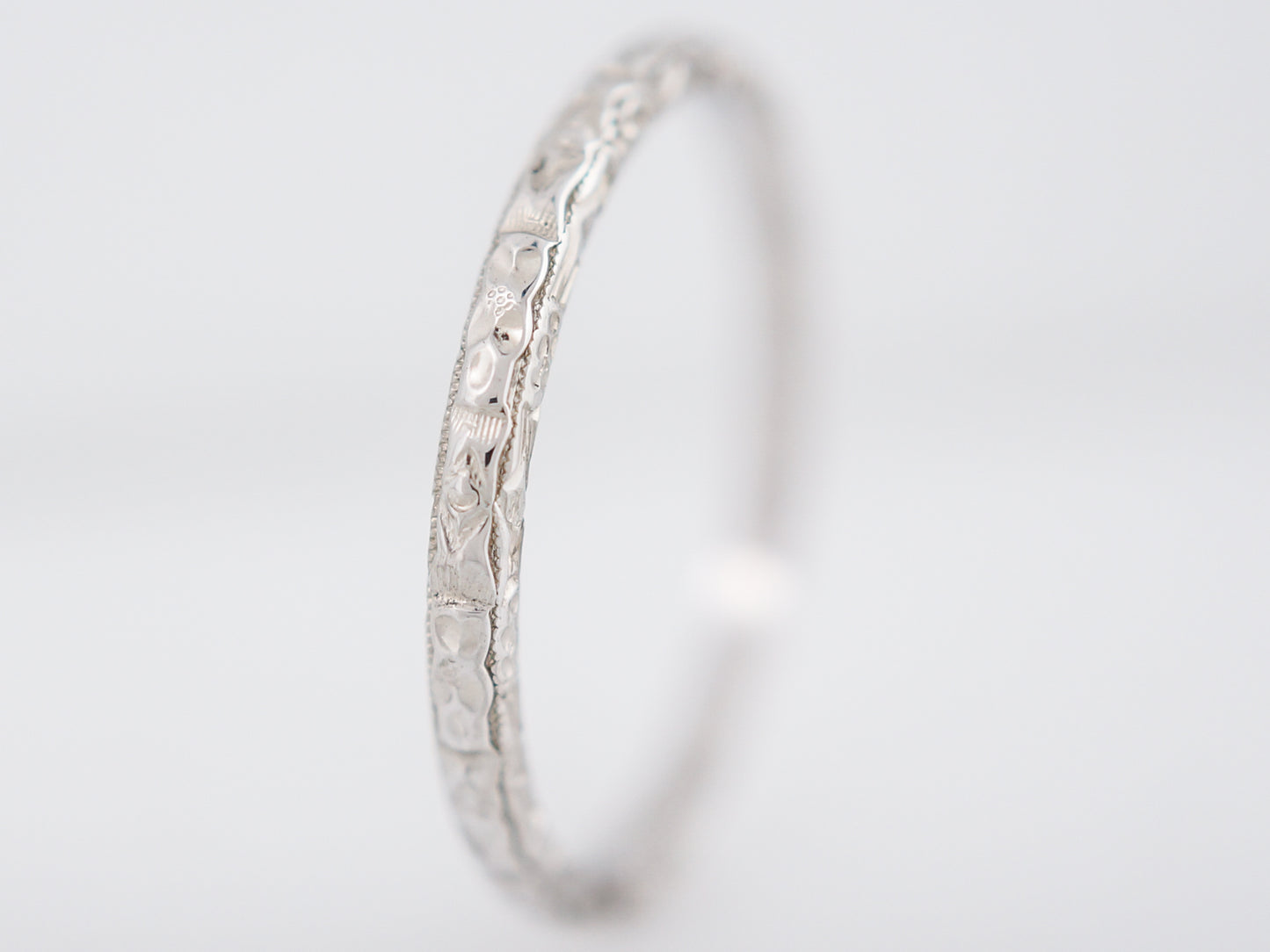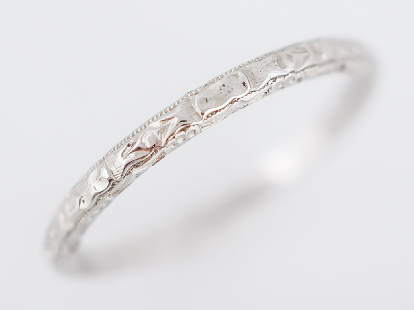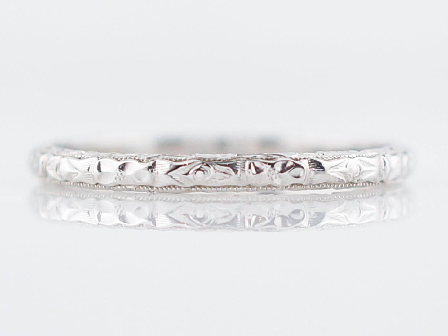 This delicate wedding band was made in the Art Deco Era and features orange blossom engraving, a popular engraving trend from that era. Delicate milgrain detailing runs along the outside edges of this 18K white gold, 2mm band.
