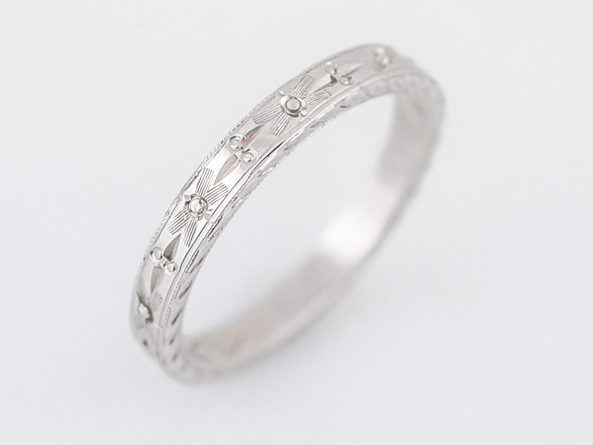 This Art Deco wedding band combines a classic orange blossom pattern with geometric details. This 18k white gold ring has striated orange blossoms running the full length of the front of the band. On the sides is a geometric pattern bordered by milgrain detail. This ring is beautiful from all angles.
