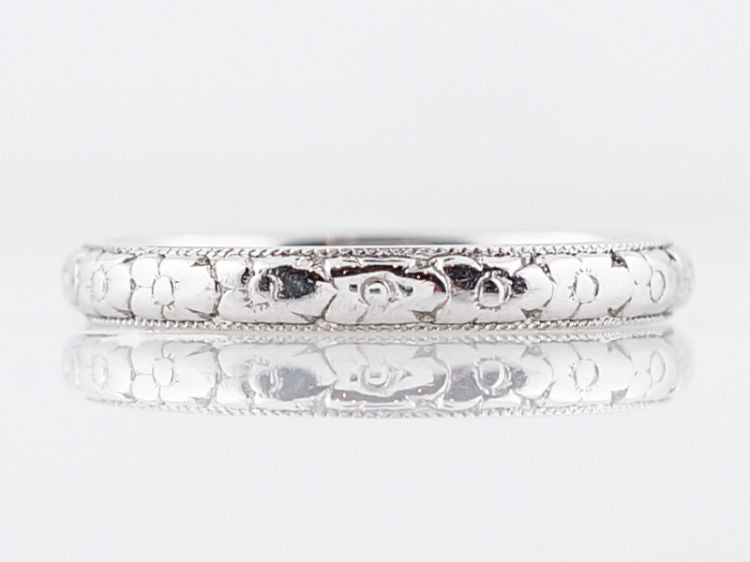 This original Art Deco wedding band has an orange blossom pattern running the full length of the band. This 18k white gold ring has crisp milgrain detail on both the top and bottom of the band. The orange blossom is a classic motif that symbolizes purity and eternal love.