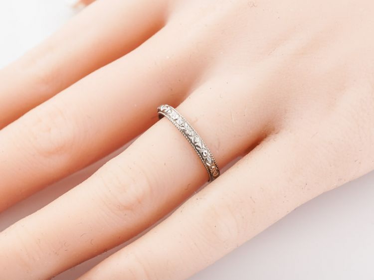 This original Art Deco wedding band has an orange blossom pattern running the full length of the band. This 18k white gold ring has original milgrain detail on both the top and bottom of the band. The orange blossom is a classic motif that symbolizes purity and eternal love.