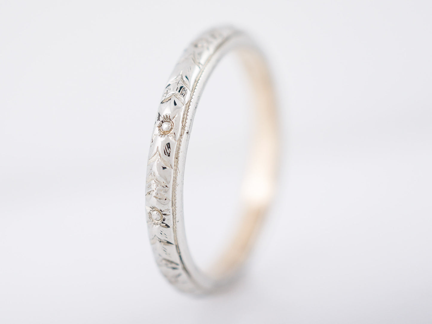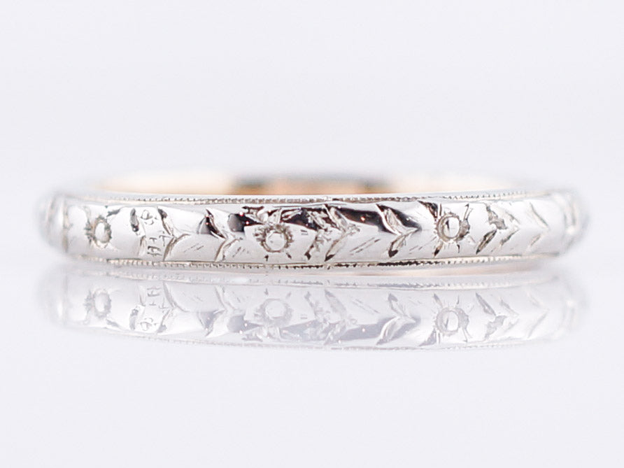 This lovely Art Deco Era wedding band has the classic orange blossom engraving, indicative of the time period in which it originates from. Cast in both white and yellow 18 karat gold, and 2.7mm wide, this is a timeless choice for a wedding band.