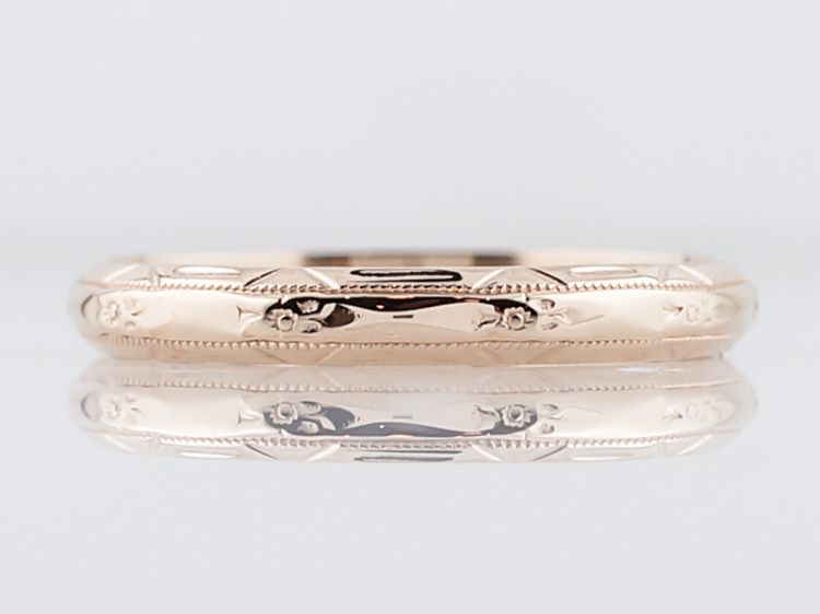 This original mens Art Deco wedding band is crafted in 14k yellow gold. It features a mixture of a geometric pattern on its sides and an orange blossom pattern running the full length of the rings face. Additionally, two rows of crisply restored milgrain round out this wonderful Art Deco design.
