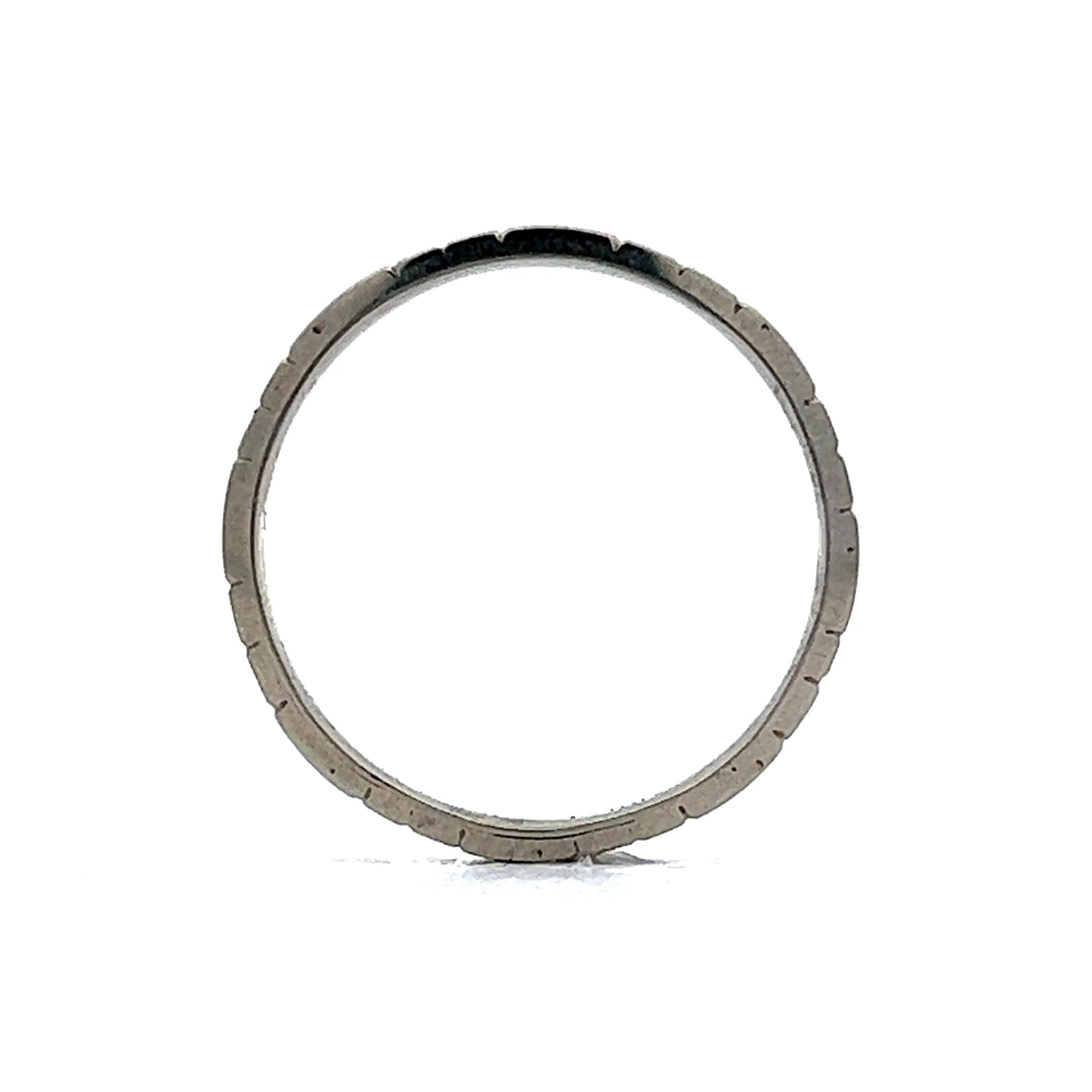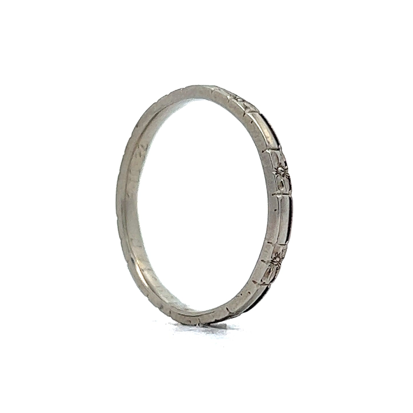 This original Art Deco orange blossom motif wedding band is finished in 18 karat white gold. The band consists of patterns of orange blossoms connected by geometric stations. The band the perfect combination of polish and antique patina. At 2.05mm, this band looks great stacked with other bands to give texture or with any antique ring.