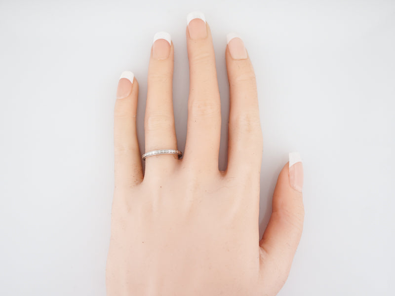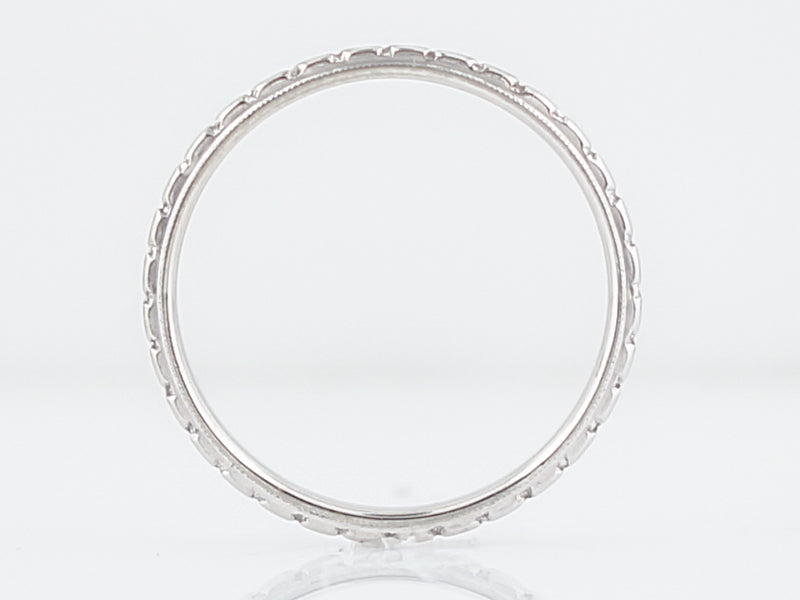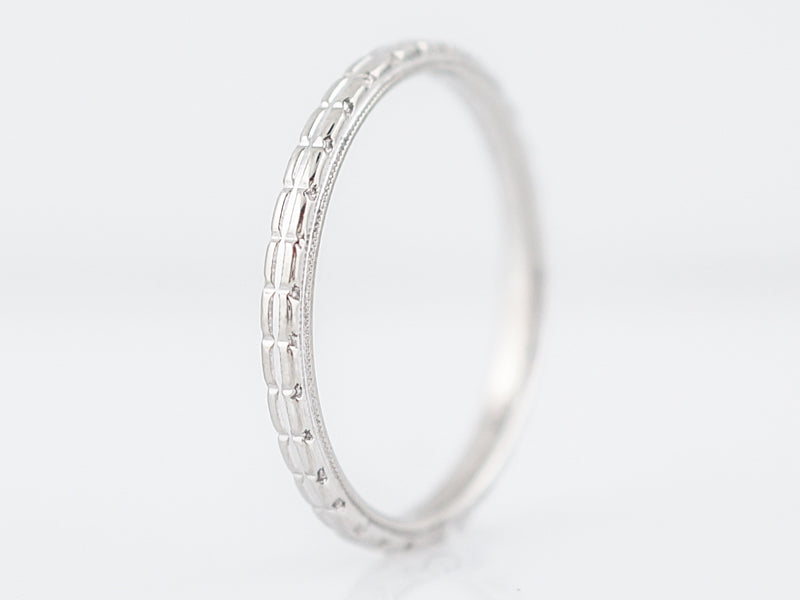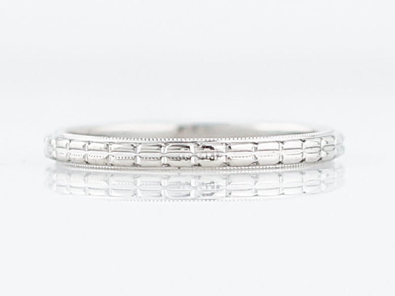 This late art deco wedding band features a unique geometric pattern. The pattern runs the entire length of the band and is bordered by a row of milgrain on each side. The 18k white gold band is thin and would make a wonderful pair with most most any engagement ring.
