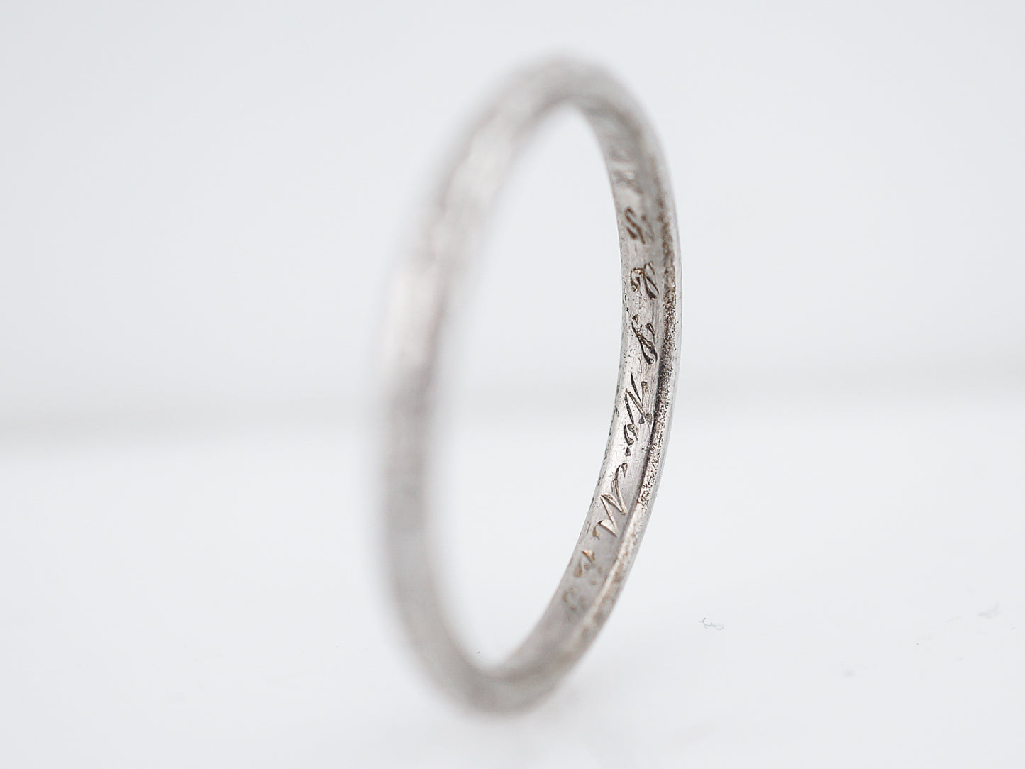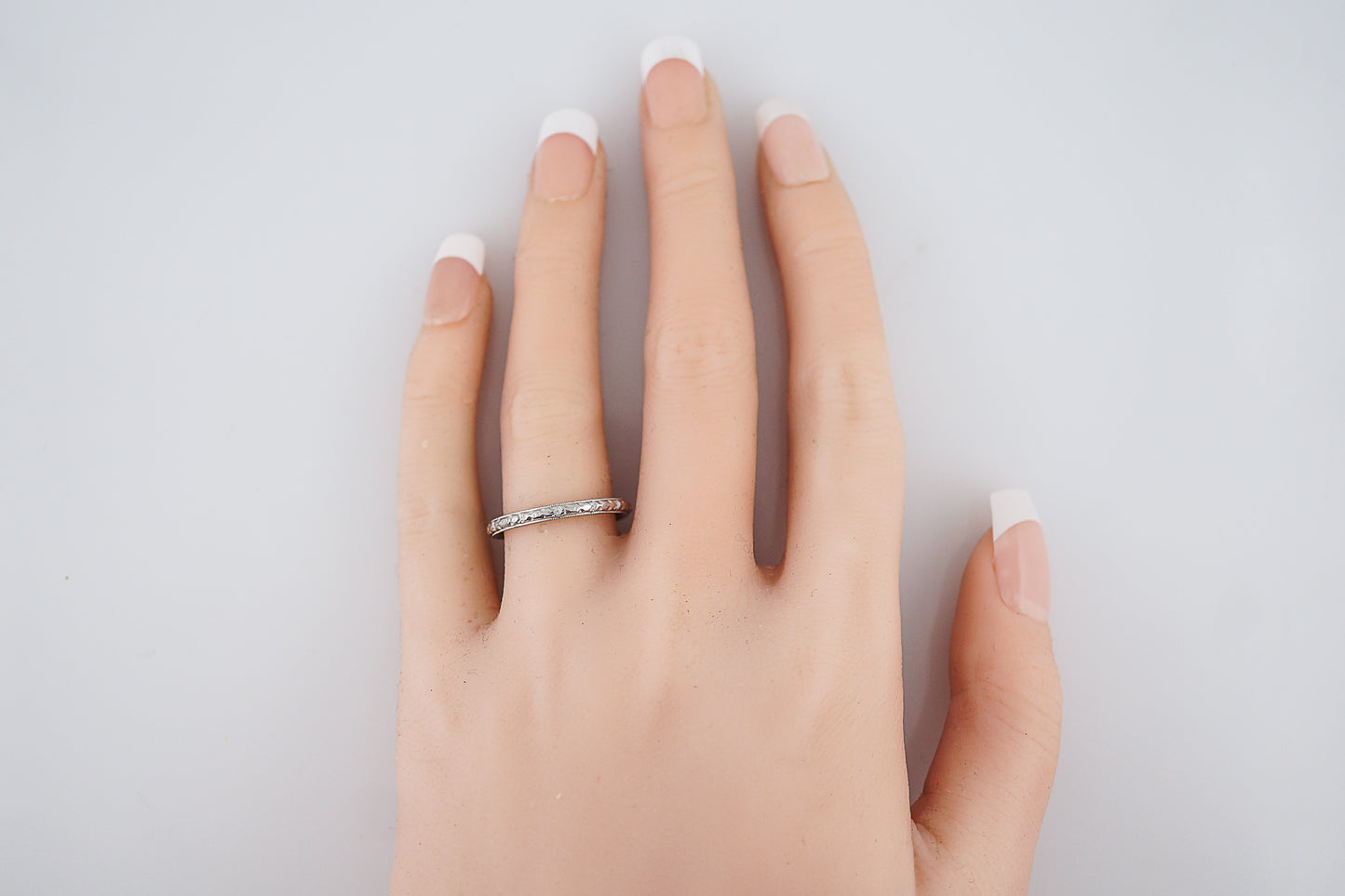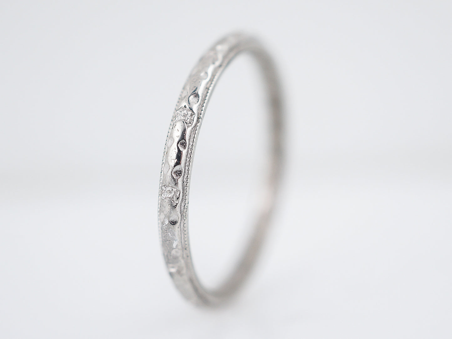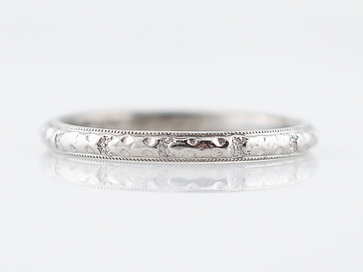 This radiant Art Deco Era wedding band features a subtle orange blossom design on a half round 18 karat white gold band. Measuring about 2.13 millimeters in width, this ring would look great as a wedding band or as one in a set of stacking bands. With a soft milgrain trim and a comfortable weight, this wedding band has a unique beauty in all the fine details.