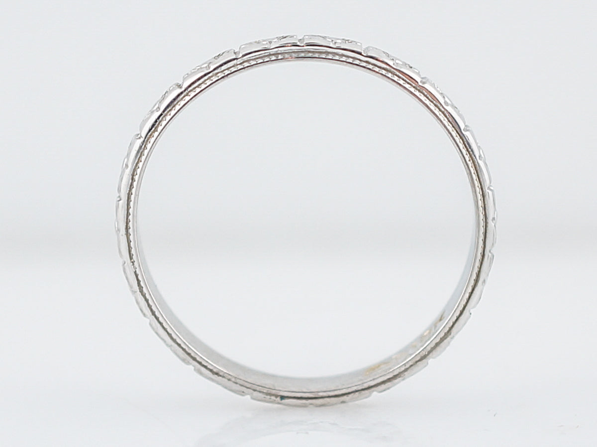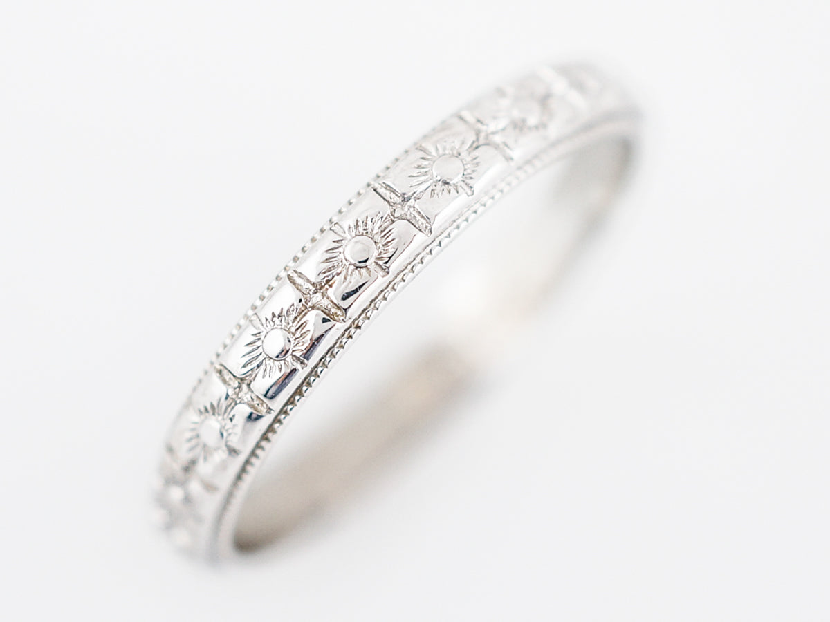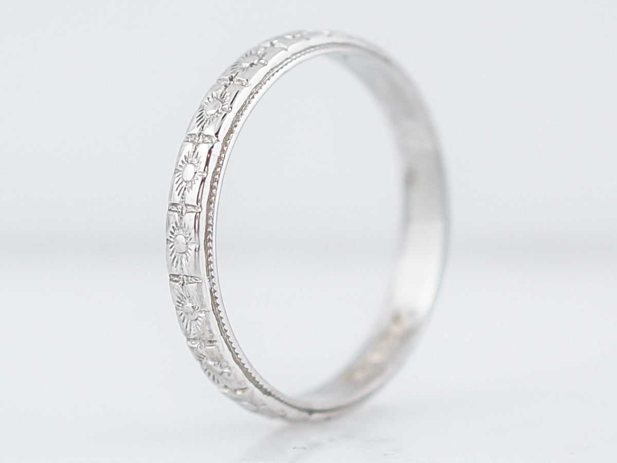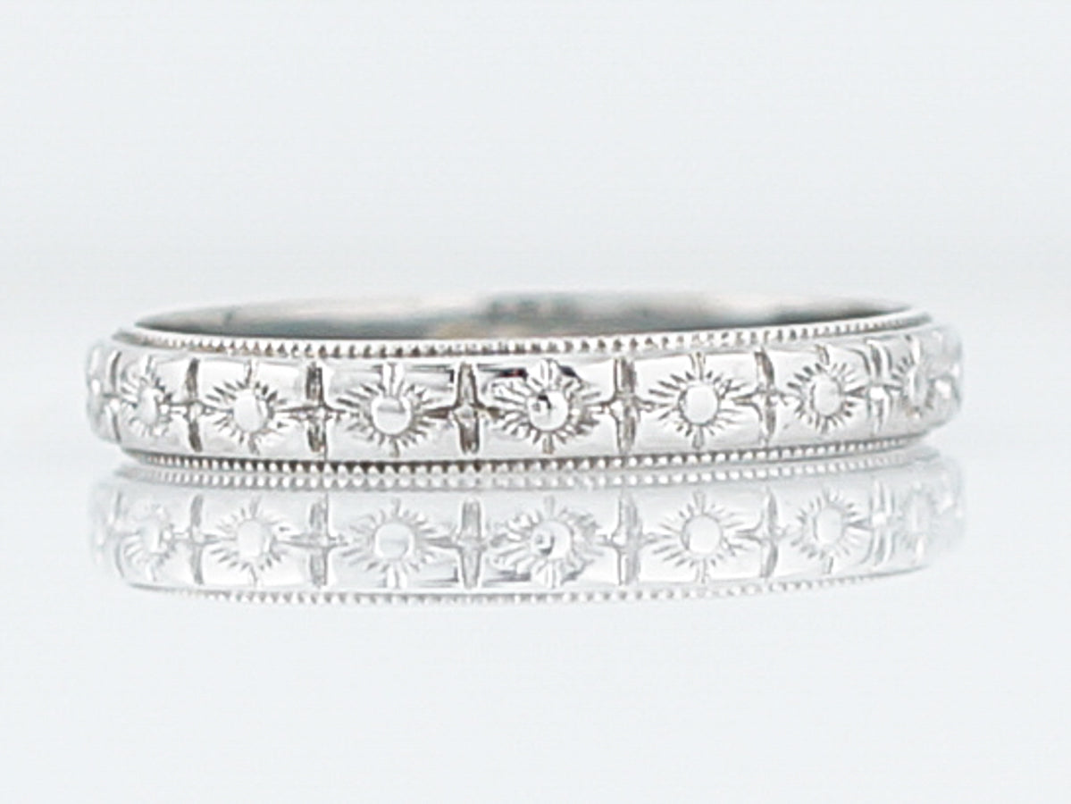 The orange blossom engraving and milgrain detailing on this art deco wedding band is so crisp that you can hardly tell its almost 100 years old. The floral motif extends the entirely of the band which measures approximately 2 millimeters in width and is cast in 14 karat white gold. This wedding band is a piece that is sure to be cherished for another 100 years.