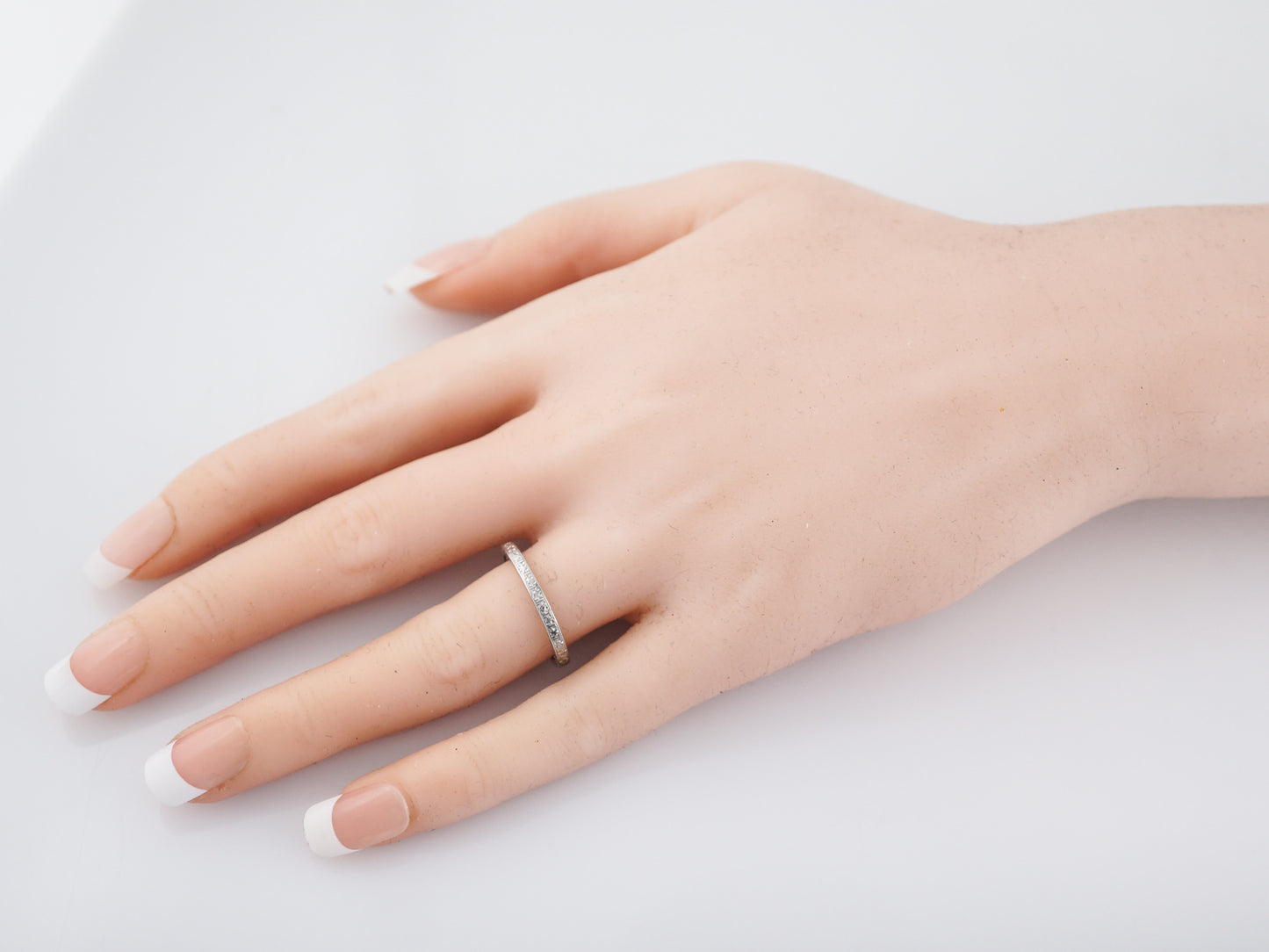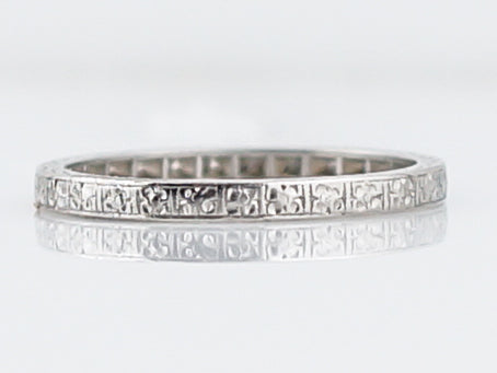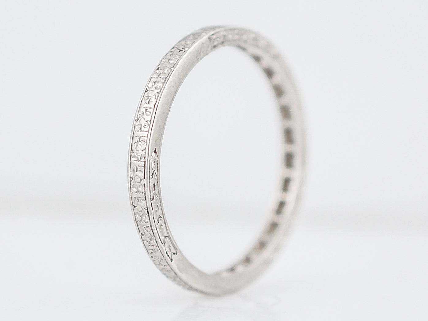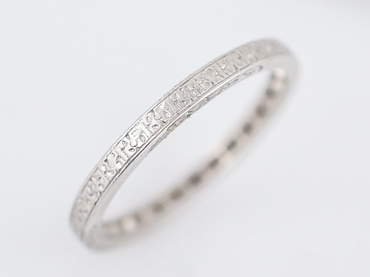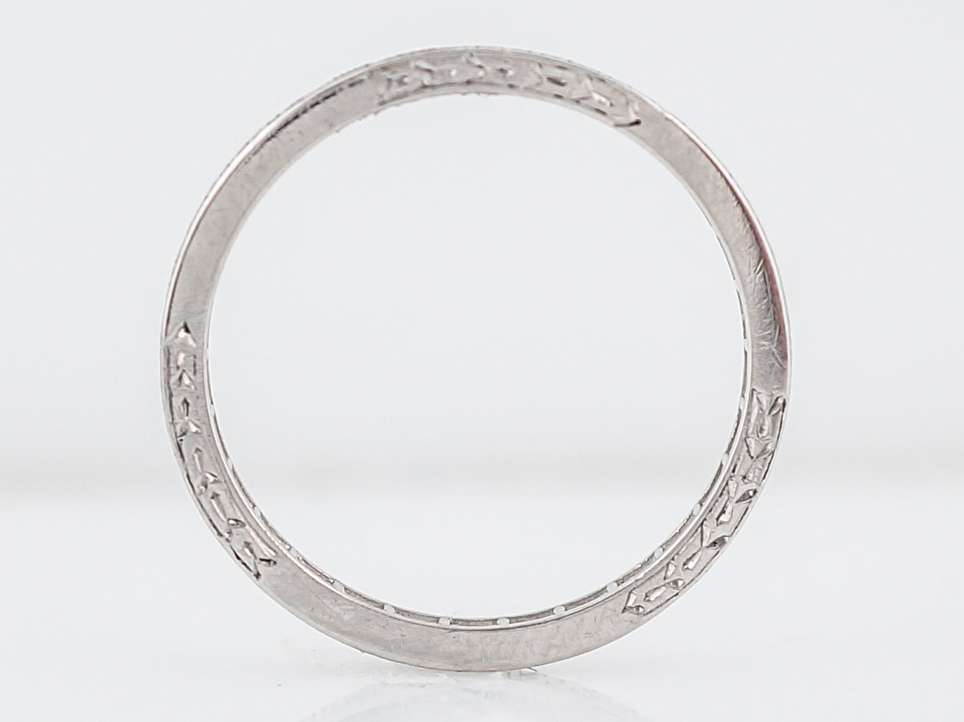 This floral wedding band is an antique that was made in the Art Deco era. This platinum ring has an orange blossom pattern running the entire length of the band. The orange blossom symbolizes purity and eternal love. This ring would be a lovely wedding band and would also add texture to a ring stack.