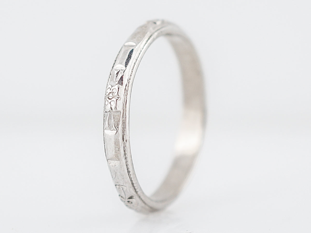 This art deco era wedding band is a delicate 2.7mm wide, and features a lovely pattern of orange blossoms followed by a high polished space, repeating all around the ring. The edges of the ring have milgraine detailing and the ring is done in platinum. A perfect pairing for a platinum engagement ring!