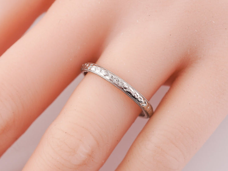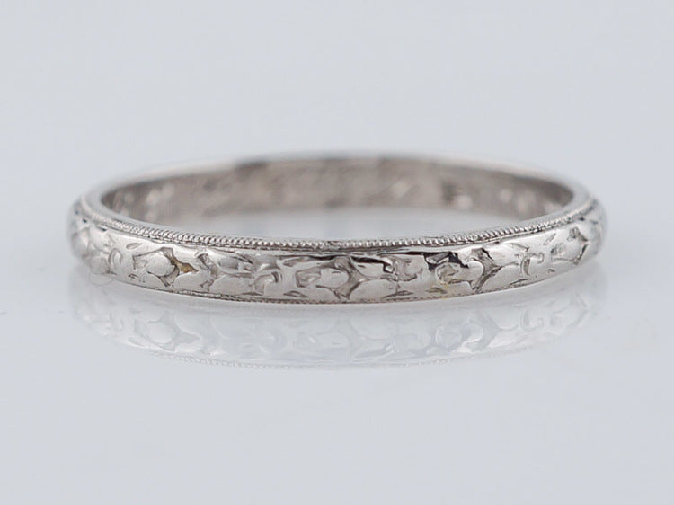 This original antique Art Deco platinum wedding band features the popular orange blossom repoussé pattern. The slightly raised pattern creates a delicate design and has original milgrain detailing. The band is currently a size 7.25 and can not be altered without breaking the pattern. Engraved Charlie to Flo 7.15.23