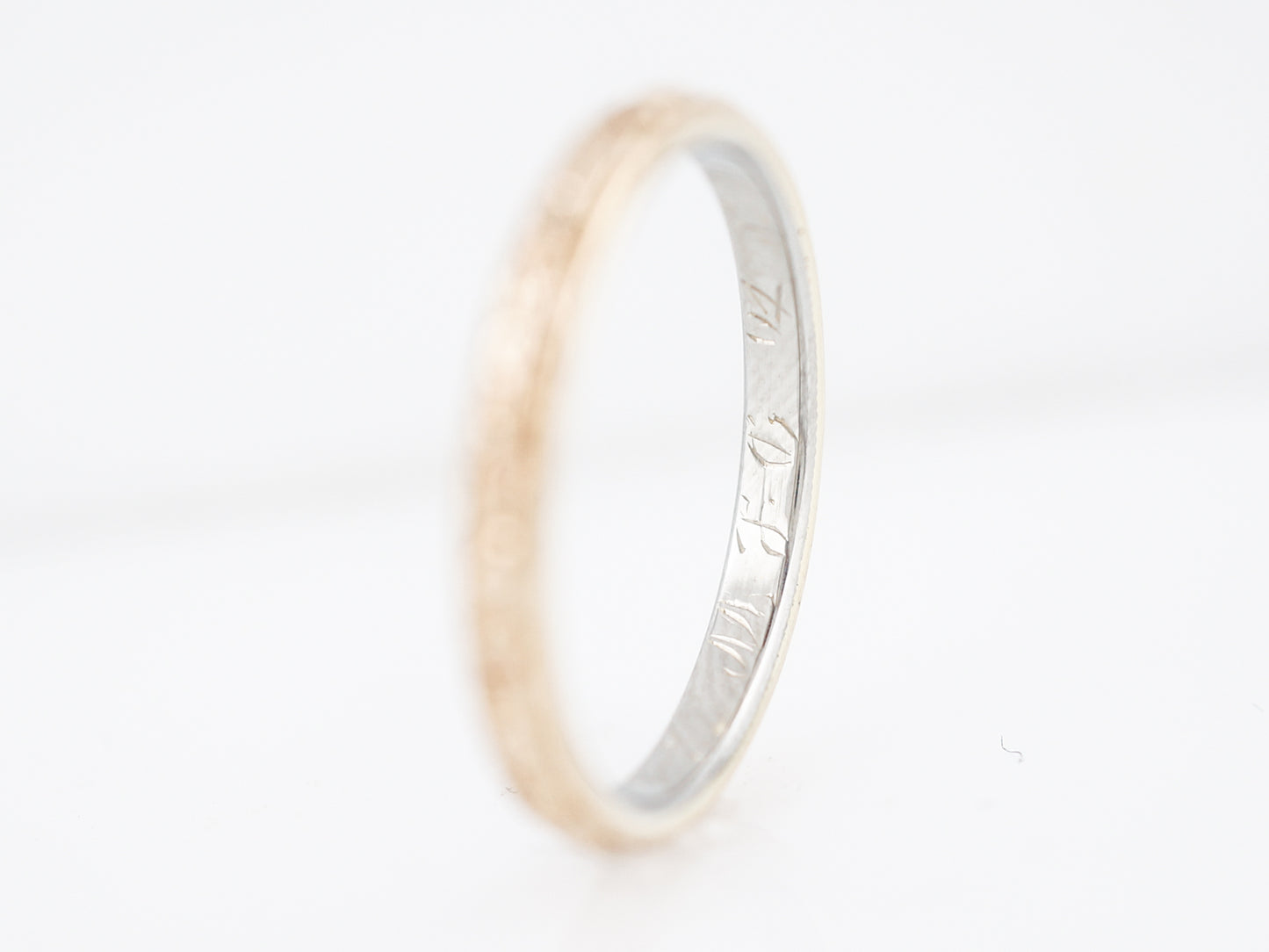 This antique orange blossom wedding band is completed in 14 karat yellow gold with a 14 karat white gold interior. The band features a migrain edge detail. The band measures 2.4 mm in width. This rare example of an Art Deco yellow gold wedding band is in excellent condition