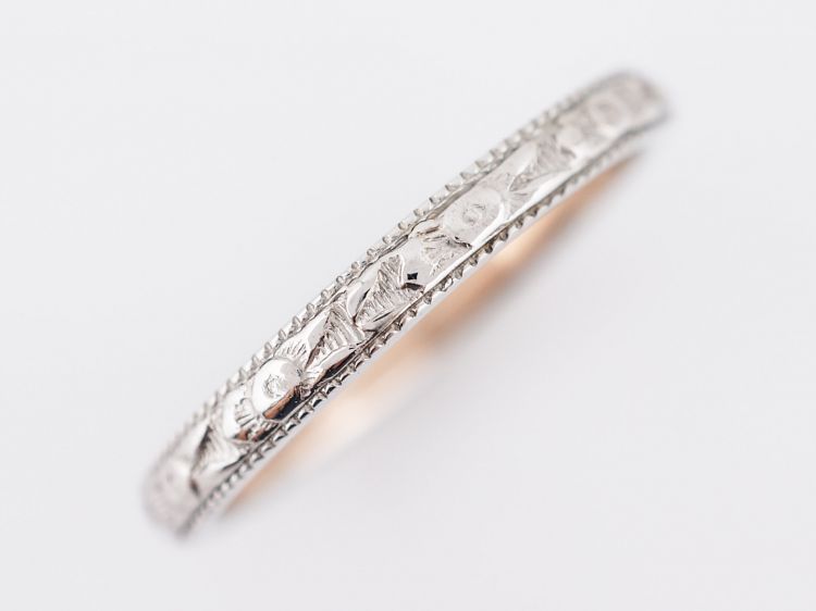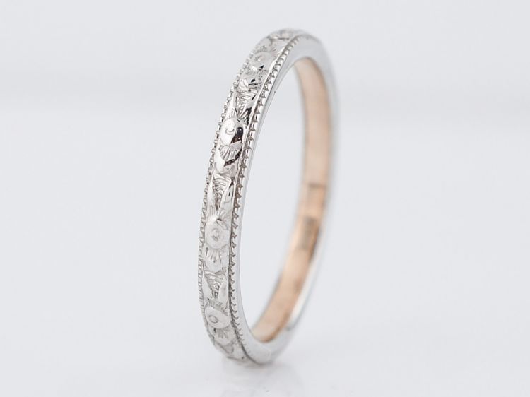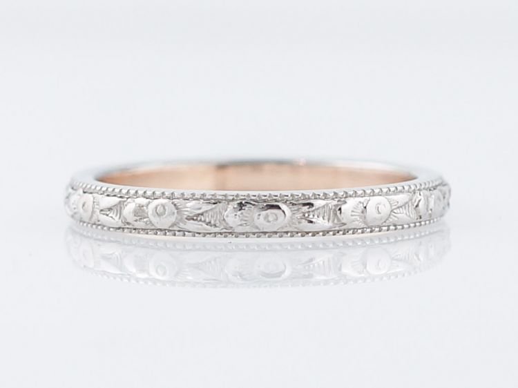 This beautiful two-toned antique wedding band features decorative orange blossoms and milgrain edges along the 2.37mm wide band. Cast in 18 Karat gold, this band features white gold on the outside and yellow gold along the inside of the band.