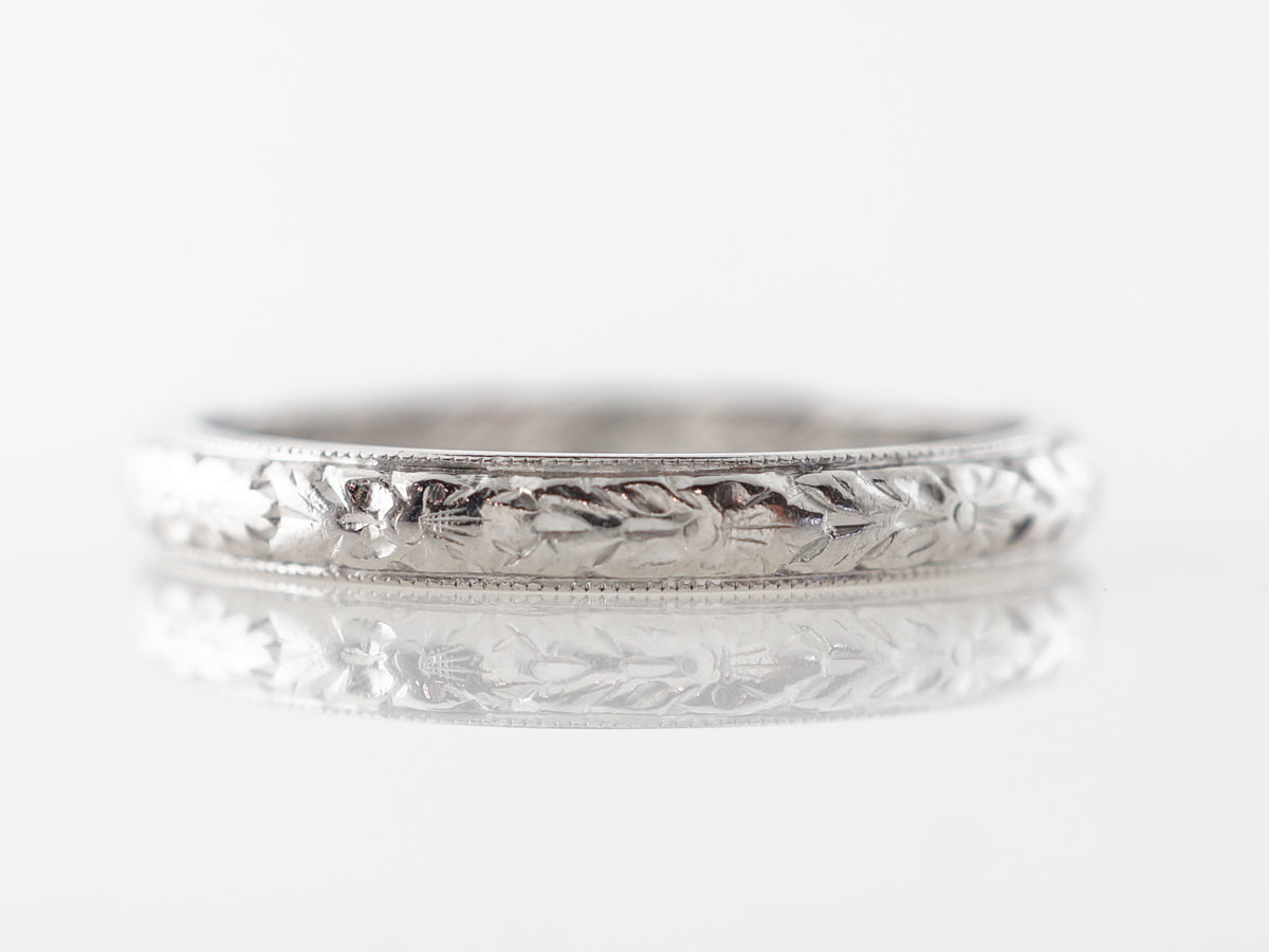 Antique Wedding Band w/ Engraving in 18k White Gold. This classic Art Deco style wedding band features a repeating orange blossom pattern and is finished in 18 karat white gold. The band features milgrain detail on the outside edges and will pair nicely with an antique or modern engagement ring.