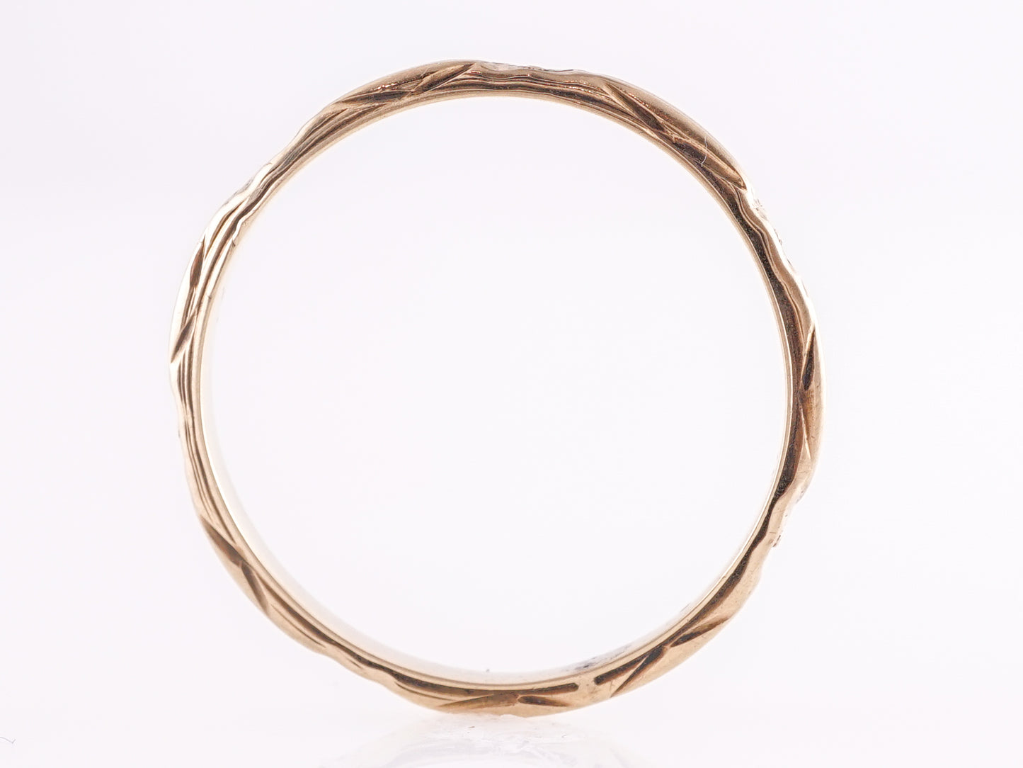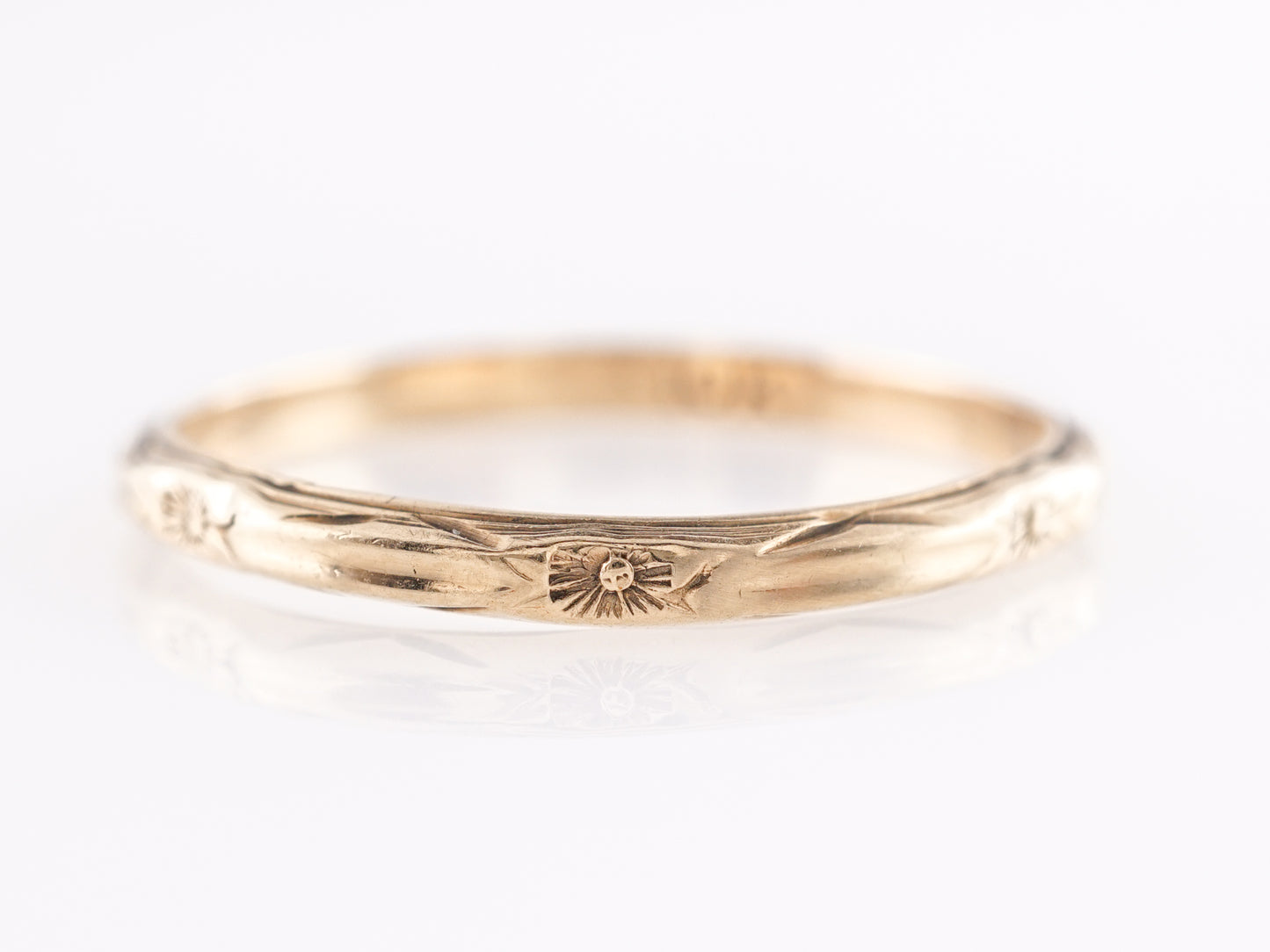 Antique Yellow Gold Orange Blossom Wedding Band in 10k. This vintage Art Deco wedding band features a beautiful linework design in 10k yellow gold. Measuring 1.24mm above the finger and weighing a total of 1.1 grams, this band brings a lighthearted story to your wedding day. The intricate engravings are thoughtful works of art in warm, yellow gold. Wear this band with any solitaire engagement ring or stack with additional yellow gold bands for a more trendy, modern look!
