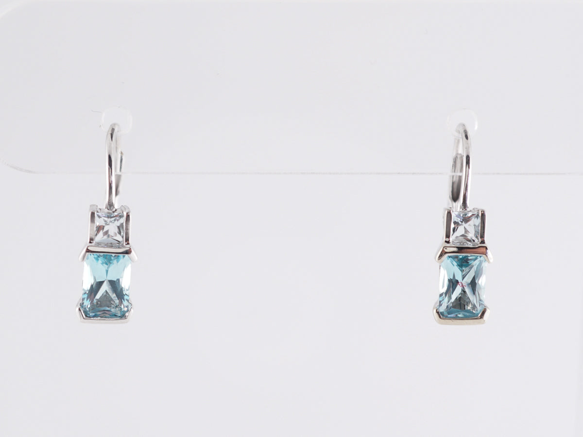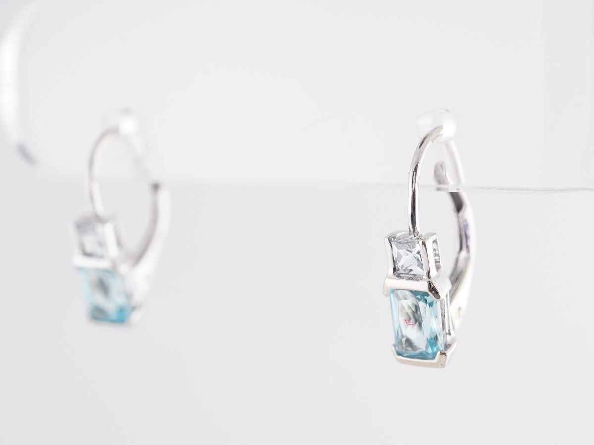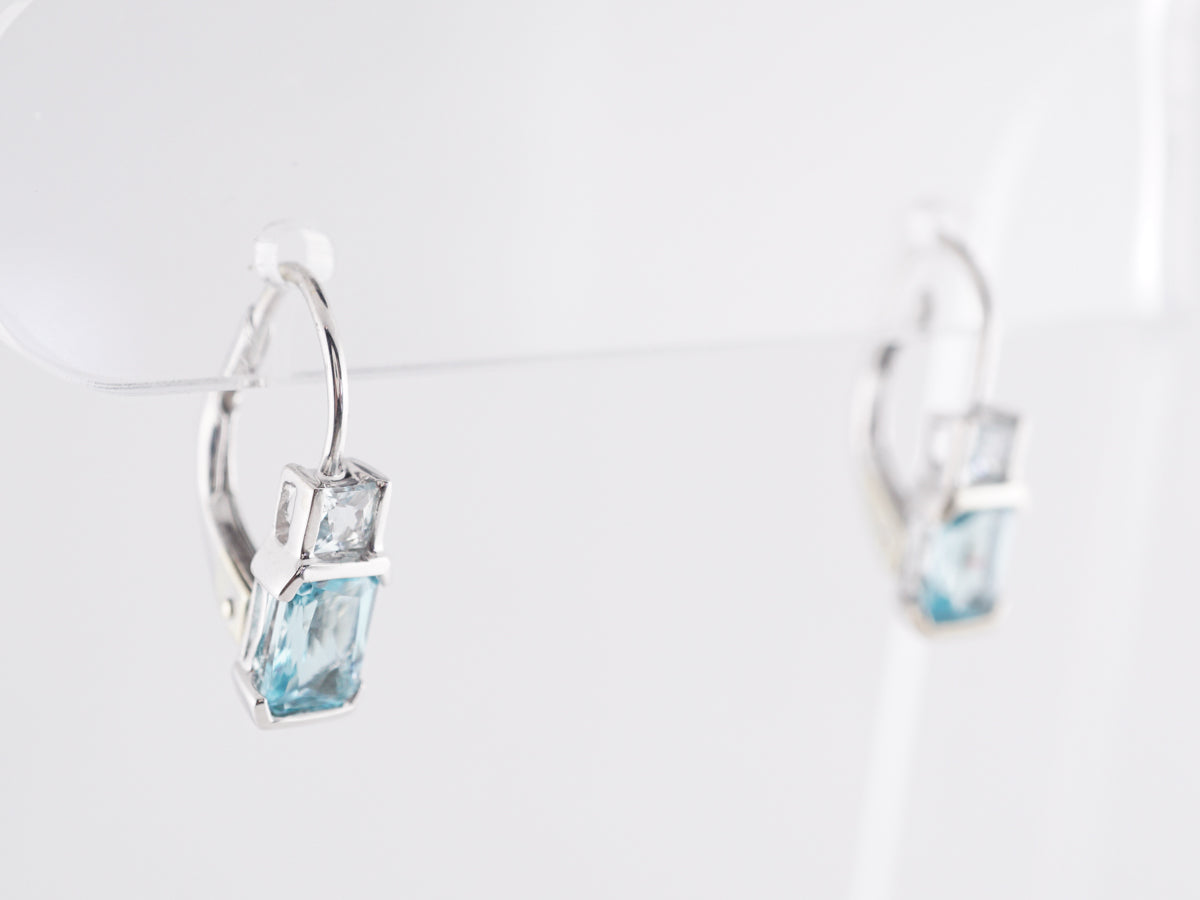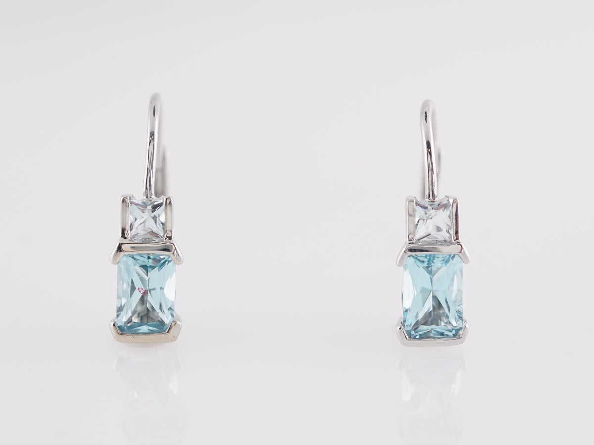Aquamarine Dangle Earrings in 14k White Gold. These darling leverback earrings feature 1.16 carats of aquamarines set in 14 karat white gold. The larger aquamarines are held lower and have a deeper blue color in their radiant cut. Set above are square cut aquamarines that are much paler, giving these earrings some subtle contrast.