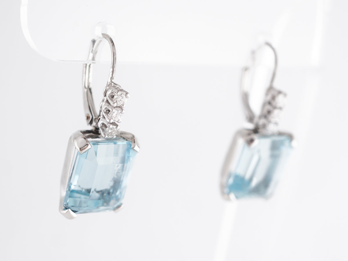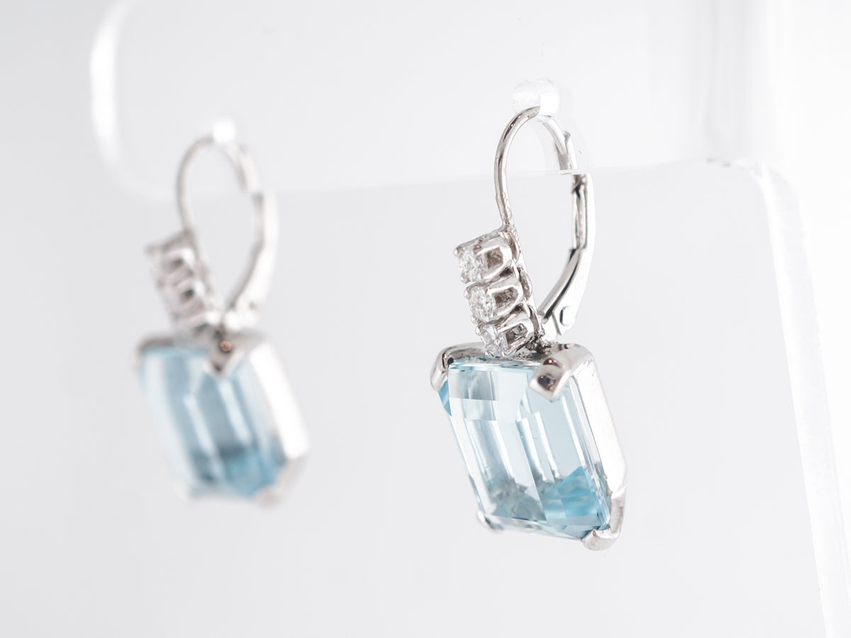 Aquamarine Diamond Earrings in Platinum and 14k.  These drop earrings feature aquamarines and diamonds set in platinum and 14 karat white gold. Each aquamarine weighs 5.54 carats and look beautiful with the added flash of diamonds and the movement you get from the elegant drop setting. A bold and stylish look fit for a fancy evening event, these will be favorites in just about any jewelry collection.