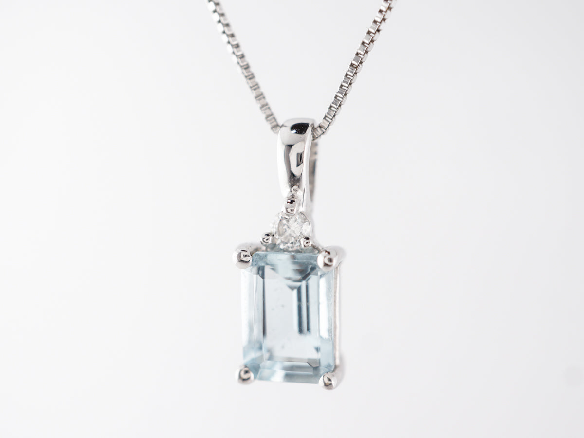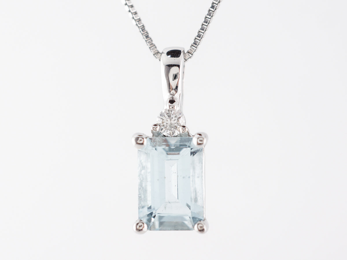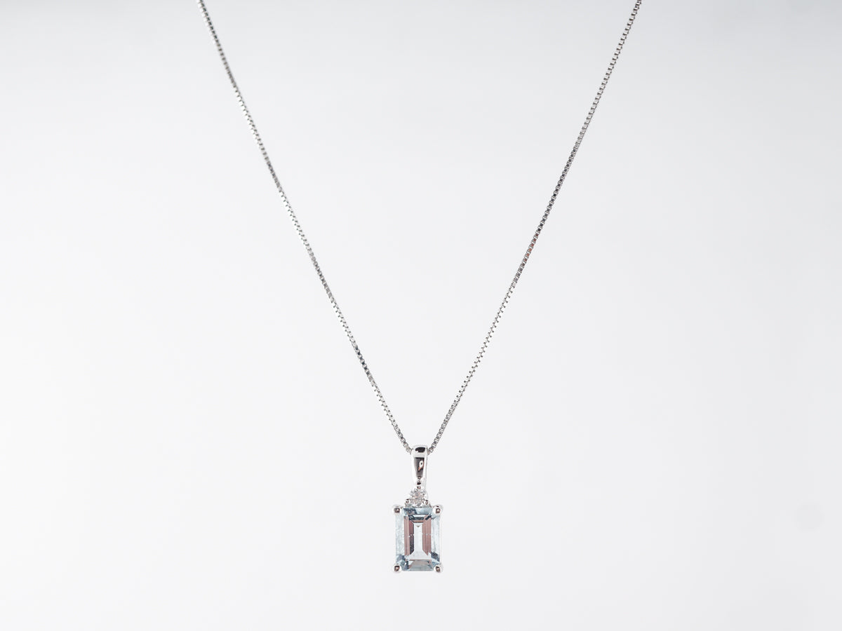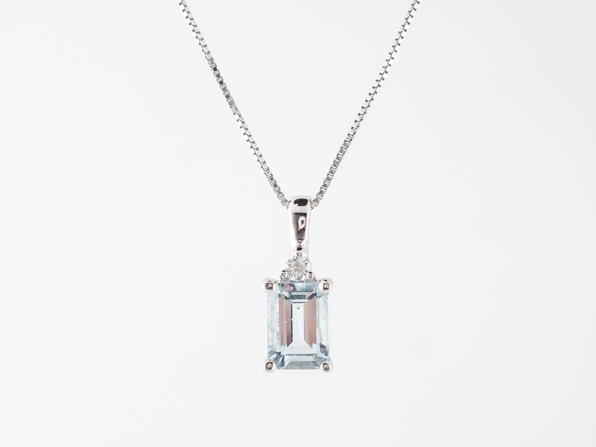Aquamarine Diamond Pendant in 14k White Gold. This joyful little modern necklace features a .78 carat emerald cut aquamarine with a .05 carat round brilliant cut diamond above it set in 14 karat white gold. The thin chain measures 18 inches in length and connects to the aqua with a small slide to allow for a bit of movement.
