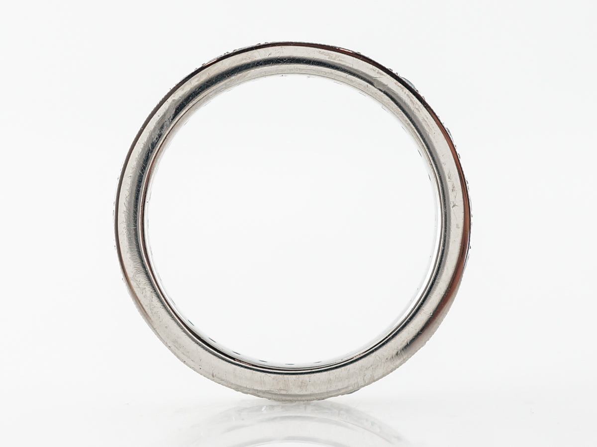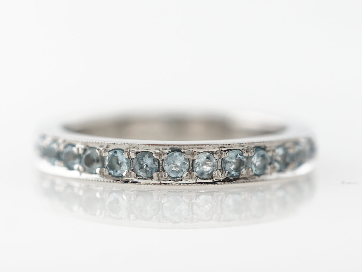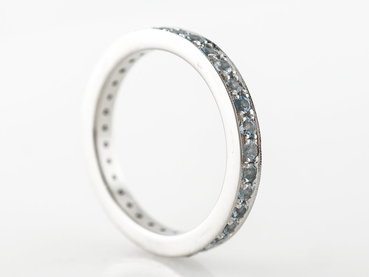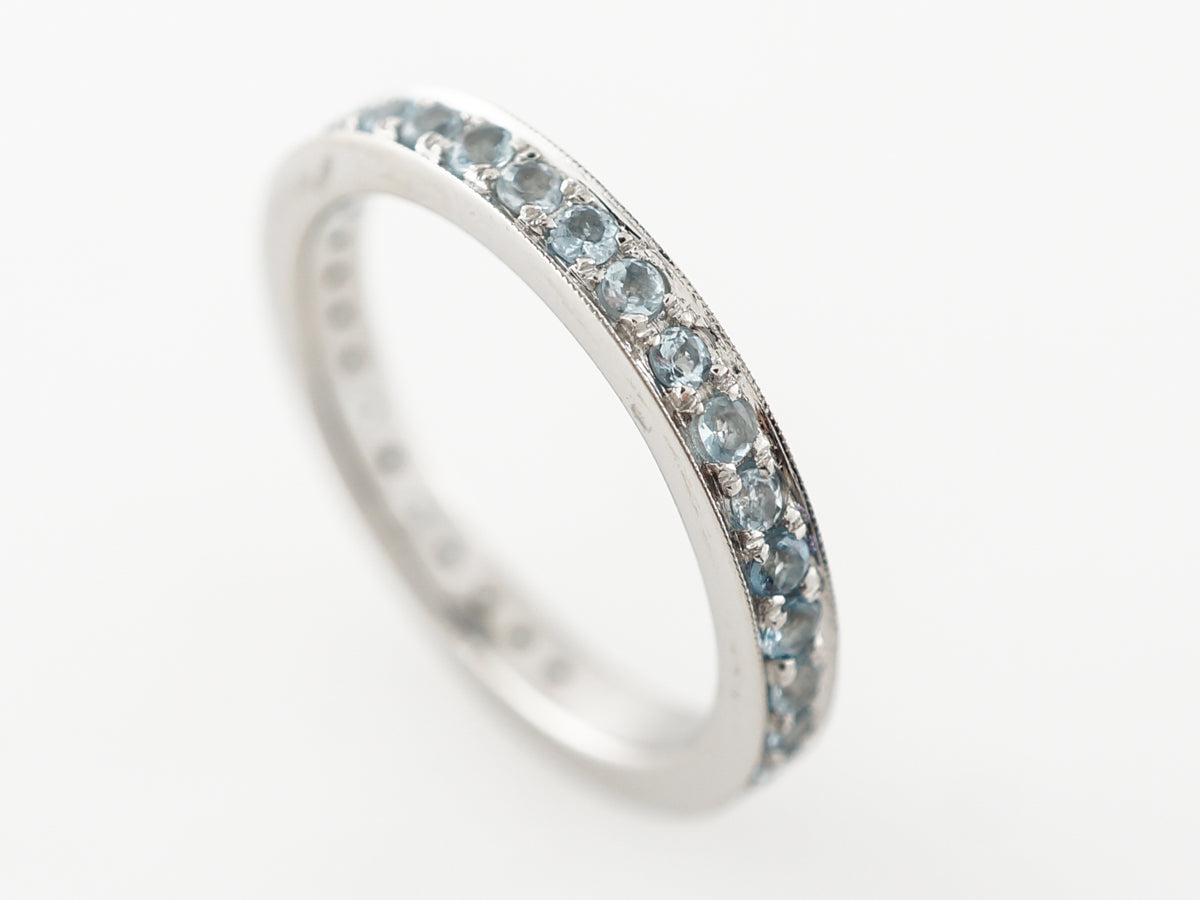 Aquamarine Eternity Wedding Band in Platinum.  This modern aquamarine eternity band is finished in platinum. The aquamarines are prong set and total .33 carats. This band is a perfect way to add a splash of color to your engagement ring or your right hand stack!