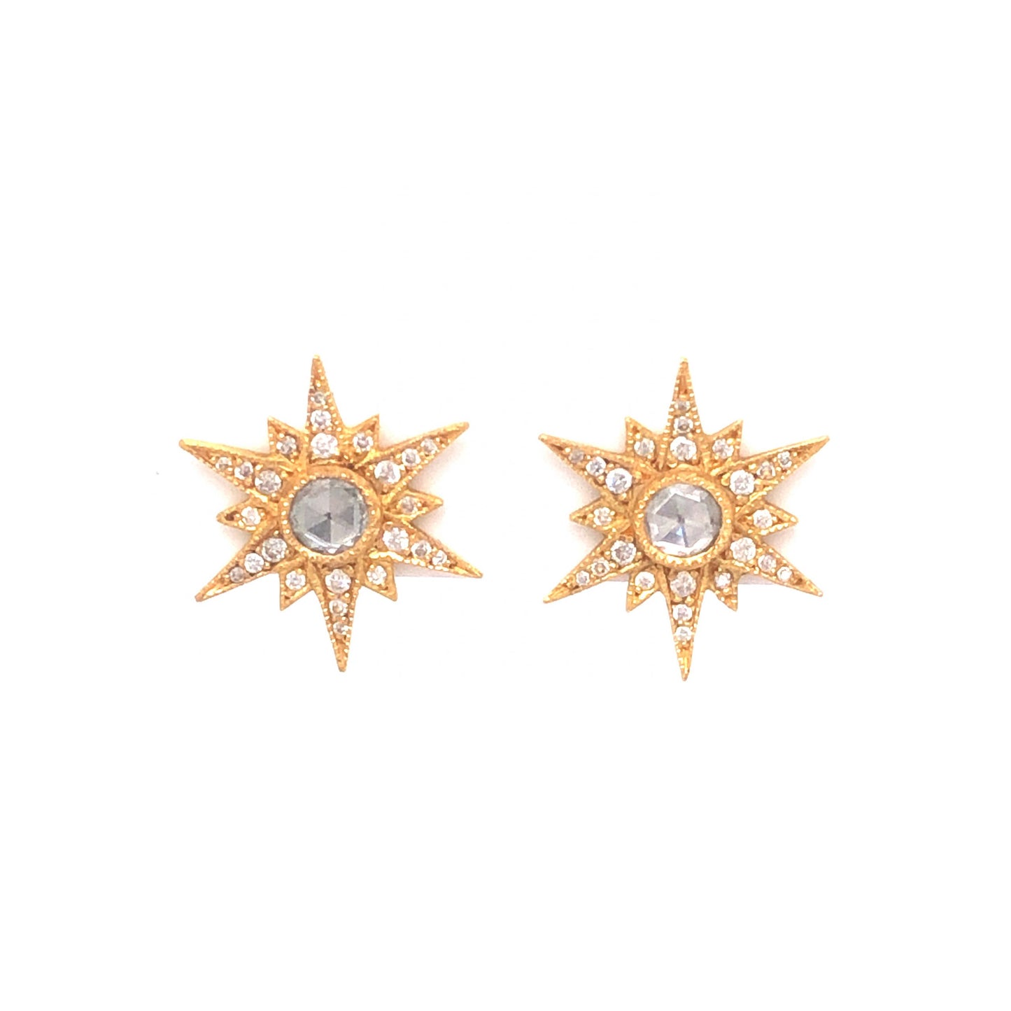 Arman Sarkisyan Diamond Starburst Earrings in 22K Yellow Gold. These designer starburst earrings feature .56 carats of diamonds finished in polished 22k yellow gold. Two (2) rustic rose cut diamonds are bezel set at the center of the studs. An additional forty-eight (48) near colorless Round Brilliant cut diamonds dazzle at every angle. Finished in radiant 22k yellow gold, these festive studs are the perfect gift for any loved one!
