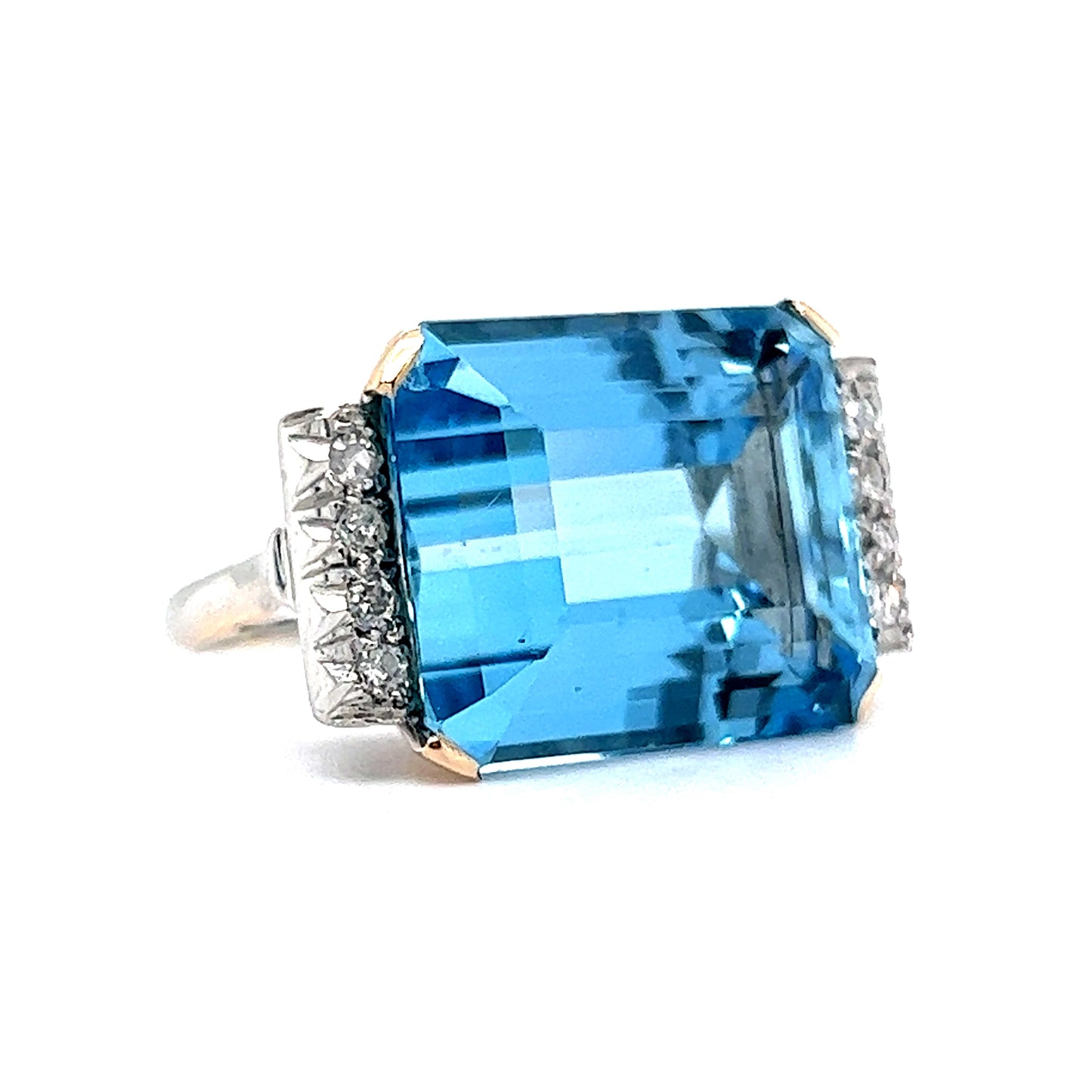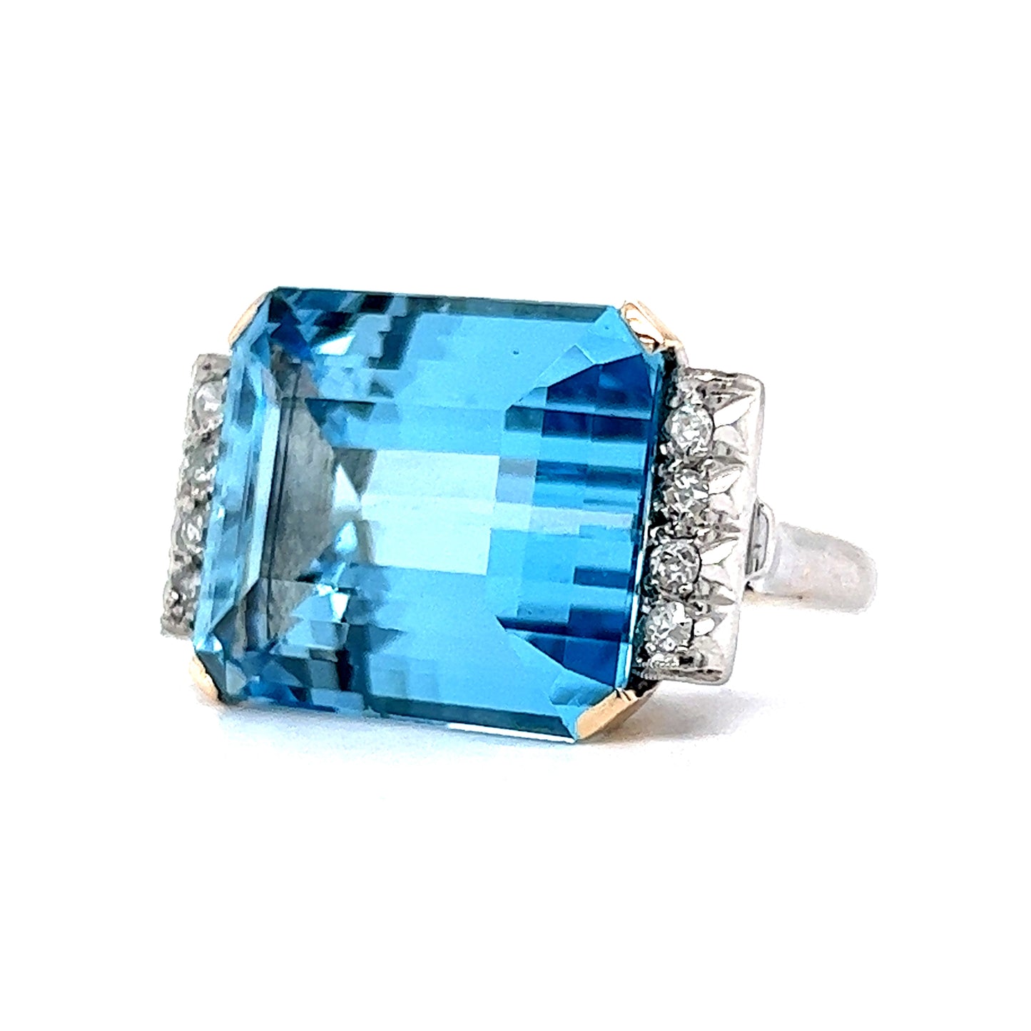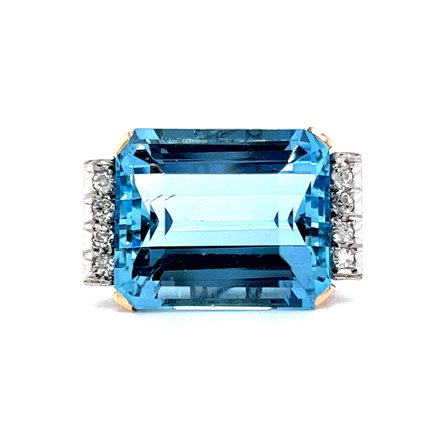 This eye-catching Art Deco cocktail ring features a 15.31 carat blue aquamarine and accent diamonds in 14 karat yellow gold and platinum. The impressive emerald cut aquamarine reflects a medium sky blue hue. Eight (8) .02 carat single cut white diamonds accent the shoulders of the band. From the profile, a retro-futuristic Art Deco basket holds the collection of gemstones finished on a platinum band. Chic, colorful, and one of a kind.