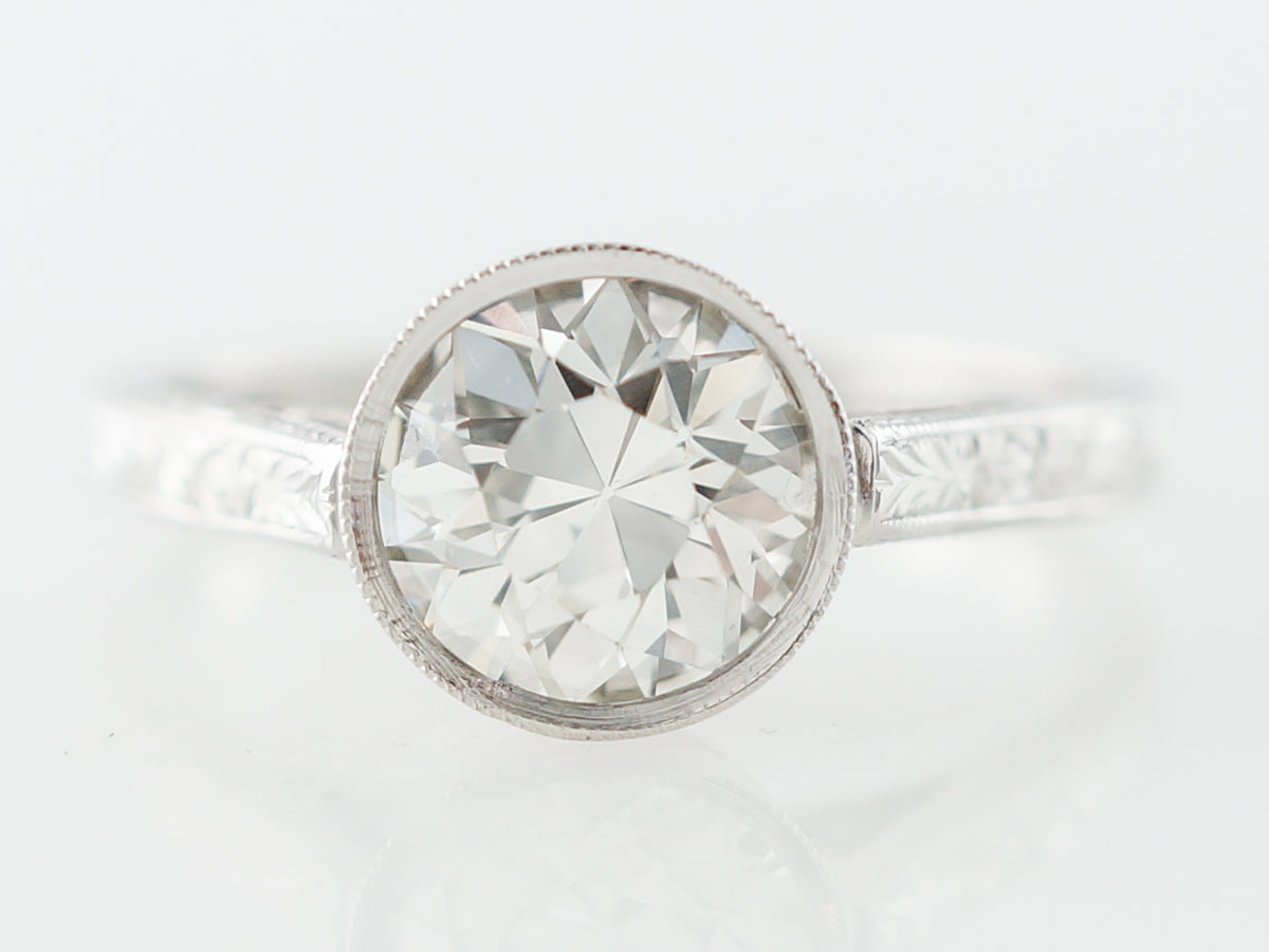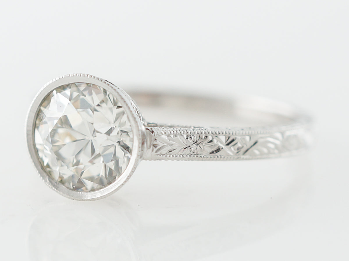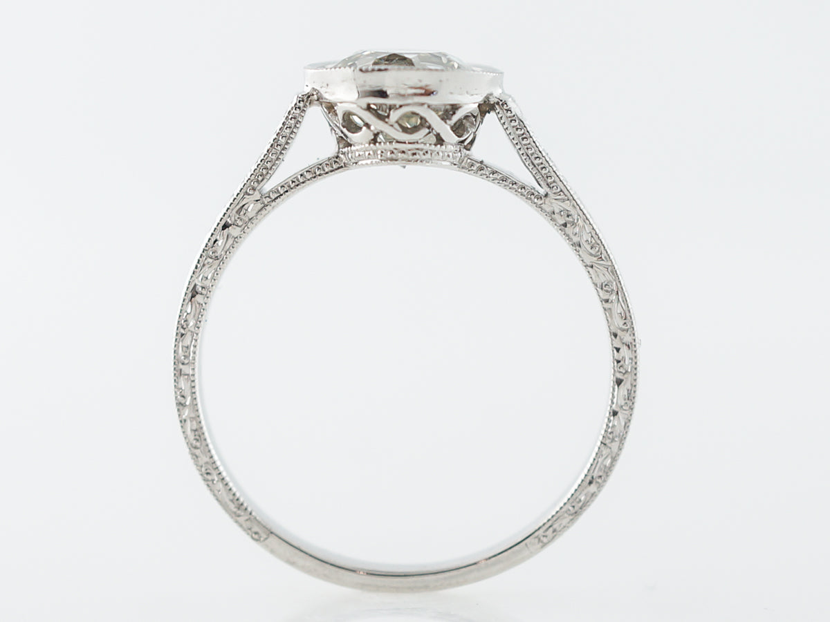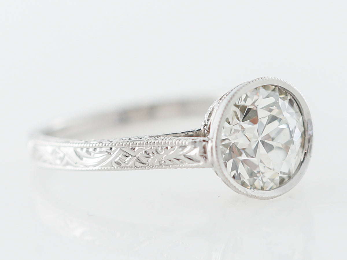 Art Deco Bezel Solitaire Engagement Ring in Platinum. This original antique art deco engagement ring features a 1.38 carat old European cut diamond in a bezel setting. The diamond sits low to the finger, making it very easy to wear. The bezel has milgrain detailing for texture and the ring shank has beautiful engraving on all three sides.