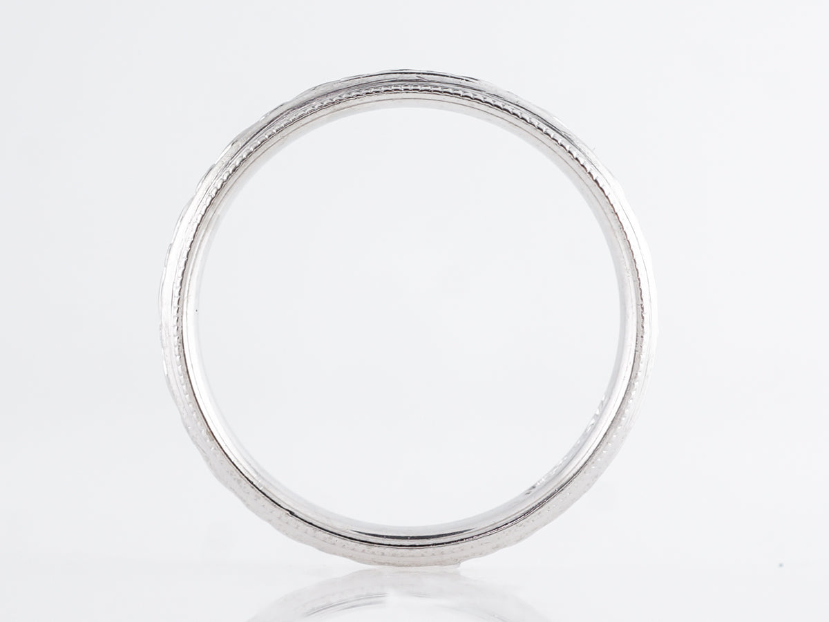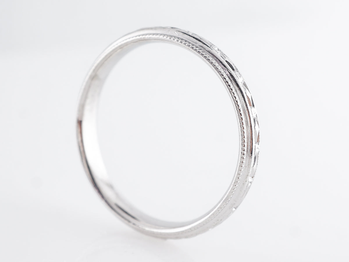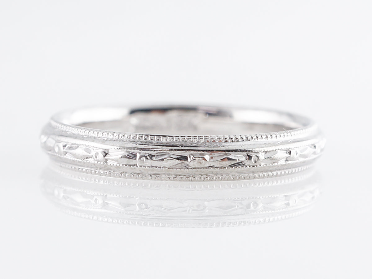 Art Deco Blossom Wedding w/ Milgrain Band in 18K. This original vintage Art Deco wedding band features beautiful orange blossom engraving around the entirety of the band. Finished in 18k white gold with milgrain borders, this band will pair nicely with a vintage engagement ring or even a modern ring if your looking for a touch of vintage!