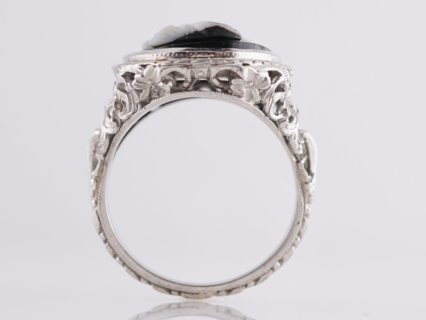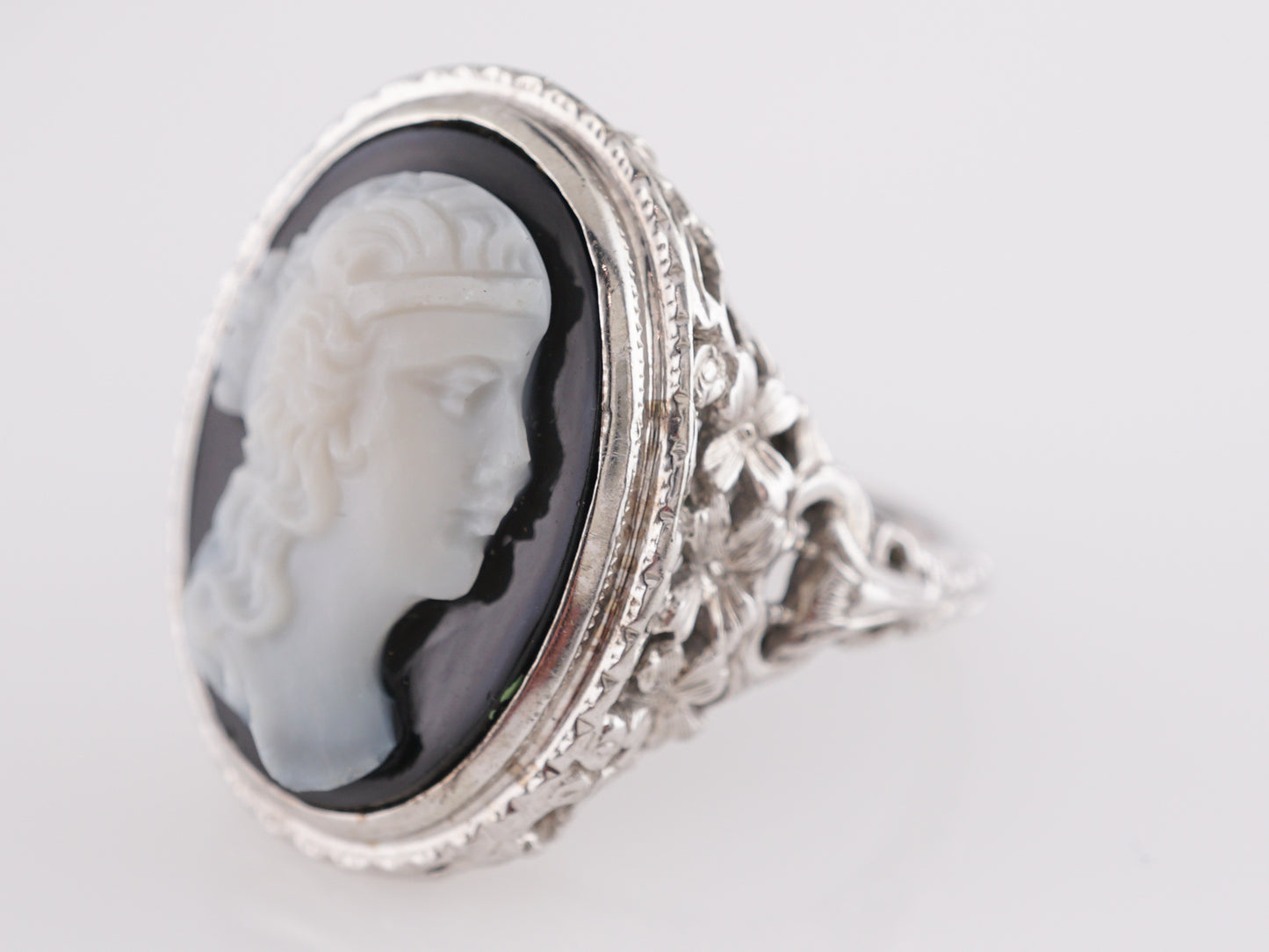 This one of a kind Art Deco ring features a decorative silhouette in black onyx and 18k white gold. The pearly profile resembles a mysterious woman with flowing locks and is set into a reflective, black onyx mounting. An engraved, Art Deco milgrain pattern stretches all around the exterior shank, featuring a beautiful pattern of flowers and petals engraved in shimmering 18k white gold. This cameo would make a stunning family heirloom or gift for any loved one. A beautiful time capsule from the early 20th century!