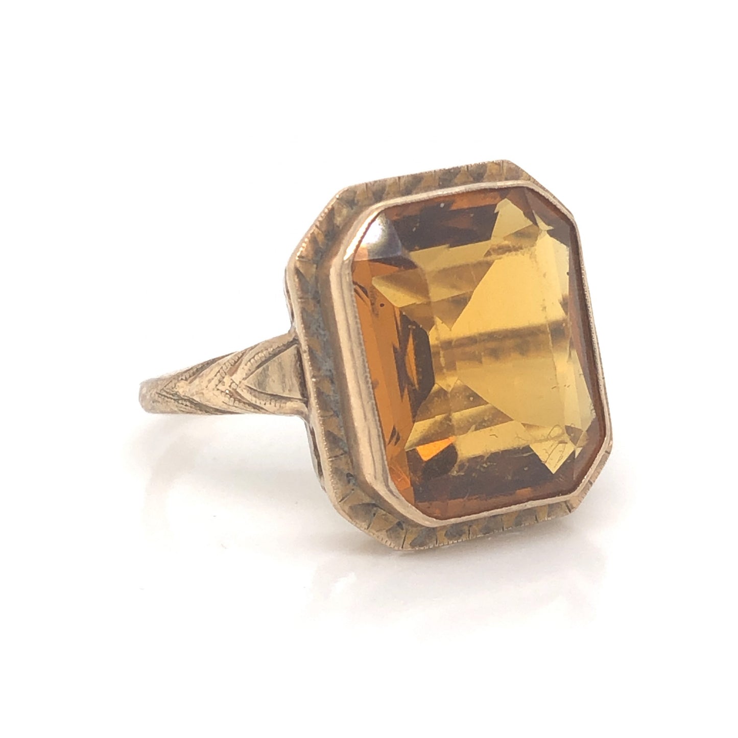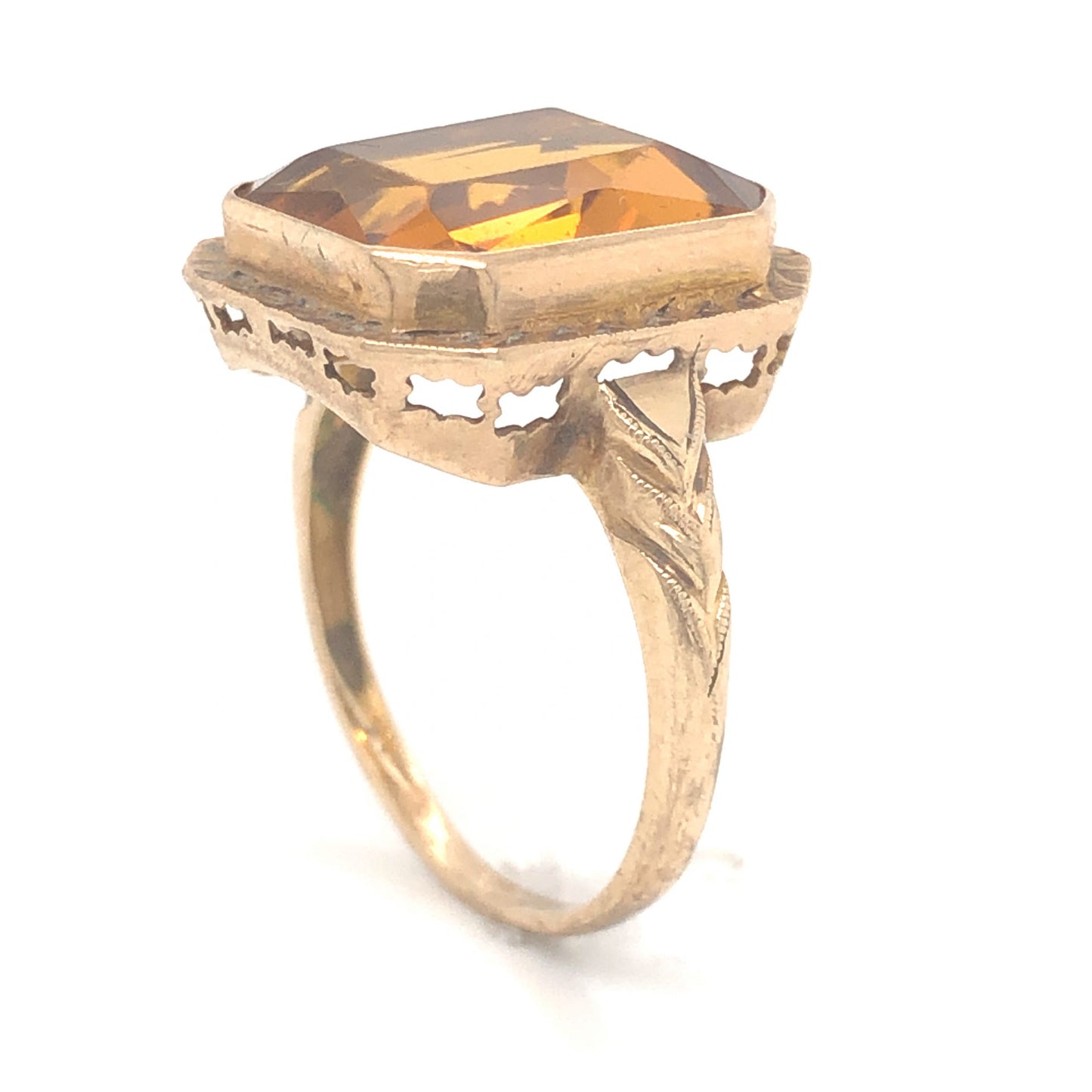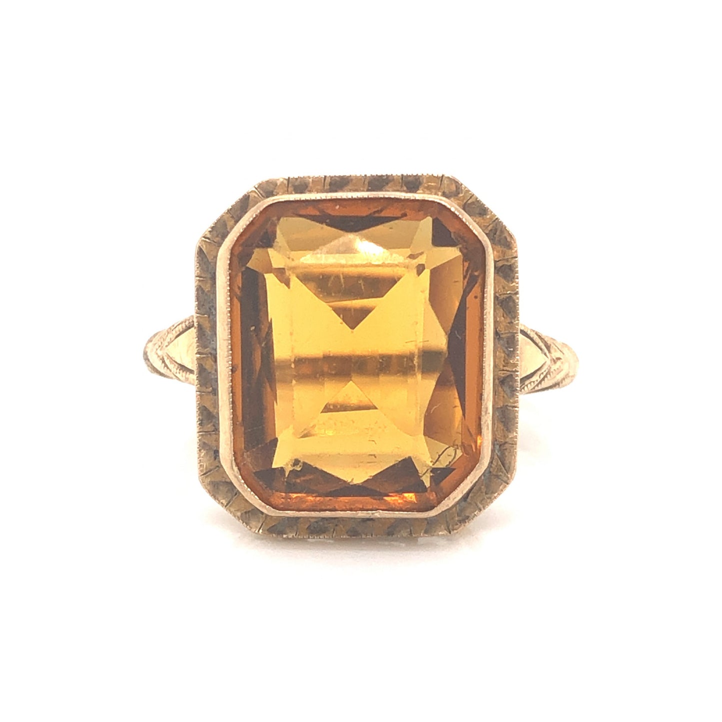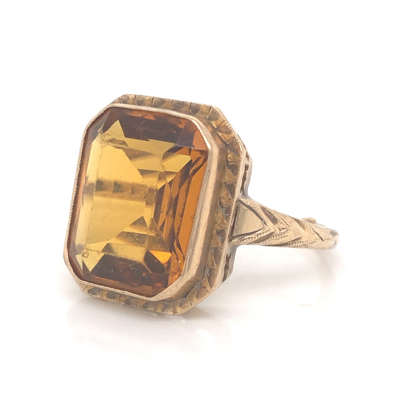 Art Deco Citrine Cocktail Ring in 14k Yellow Gold. This enchanting, one of a kind Art Deco ring features a 6.03 carat citrine in 14 karat yellow gold. The citrine has a medium, golden-amber hue. The center stone is set in form-fitting bezel with vintage open work cut outs on the gallery rail. The shoulders of the band feature Art Deco style engravings with fine milgrain details. This striking cocktail ring is sure to bring a little warmth to your jewelry box!