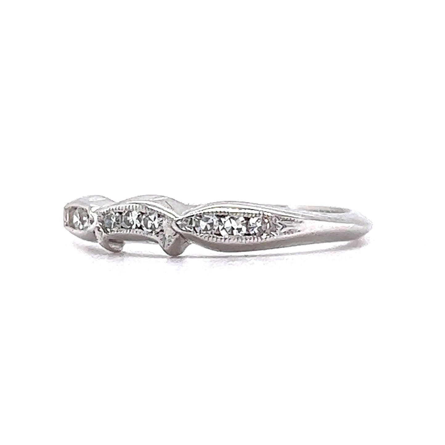 Art Deco Contoured Diamond Wedding Band in 18k White Gold. This unique Art Deco wedding band features .072 carats of sparkling diamonds on a contoured 18 karat white gold band. Nine (9) near colorless diamonds are set on paisley-inspired Art Deco forms. With structure and style, this ring has more than meets the eye. The diamonds are channel set with delicate milgrain details on the softly tapered 18K white gold band.