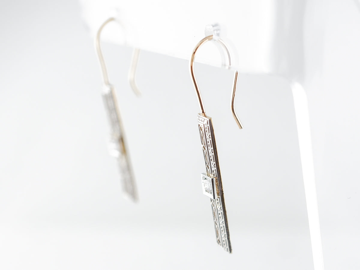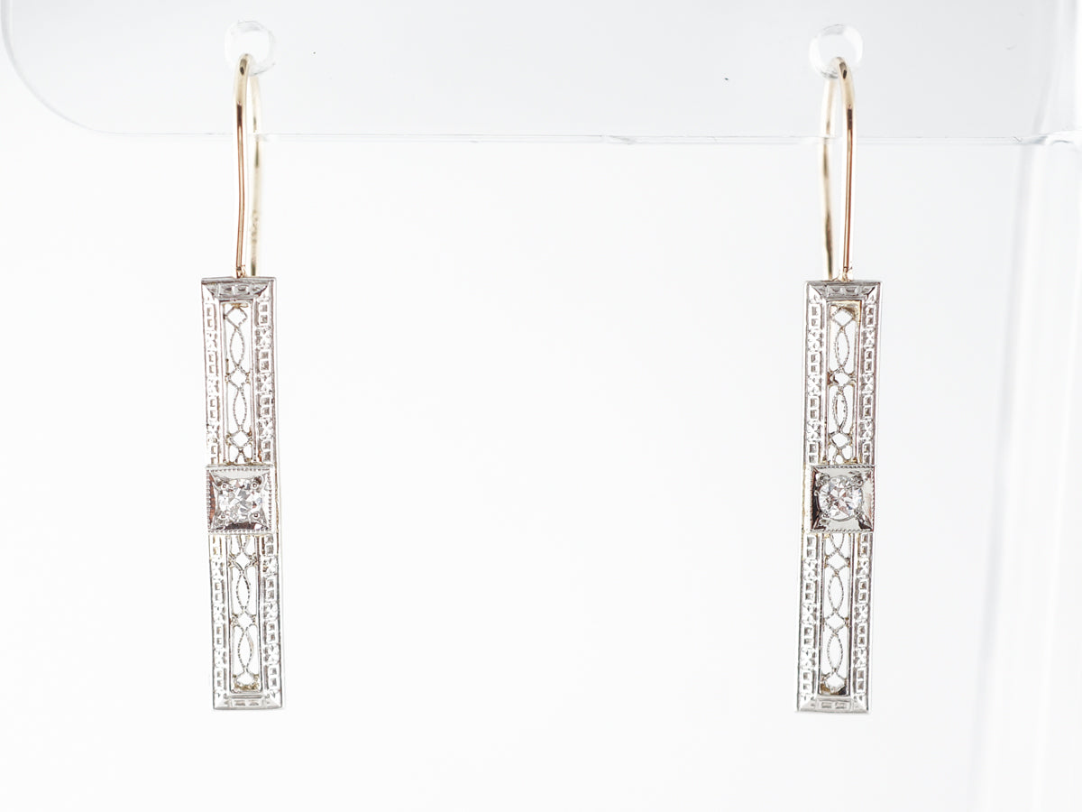 Art Deco Dangle Earrings w/ Diamonds in Yellow White Gold. These incredible Art Deco earrings contain .08 carats of Old European cut diamonds and are set in 14 karat white gold with 14 karat yellow gold ear wires. The vertical design is filled with delicate and ornate filigree wire work, crossing across open sections around the diamonds. These would make a fabulous gift for someone who loves vintage jewelry.