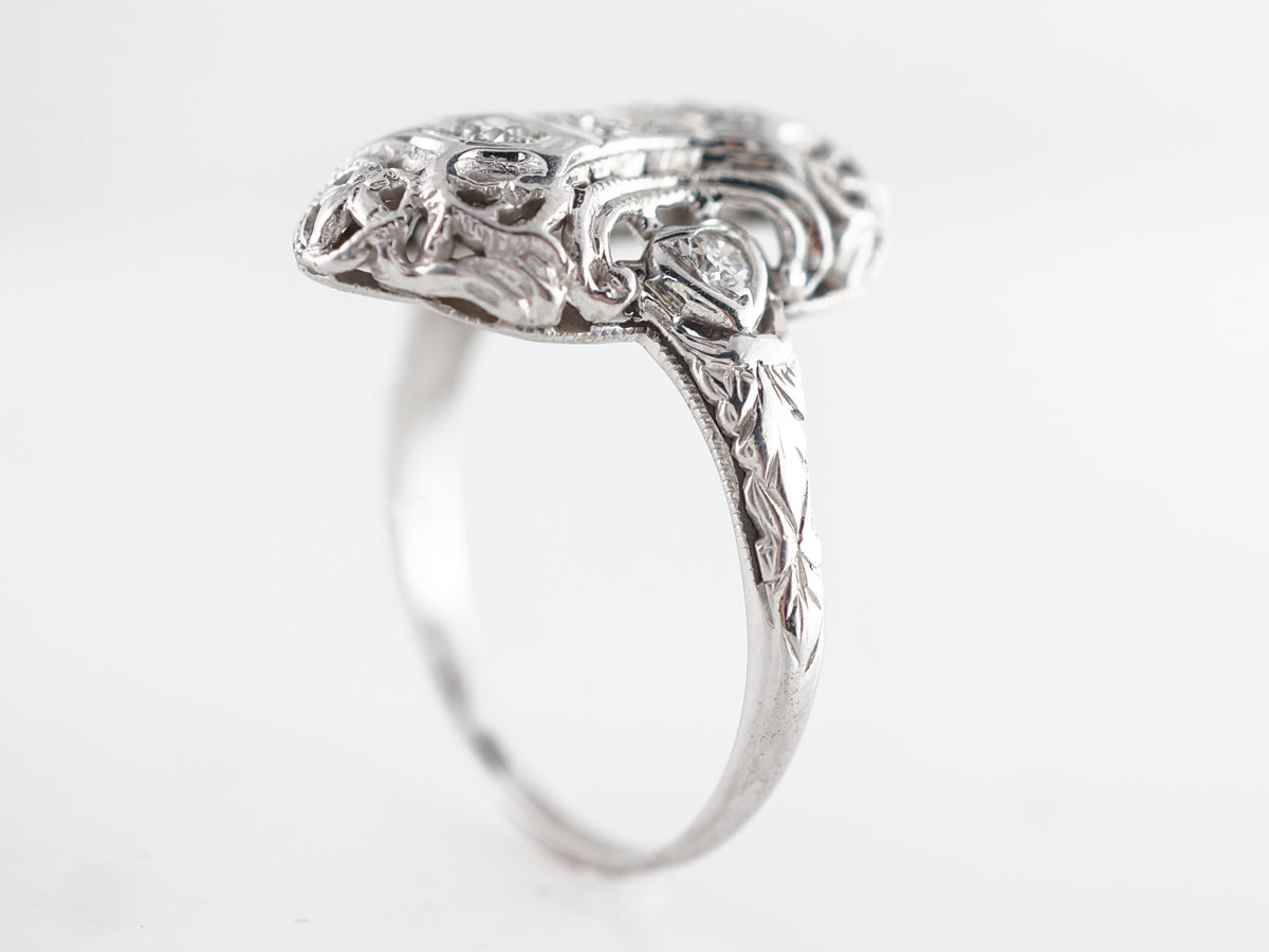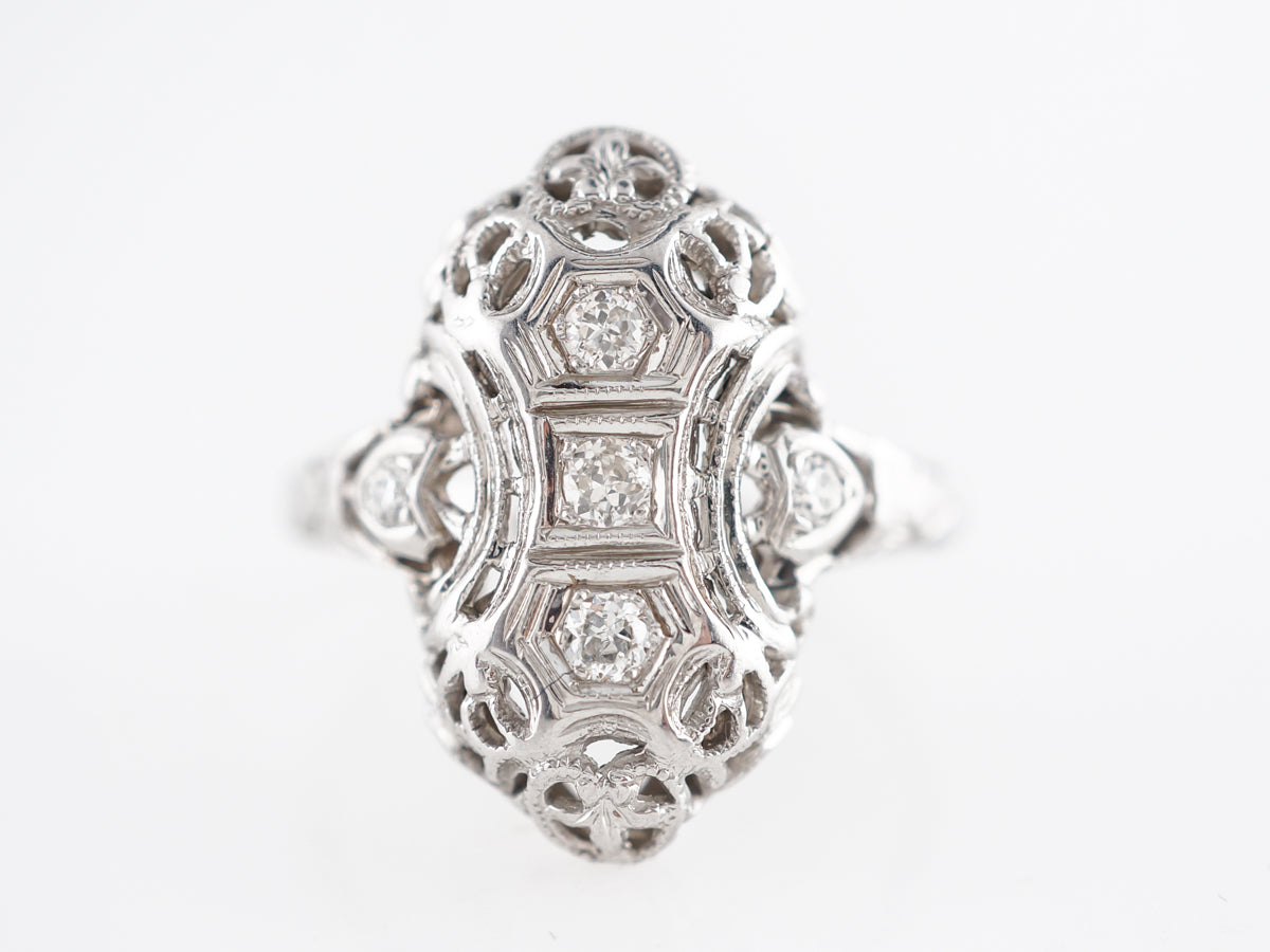 Art Deco Diamond Cocktail Ring in 18k White Gold. A splendid Art Deco statement ring featuring .18 carats of Old European and single cut diamonds set in 18 karat white gold. The domed navette shape has an almost honeycomb-like appearance created by the lattice of filigree wires. The diamonds are beautifully set in stations down the length of the mounting.