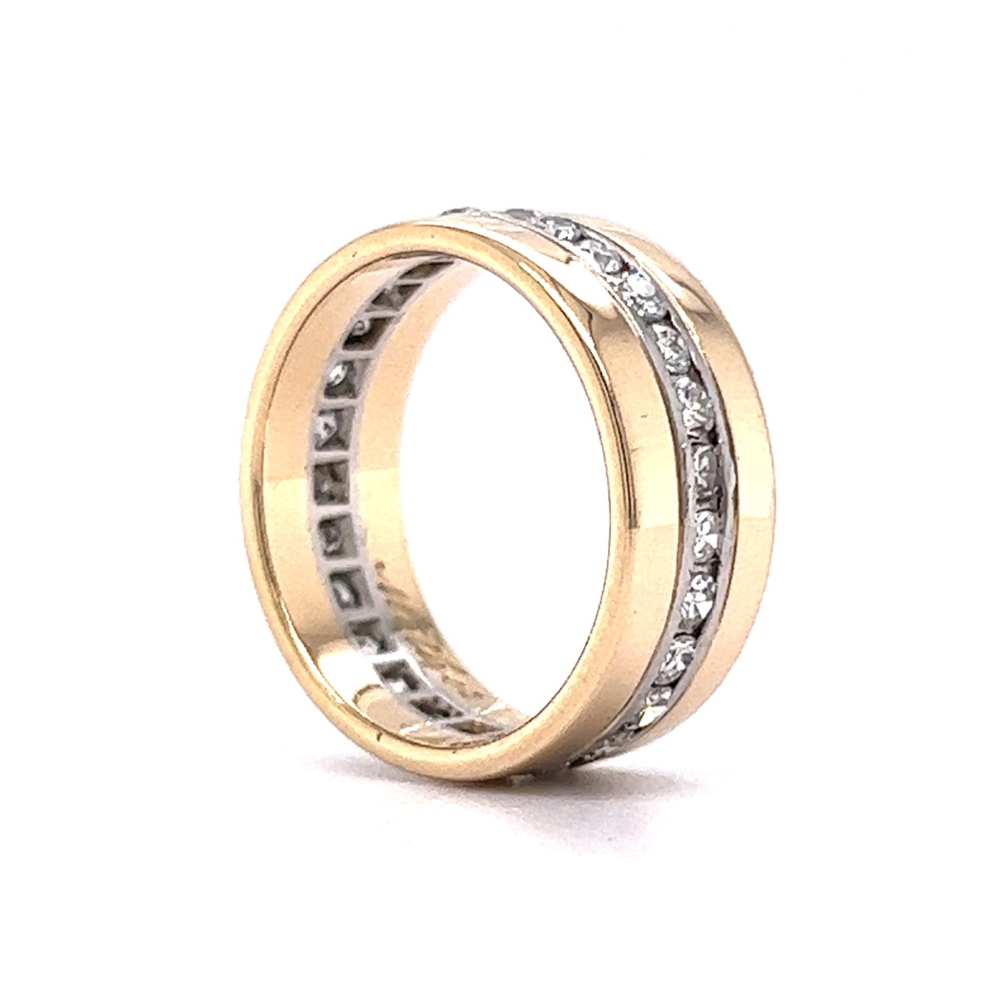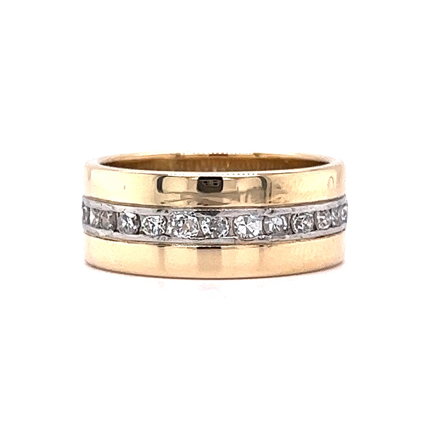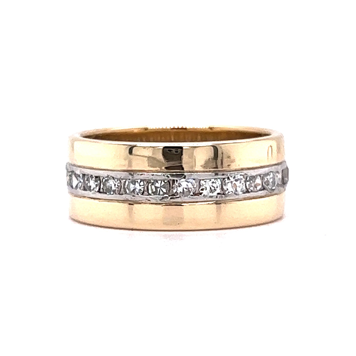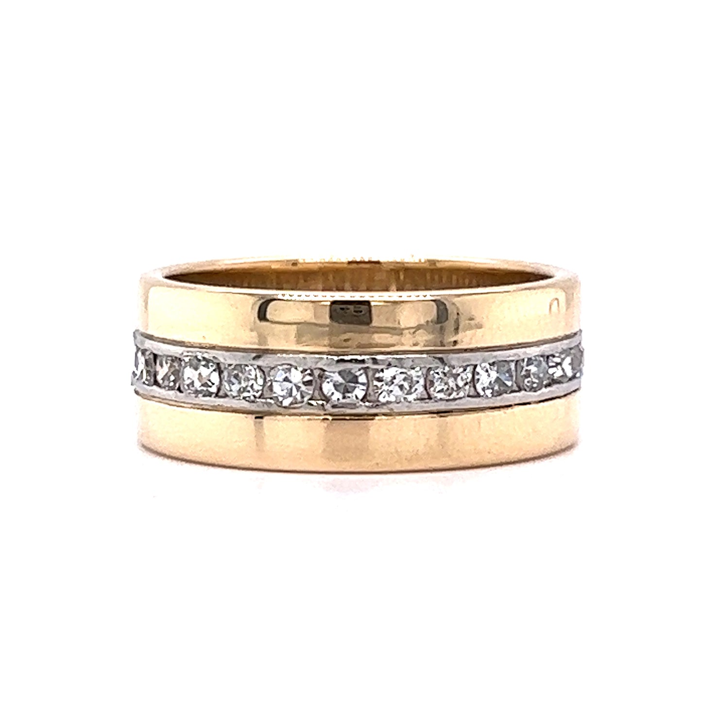 This fine Art Deco wedding band is finished in platinum and 14 karat yellow gold, and features 1.00 carats of single cut diamonds. The diamonds are channel set in the center platinum section and are flanked by thick borders of yellow gold. The band measures 7.85mm in width, which provides ample space to make a big impression on the finger. Chic stylish.