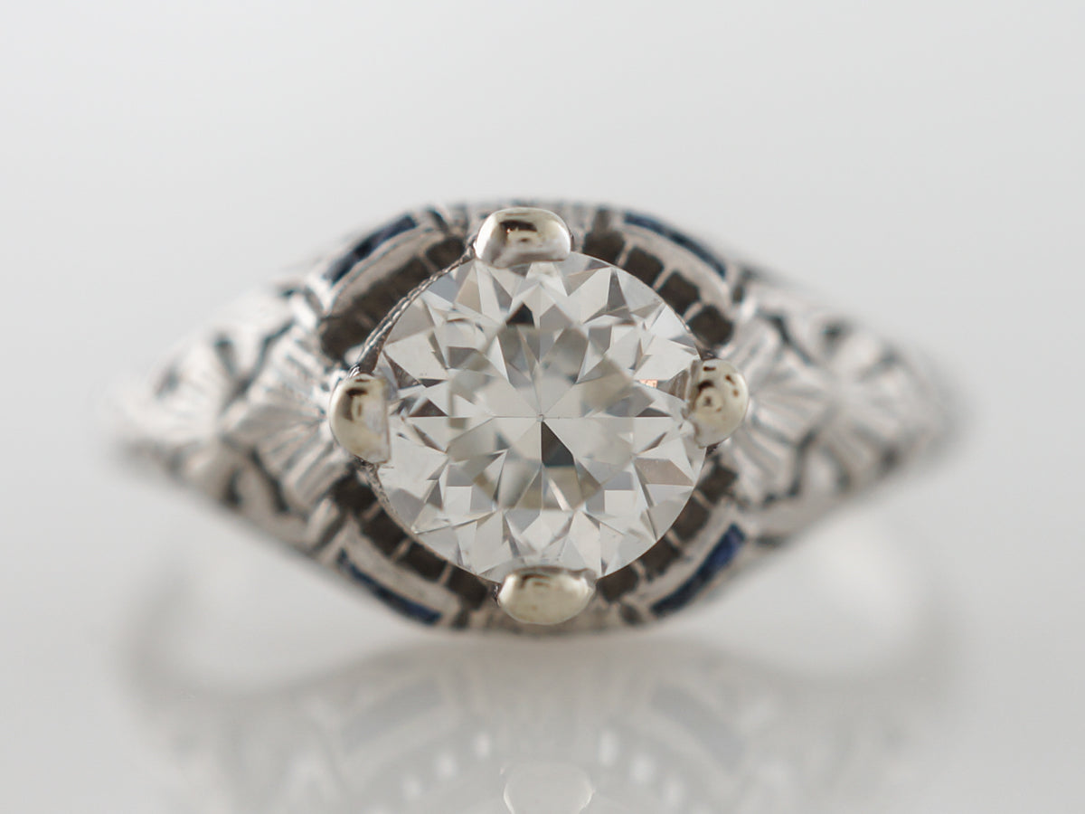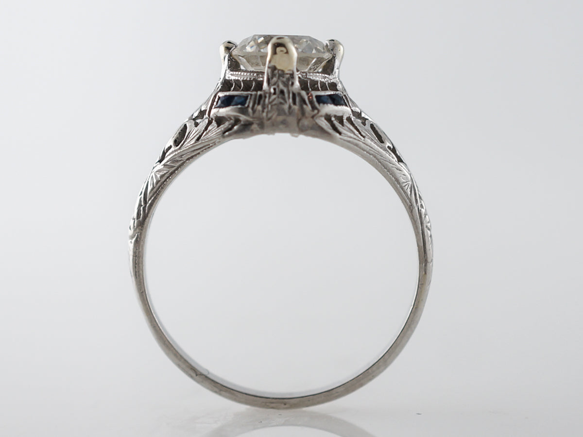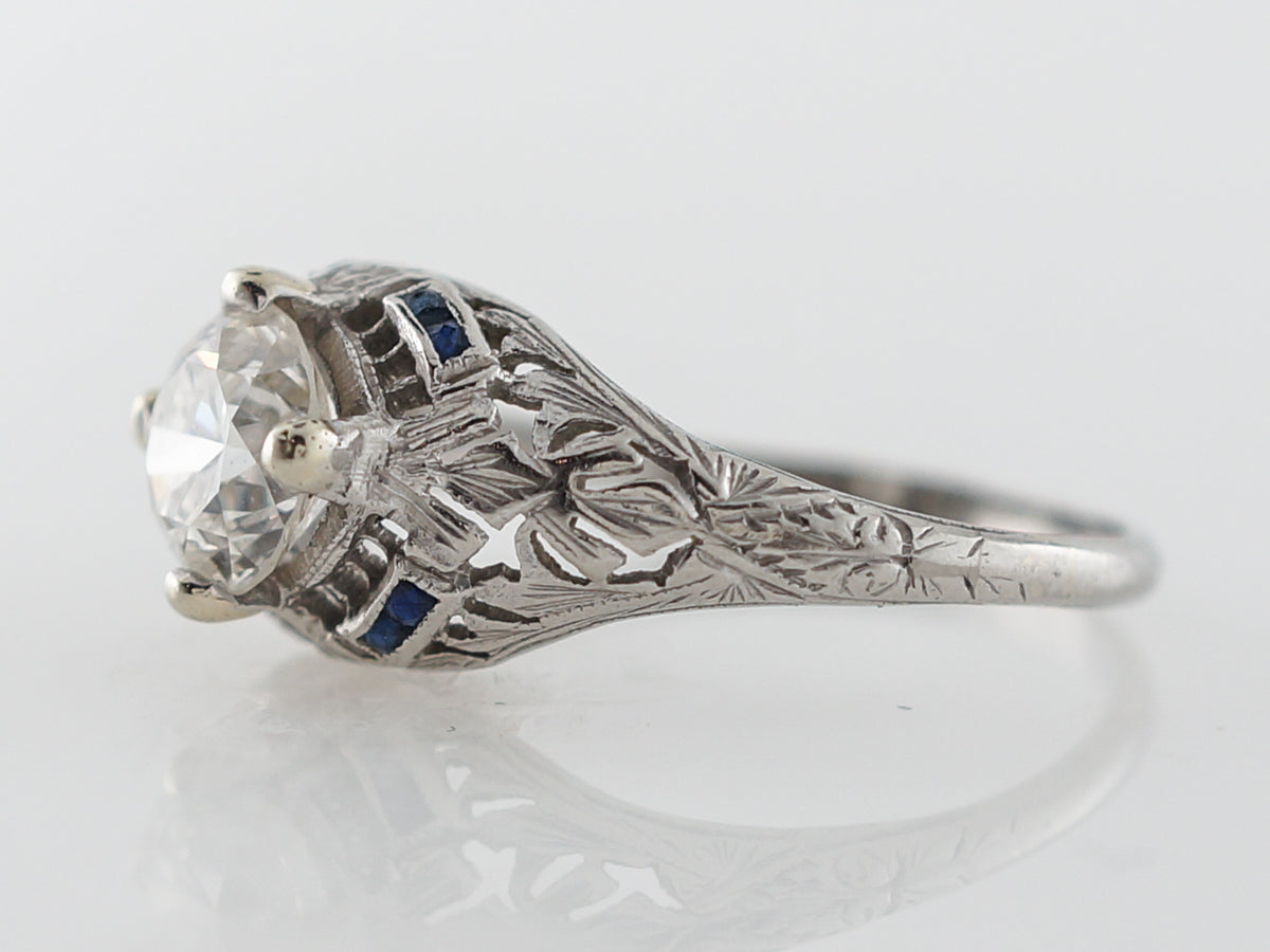 Art Deco Diamond Sapphire Engagement Ring in Platinum. This original antique Art deco diamond engagement ring features a .96 carat round brilliant diamond set in platinum,. The center diamond is accented with square step cut natural sapphire in platinum channels visible from the gallery and side profile. The antique platinum ring is highlighted with open filigree work and an engraved detail.