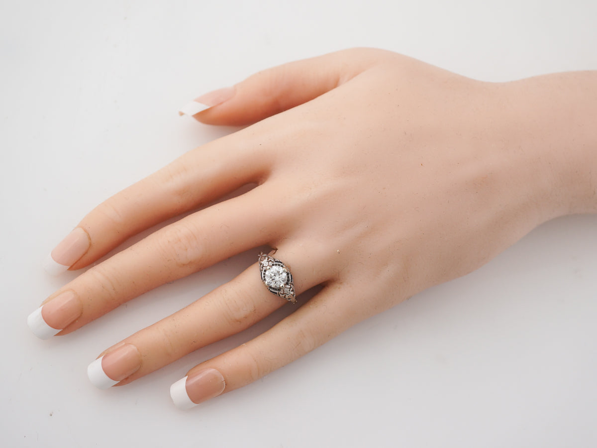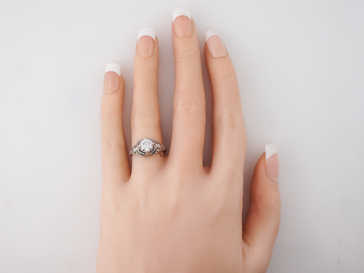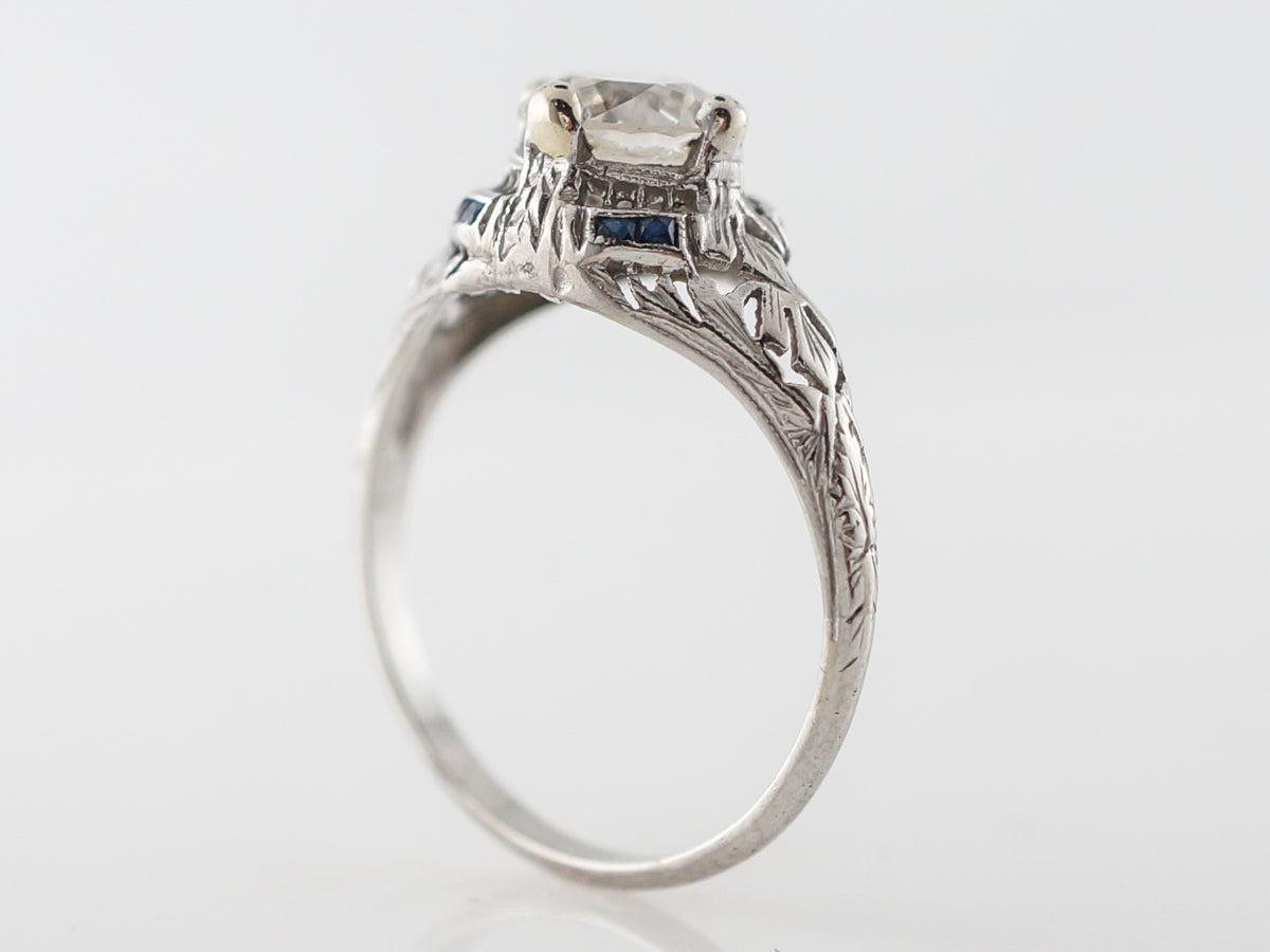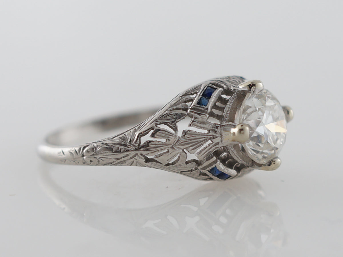 Art Deco Diamond Sapphire Engagement Ring in Platinum. This original antique Art deco diamond engagement ring features a .96 carat round brilliant diamond set in platinum,. The center diamond is accented with square step cut natural sapphire in platinum channels visible from the gallery and side profile. The antique platinum ring is highlighted with open filigree work and an engraved detail.