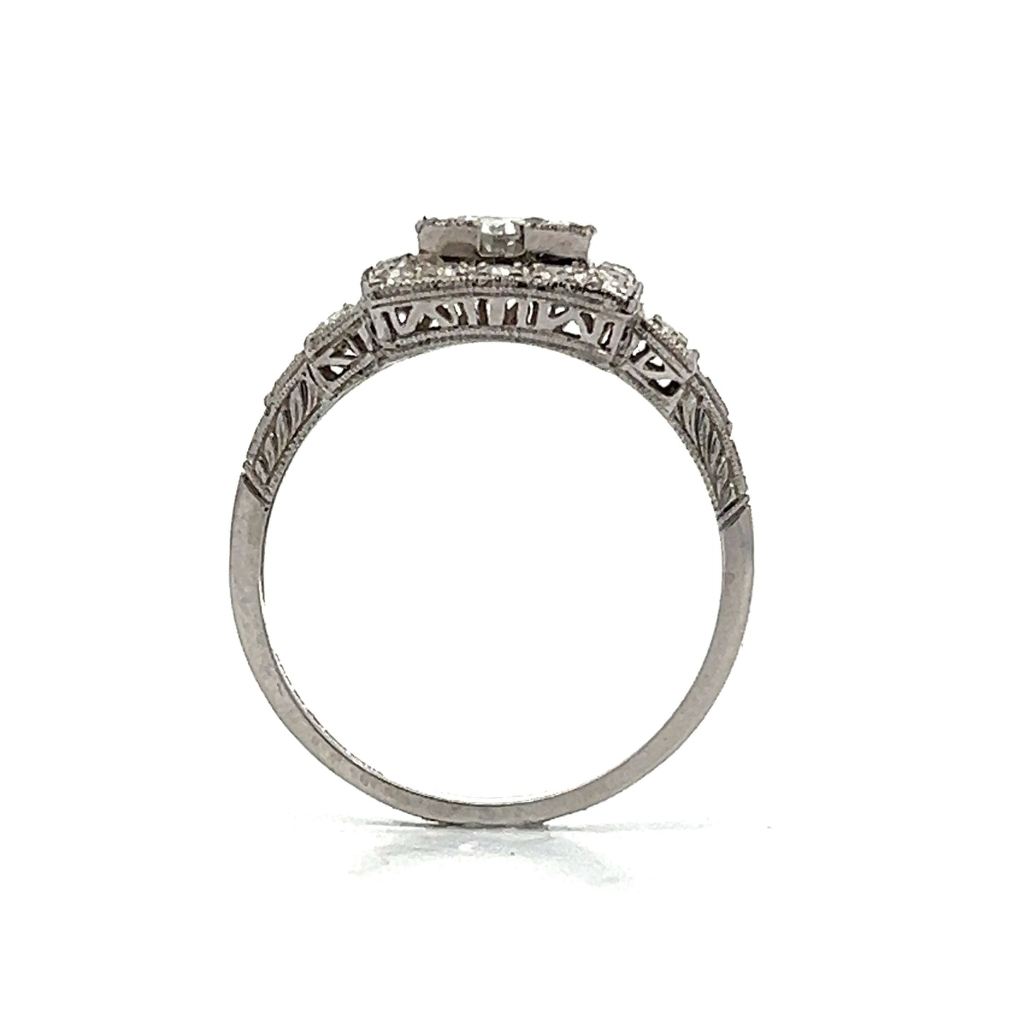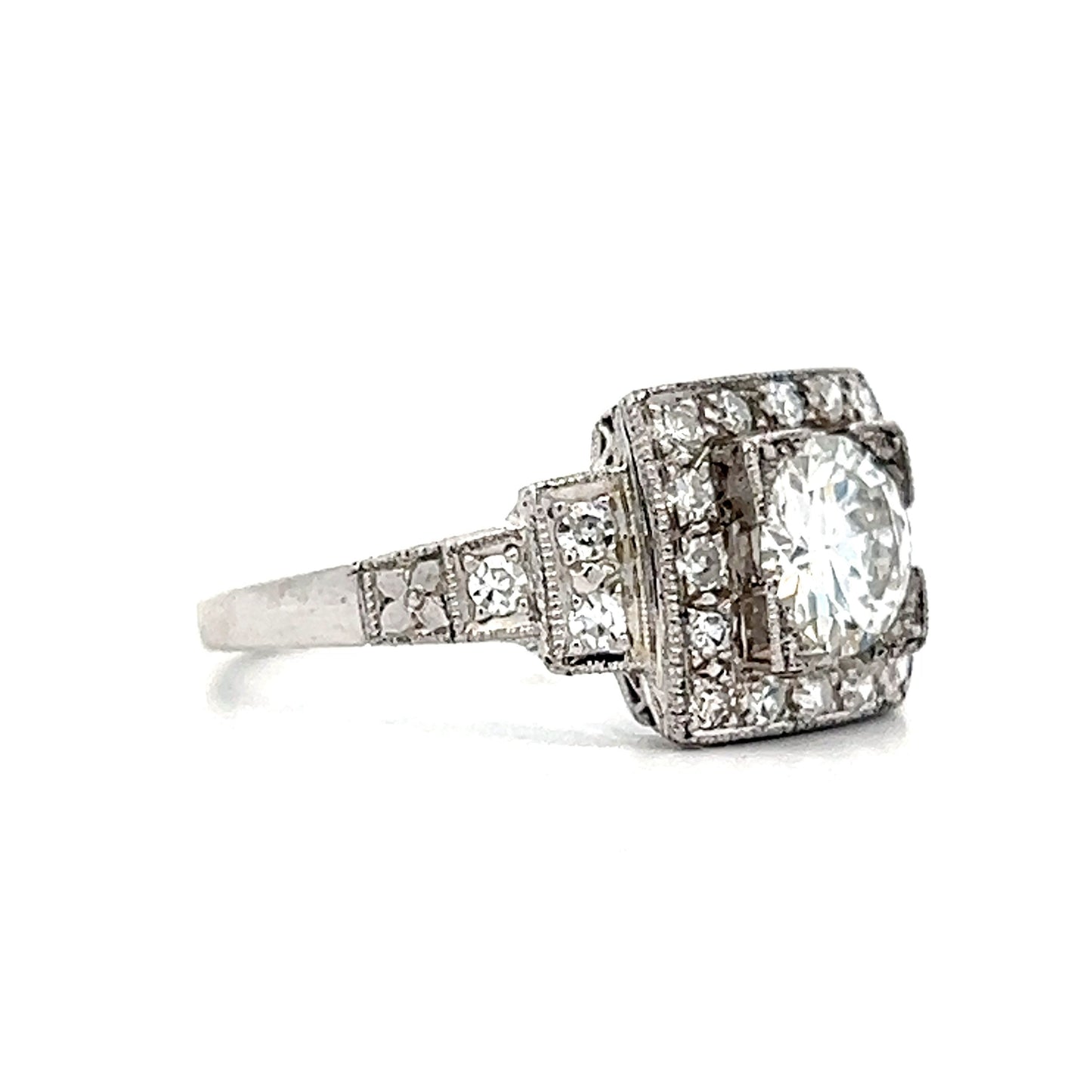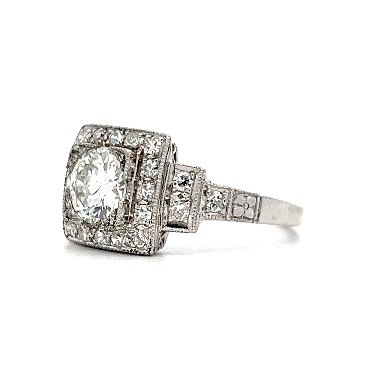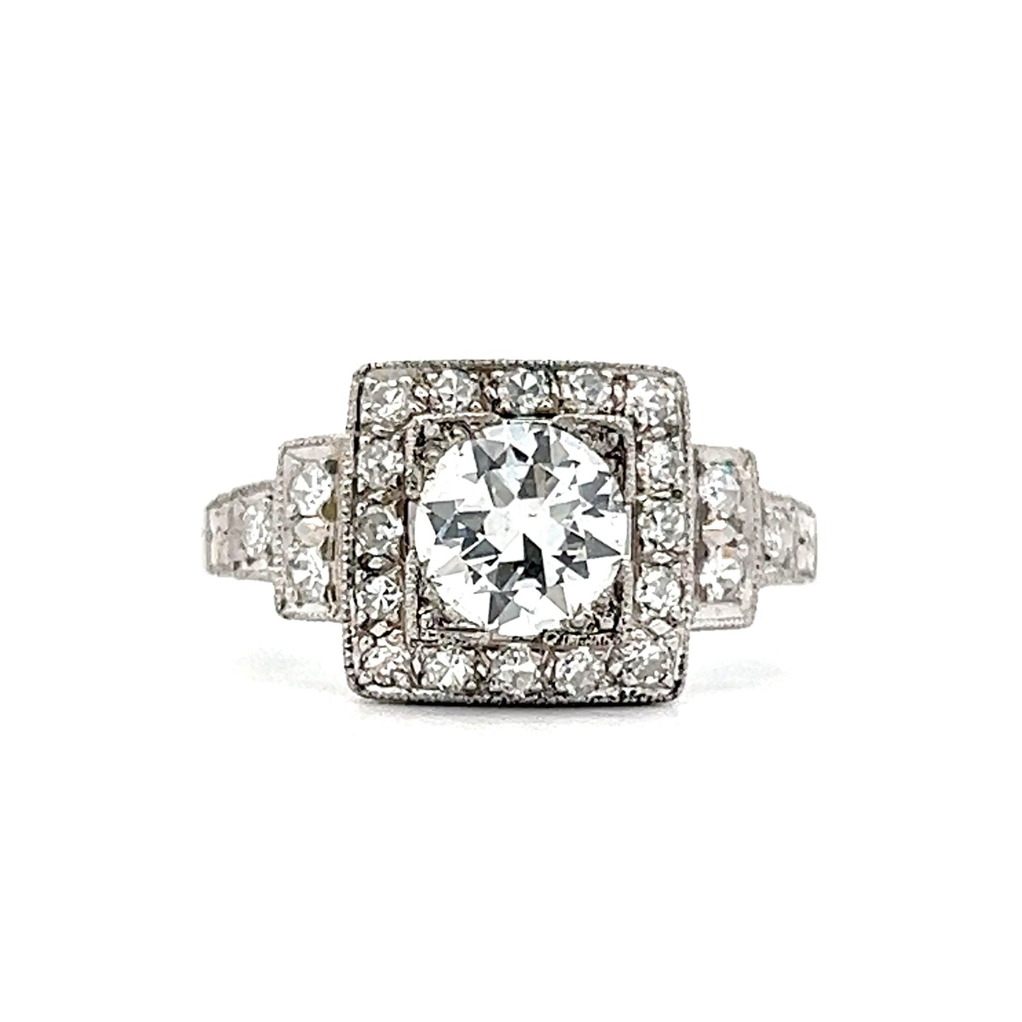 This original Art Deco diamond engagement ring features a gorgeous "step" design. The center stone is a .80 carat old European cut diamond that is accented by a square halo of single cut diamonds. The diamonds are further accented by beautiful milgrain detailing that adds just a hint of texture. Finished in platinum, this ring is quite special for its incredible condition.