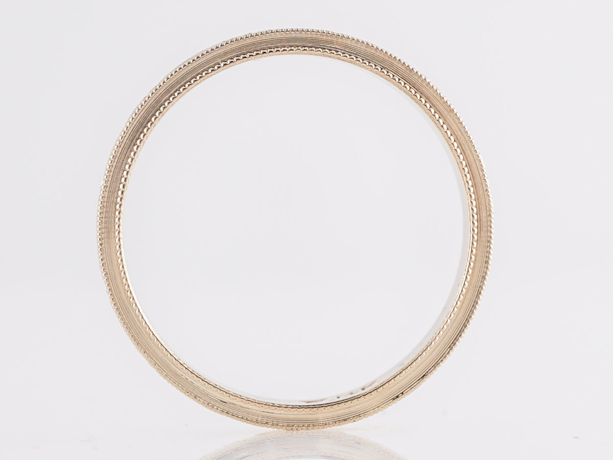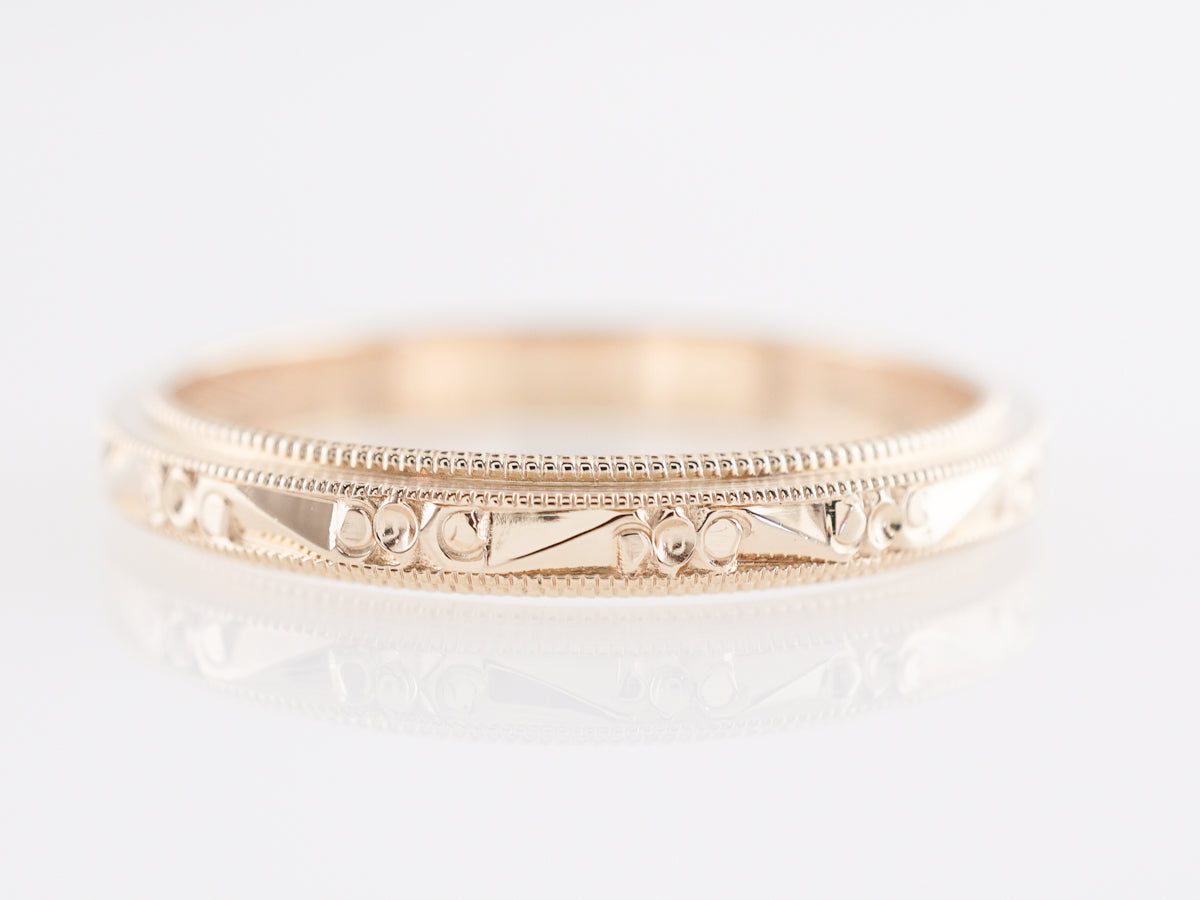 Art Deco Double Milgrain Band in 14k Yellow Gold. This fine antique wedding band is beautifully engraved and finished in highly polished 14 karat yellow gold. Featuring a double border of milgrain detail with delicate engravings scrolling in the center of the band. Complete with a bright polish, this rare Art Deco band in yellow gold looks as fresh as the day it was made.