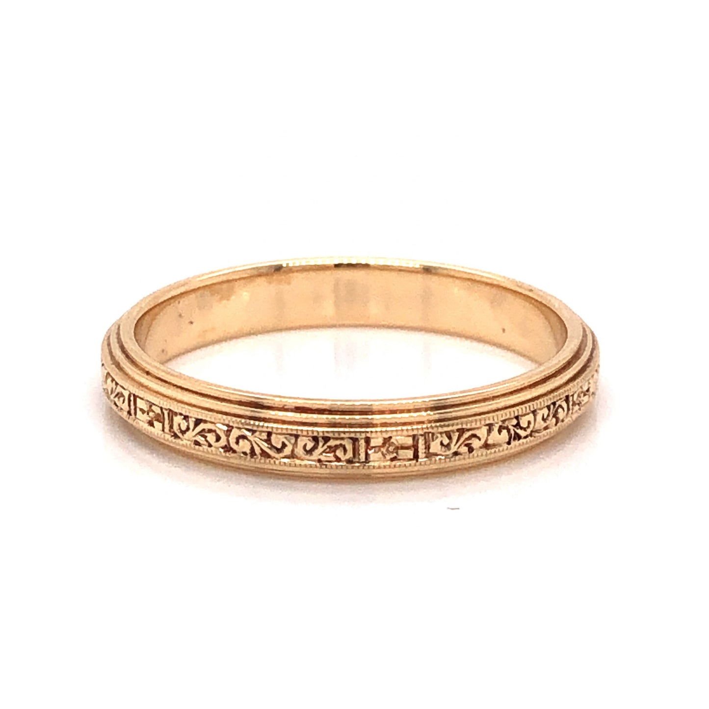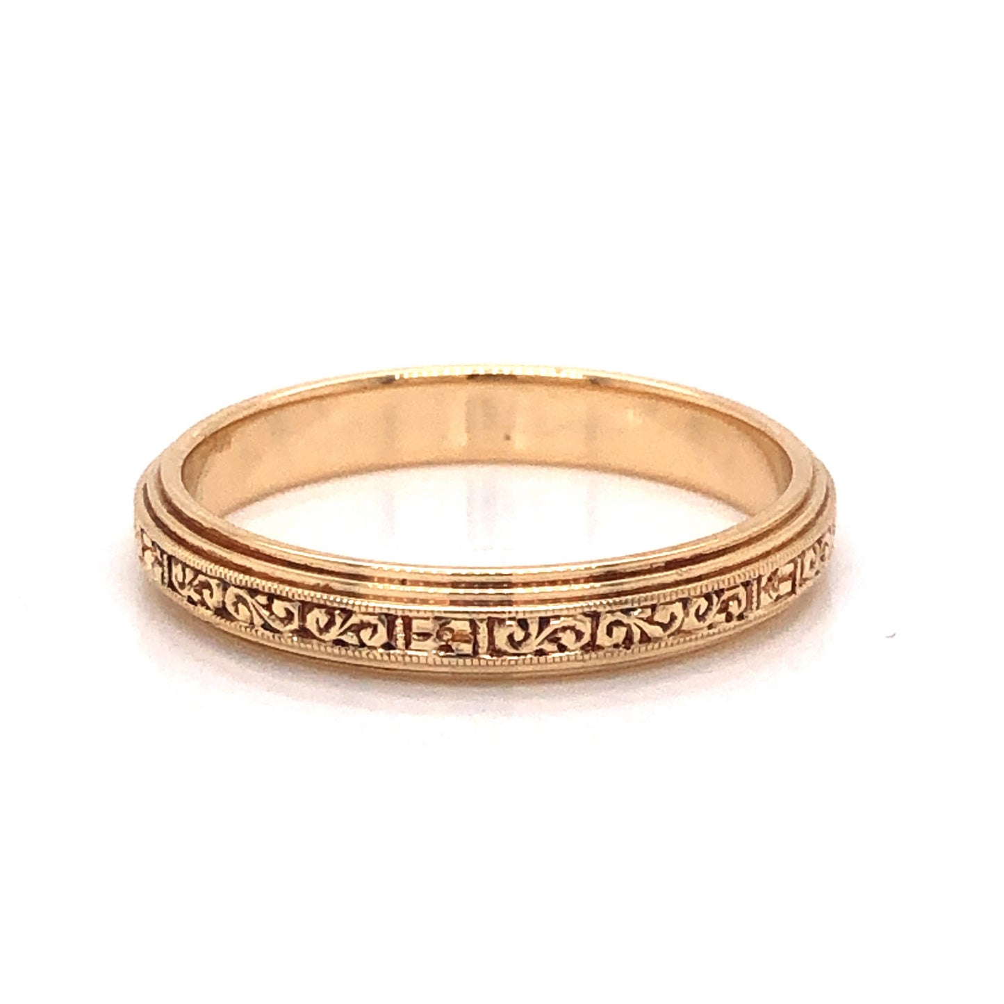 Art Deco Filigree Engraved Wedding Band in 14k Yellow Gold. This chic Art Deco wedding band features swirling engravings finished in polished 14 karat yellow gold. The band measures 2.99mm wide and has a flat profile. Ornate, vintage patterns are engraved on the center of the band with a milgrain style trim. A small inscription of “14K” is stamped on the inside of the shank, ensuring that it is 14 karat yellow gold.